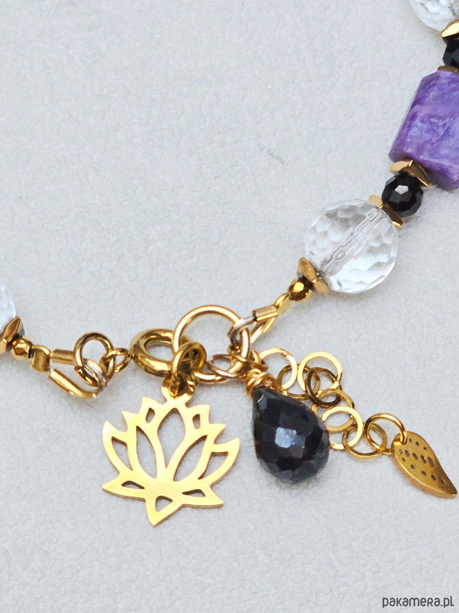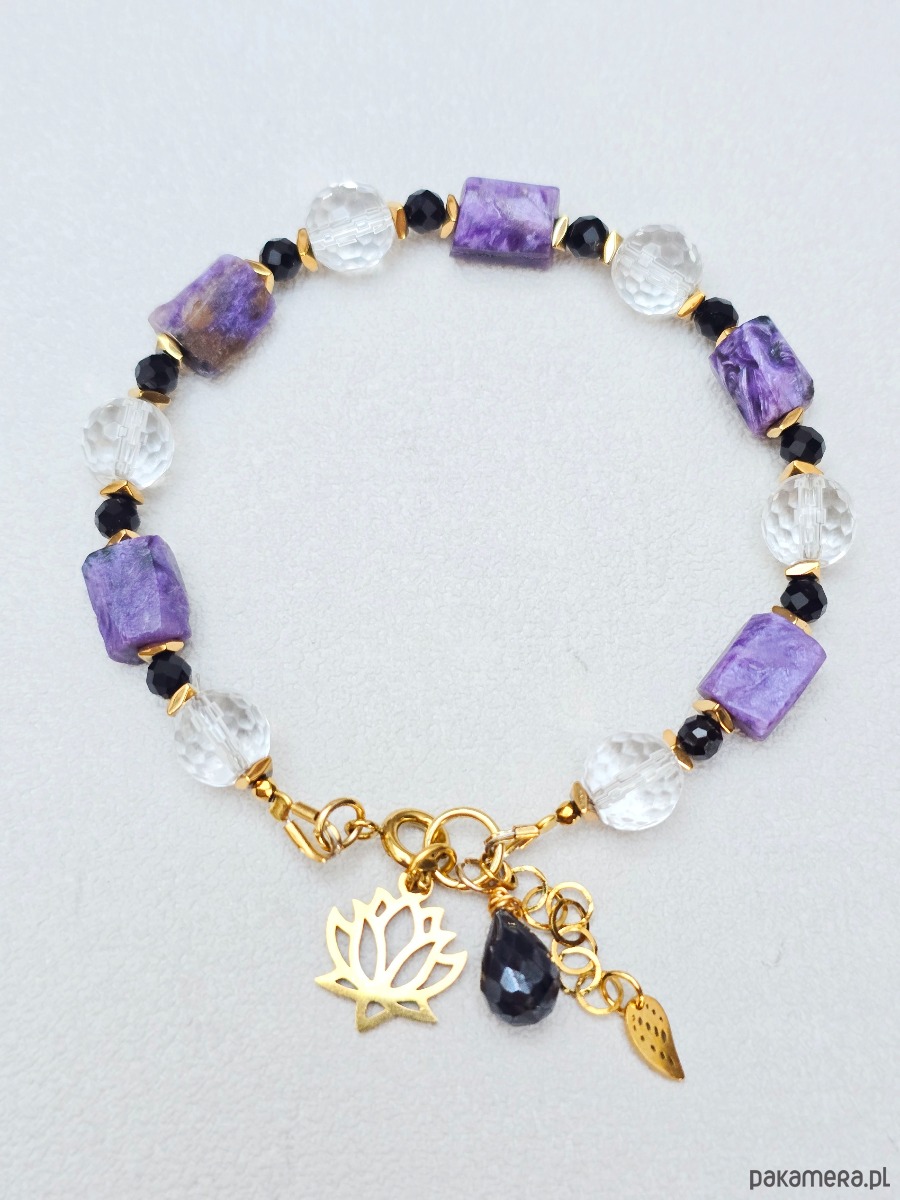 Bransoletka z zawieszkami, wykonana z kamieni naturalnych tj.: czaroit, kryształ górski, spinel i złocony hematyt.
