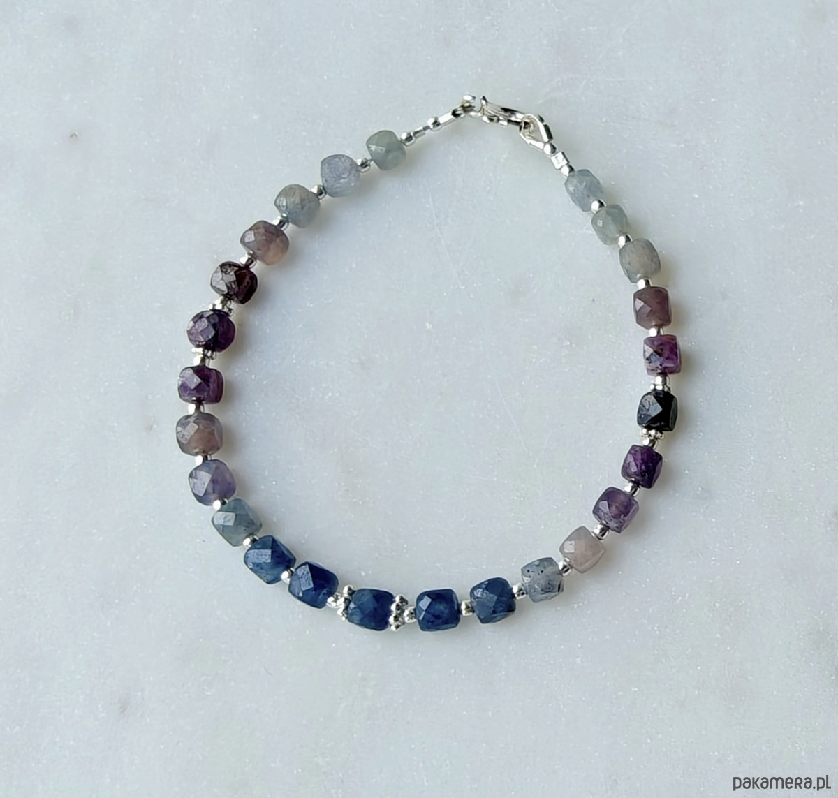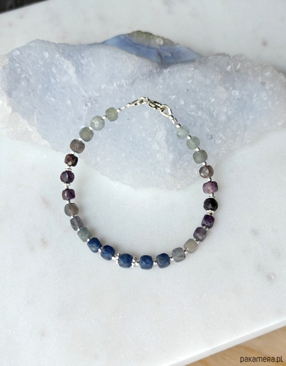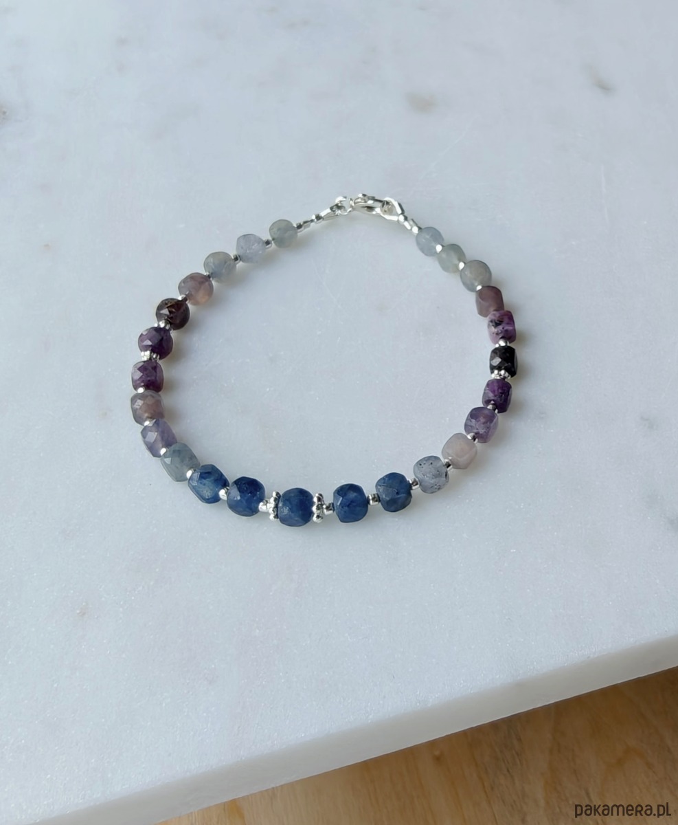 Delikatna, elegancja bransoletka z wielokolorowych szafirów. Kamienie zostały ułożone stopniowo wg odcieni. Są one częściowo transparentne, a dzięki rozdzieleniu srebrnymi dodatkami można podziwiać światło przenikające przez każdą kosteczkę.