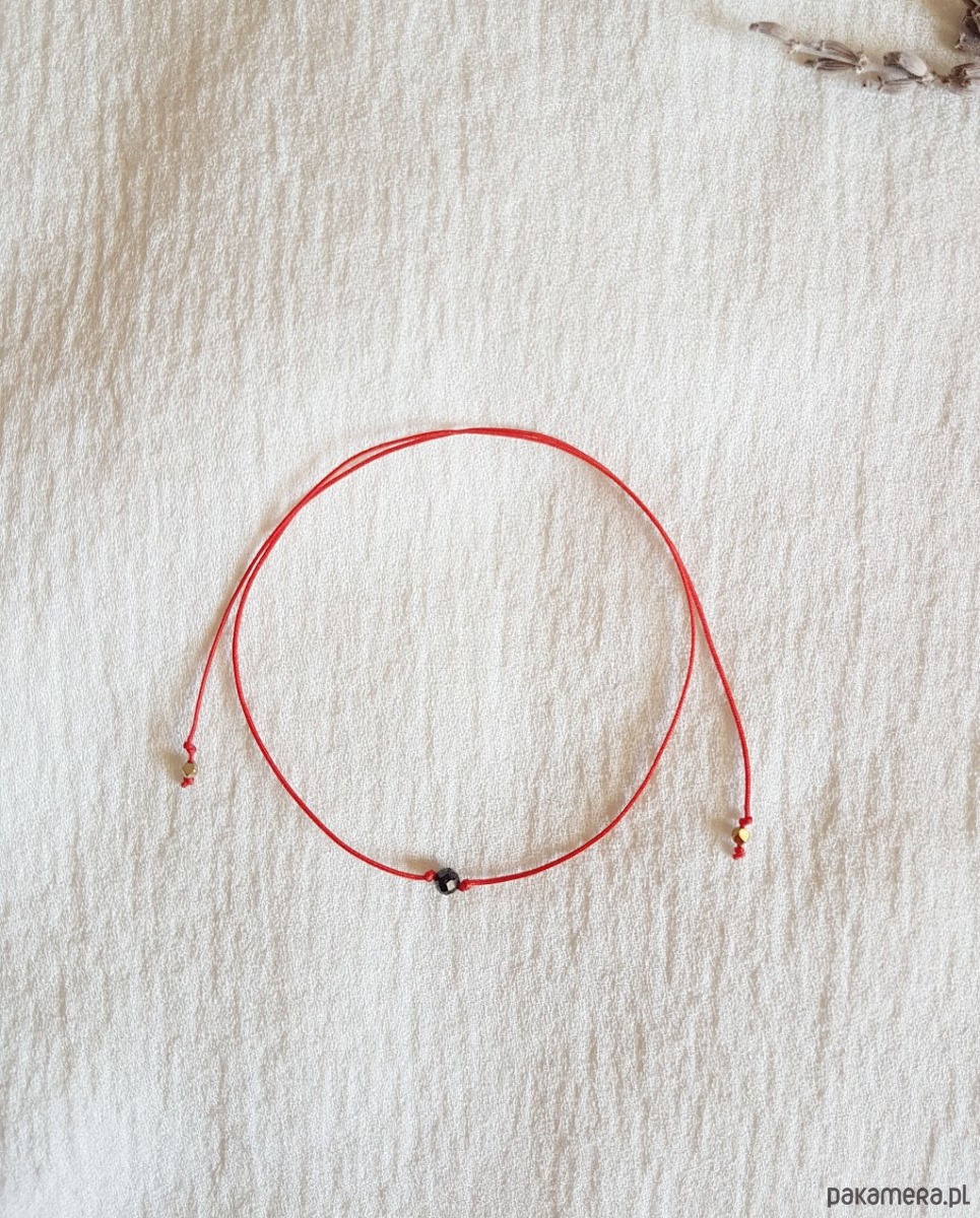 Bransoletka wykonana jest z wysokiej jakości nylonowego sznureczka w kolorze czerwonym oraz ochronnego Czarnego Turmalinu (3,5mm), na końcach hematyty w kolorze złotym.