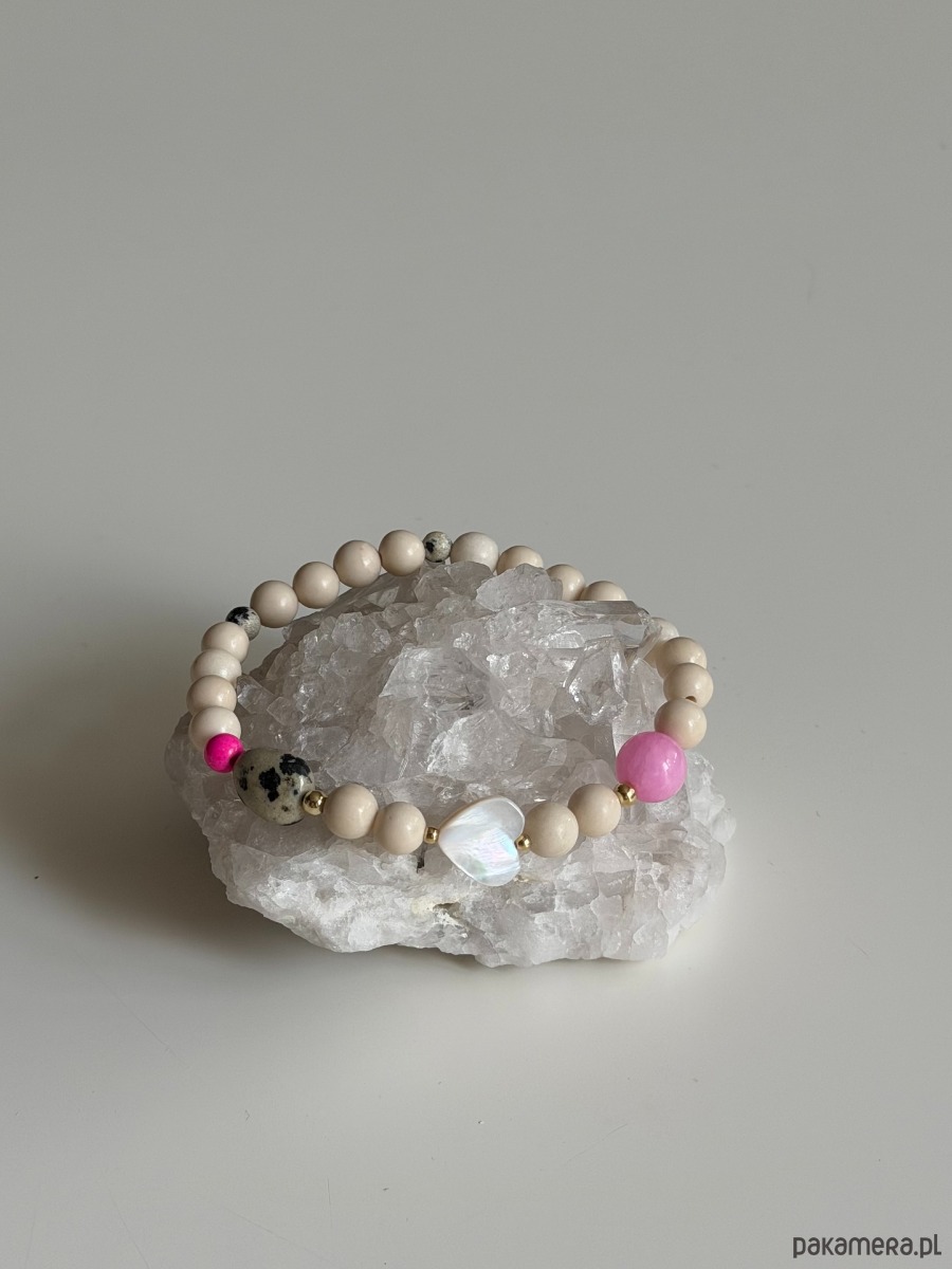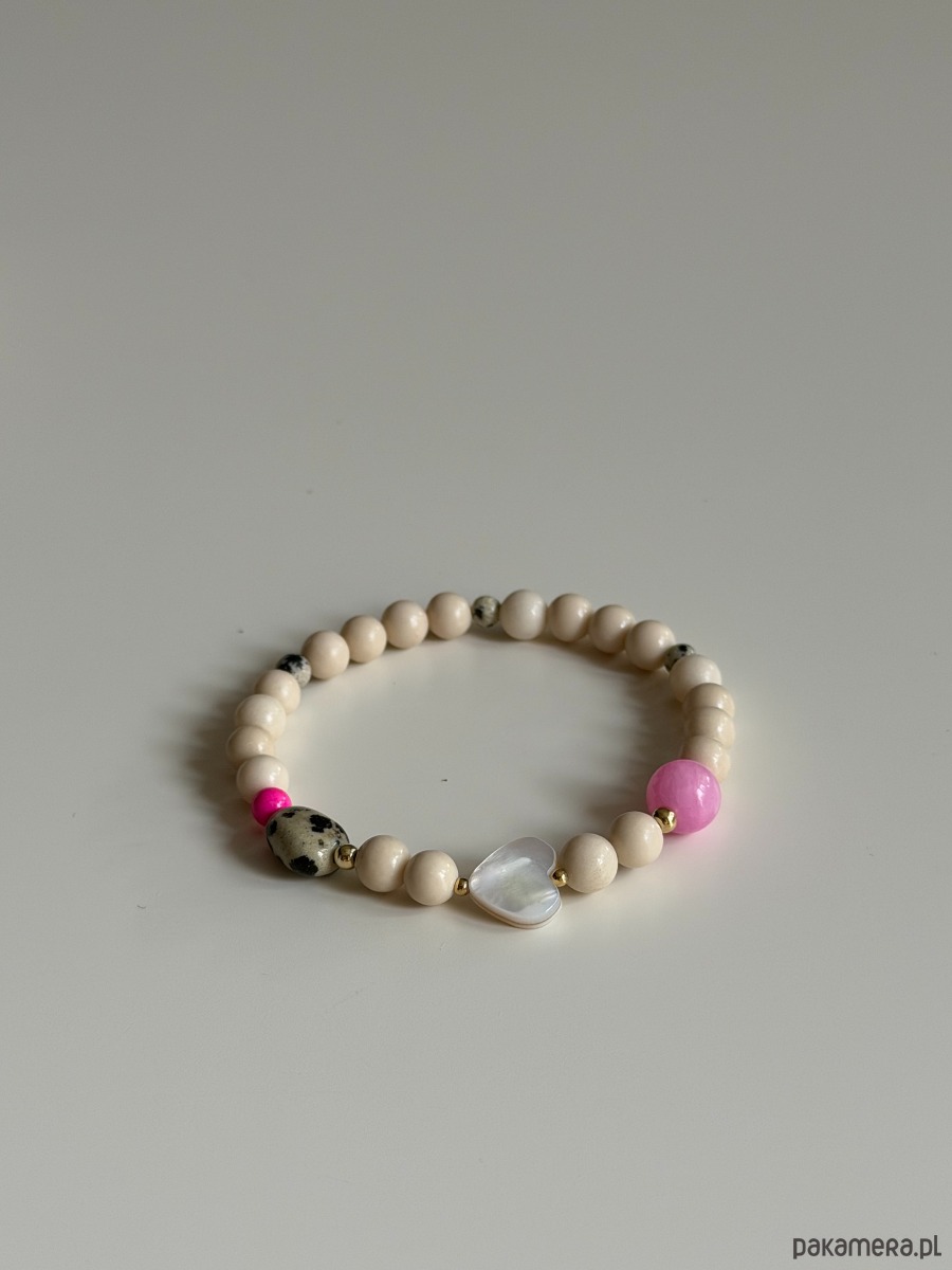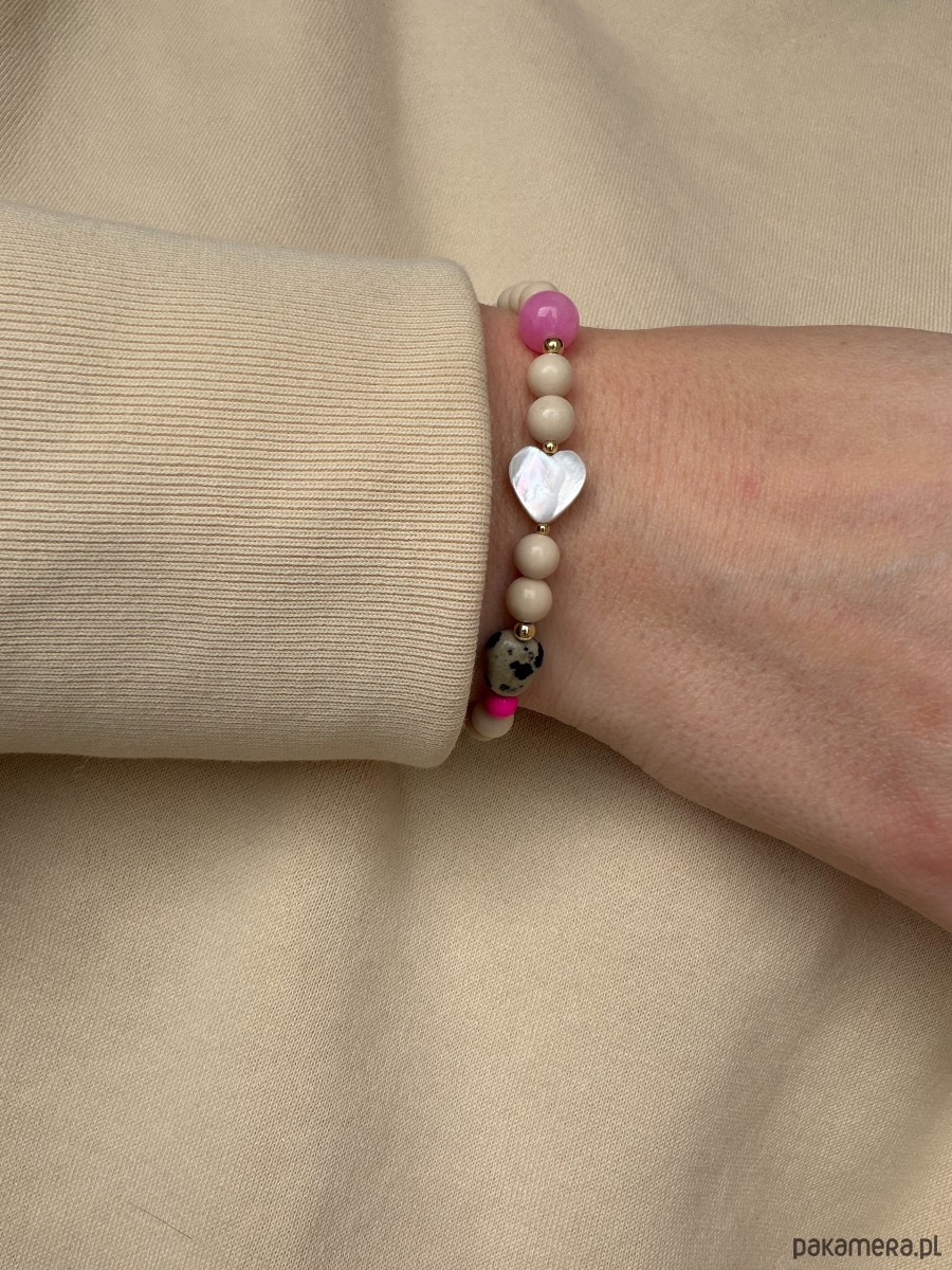 Jest zrobiony z jaspisu, jadeitu, i hematytu, okalających serce z masy perłowej. Kamienie nawleczone są na gumkę lub linkę jubilerską z zapięciem (do wyboru).