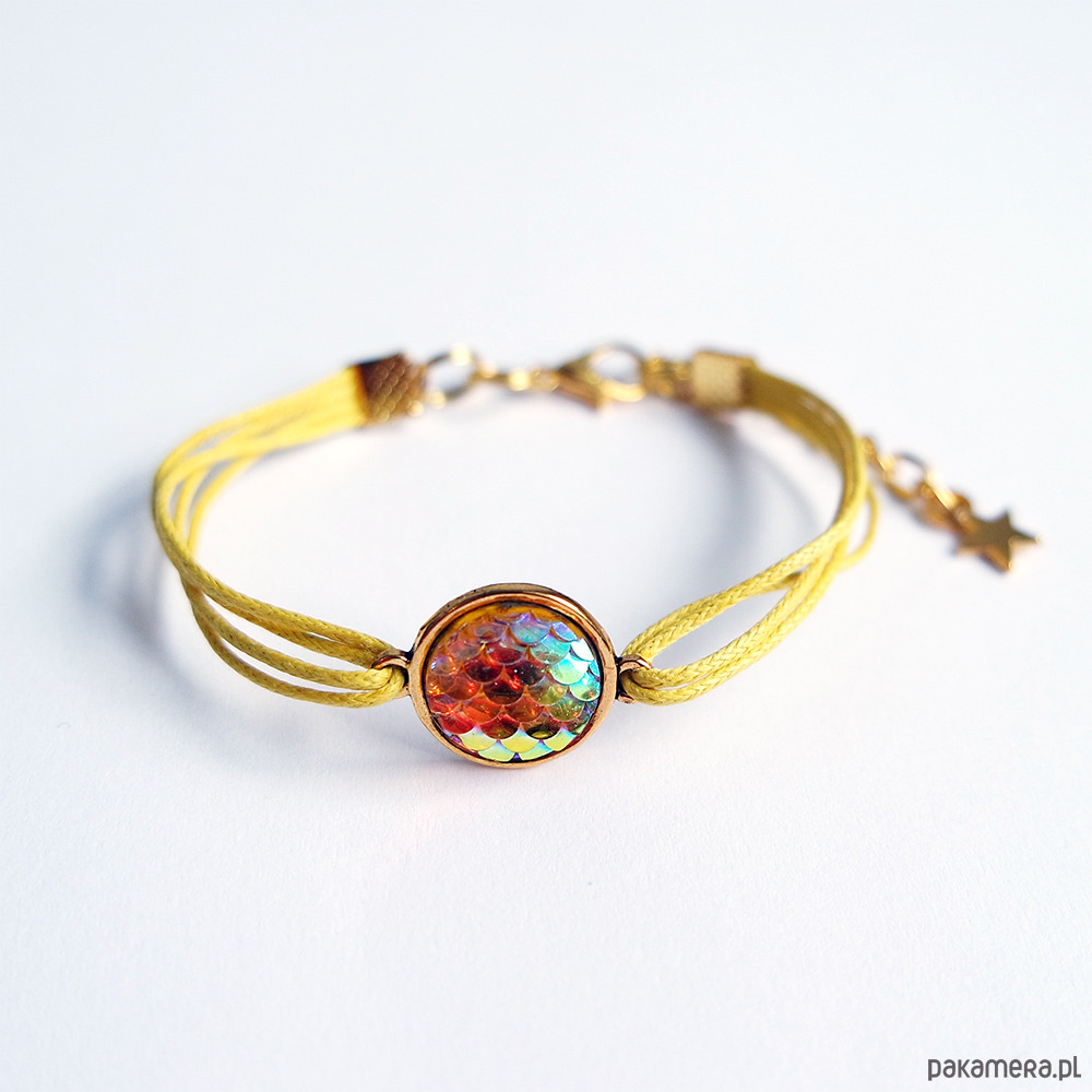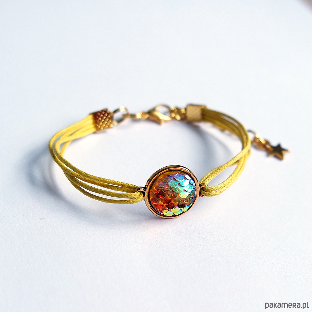 Niezwykła, subtelna bransoletka z kaboszonem z żywicy - łuski, mieniący się w odcieniu złotym.