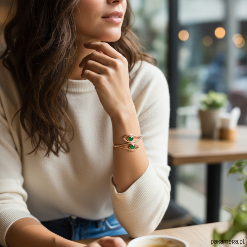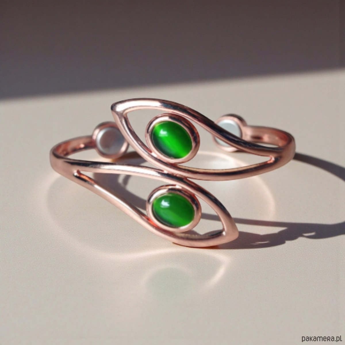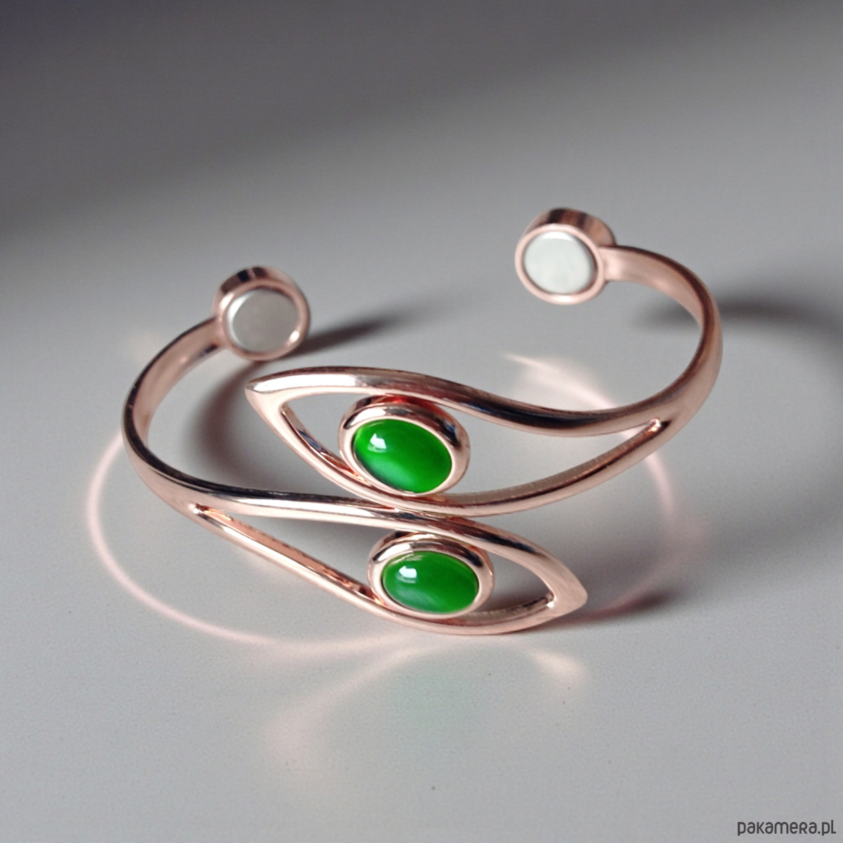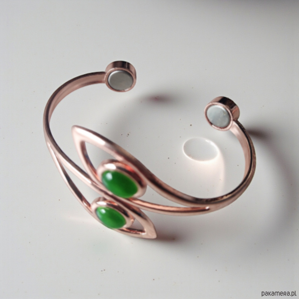 Unikatowa otwarta bransoletka magnetyczna w kolorze miedzianym z podwójnym jadeitem. Bransoletka jest regulowana, pasować będzie więc na każdy rozmiar nadgarstka.