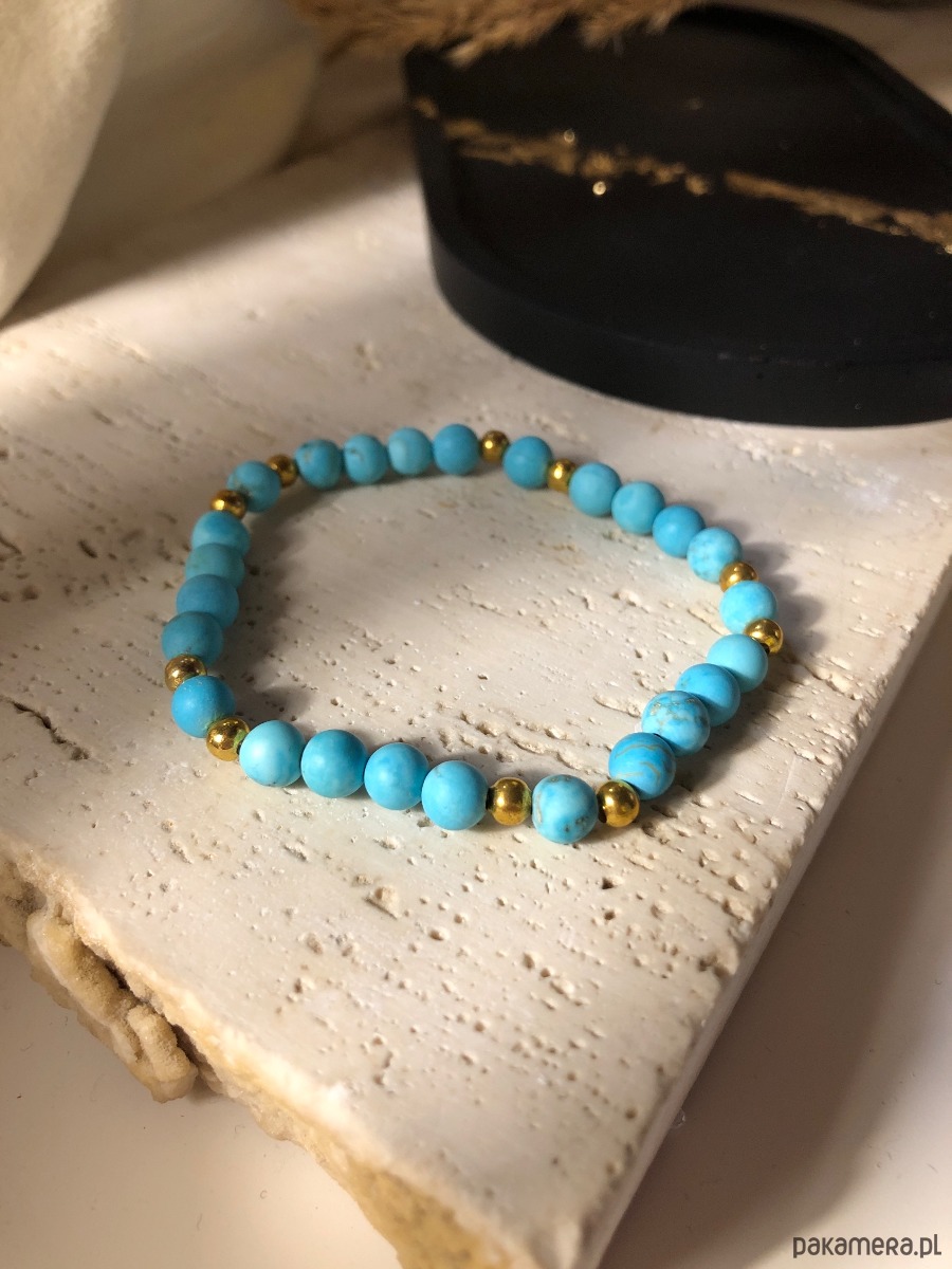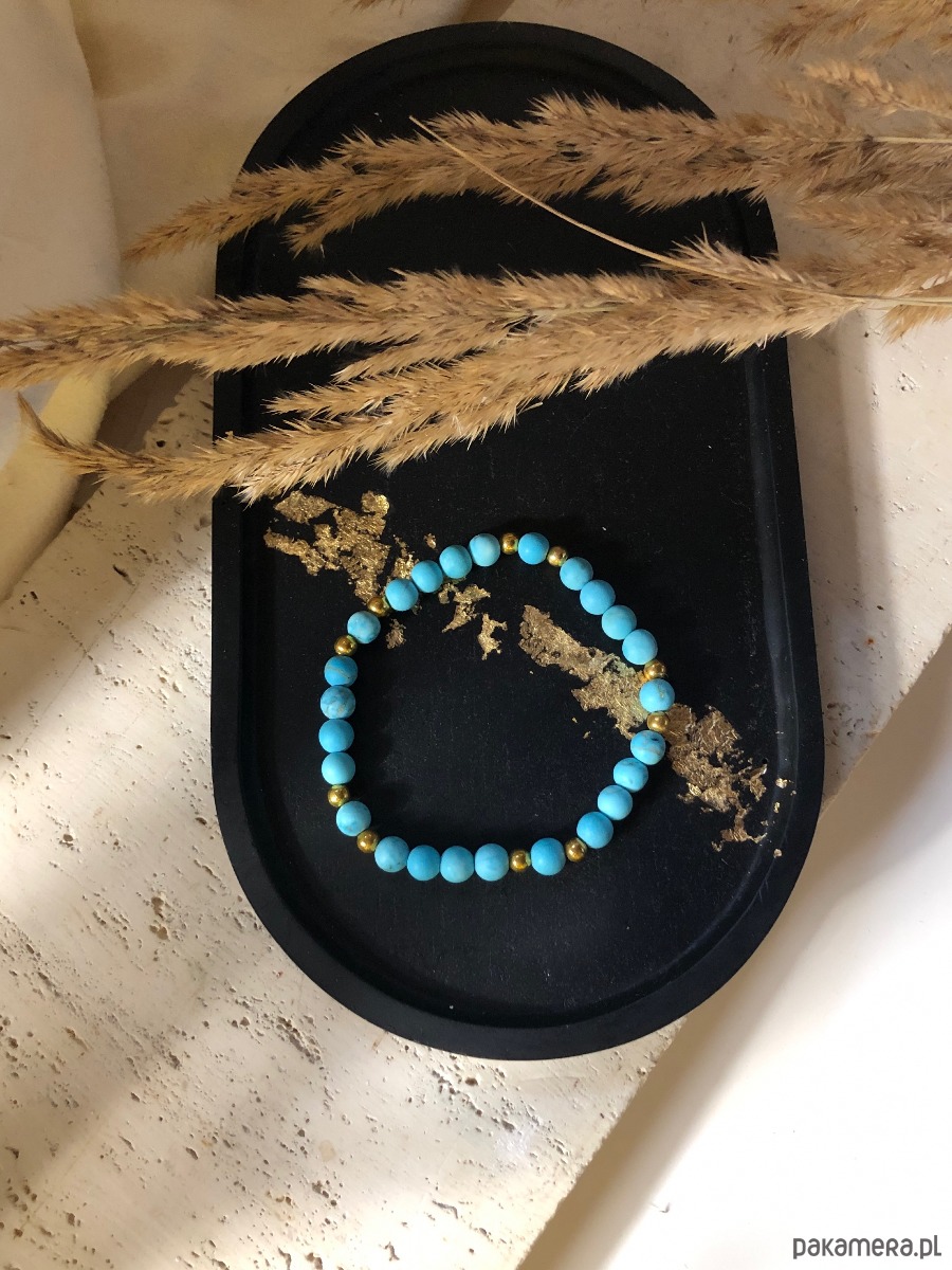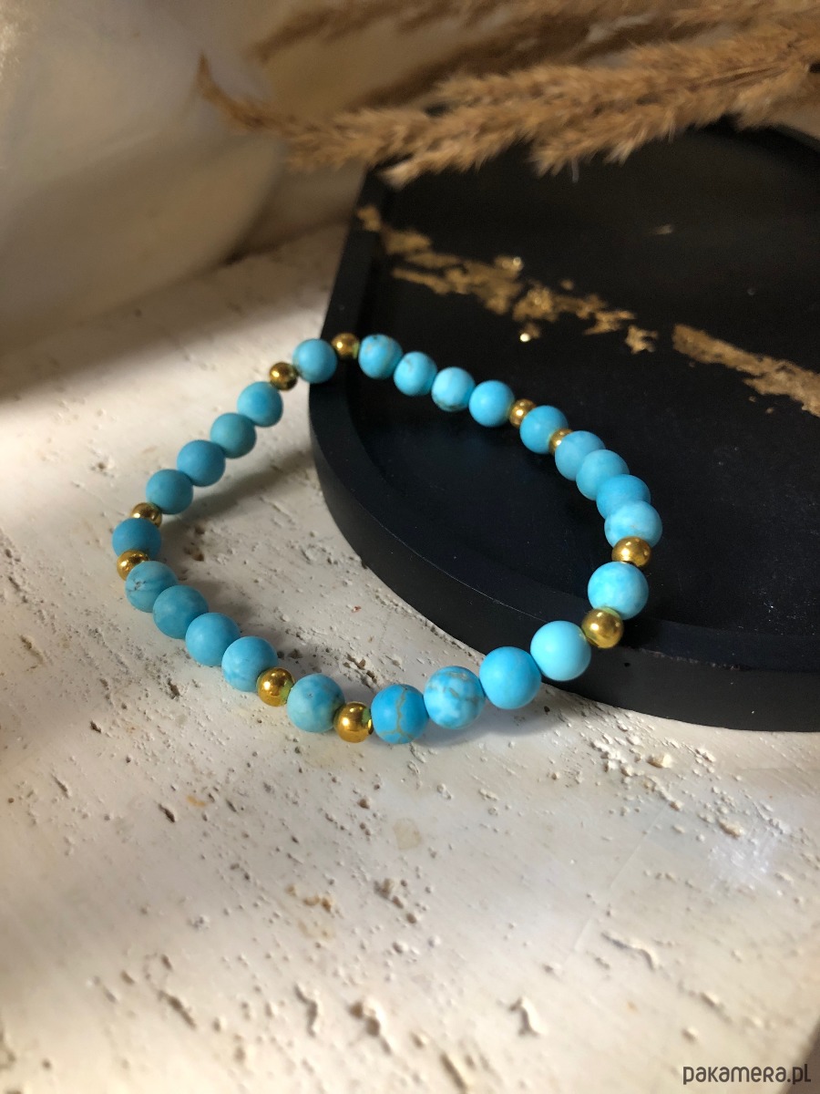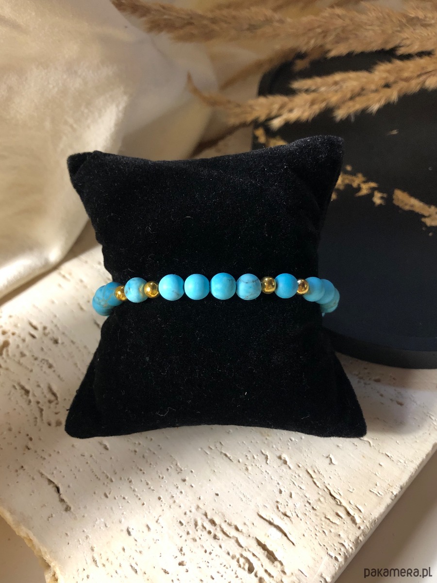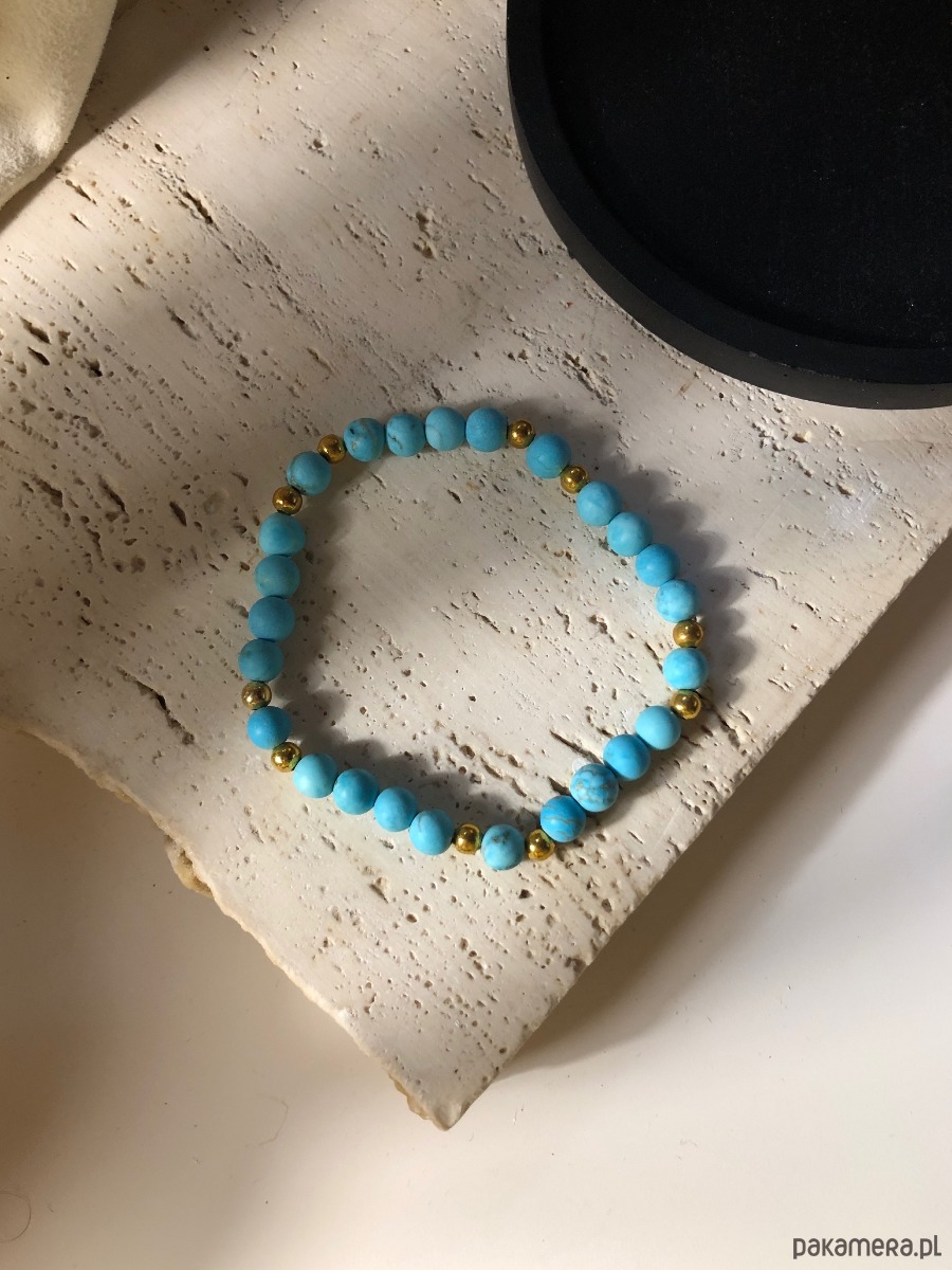 Bransoletka wykonana z naturalnych kamieni. Na gumkę jubilerską nawleczono kamienie magnezytu o średnicy 6 mm oraz koraliki średnicy 4 mm.