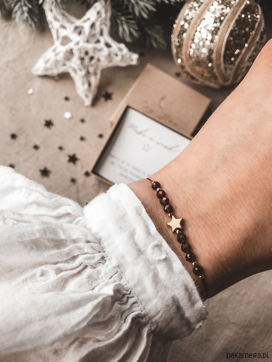 Bransoletka wykonana na jedwabnej nici z granatu, gwiazdki z hematytu oraz srebrnych koralików próby 925 pozłacanych 24K złotem. Piękny bordowy kolor granatu to propozycja eleganckiej i ponadczasowej biżuterii.