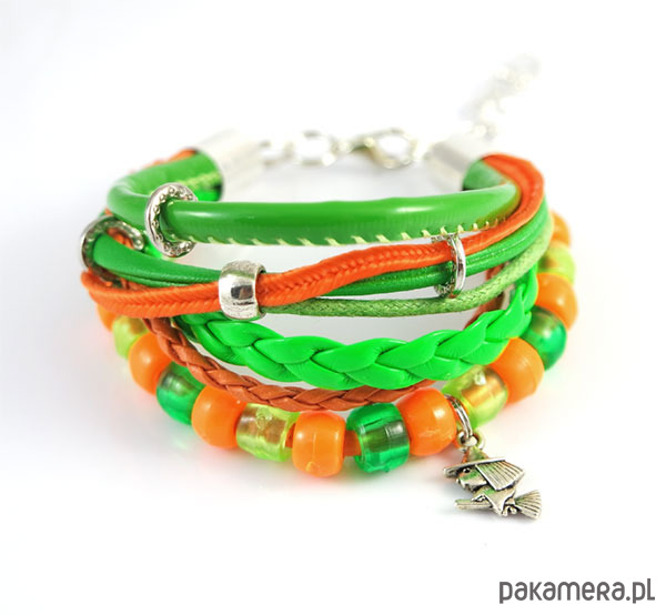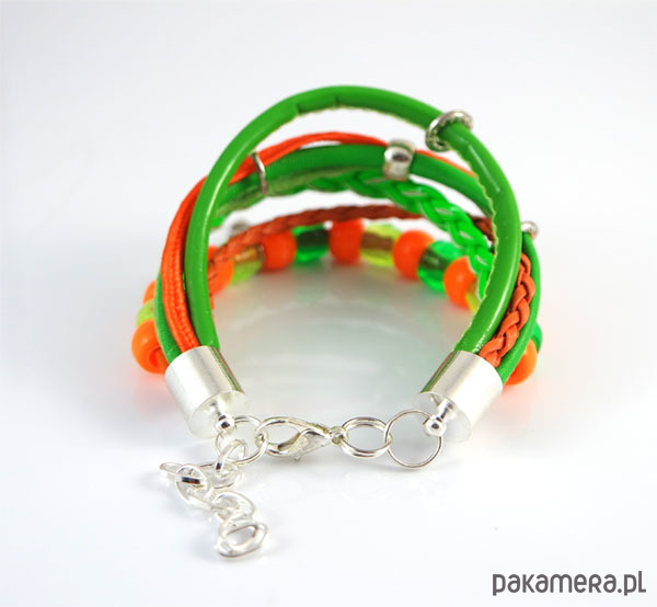 Bransoletka zrobiona jest z rzemieni ze skóry ekologicznej, naturalnej, sznurków i plastikowych koralików.