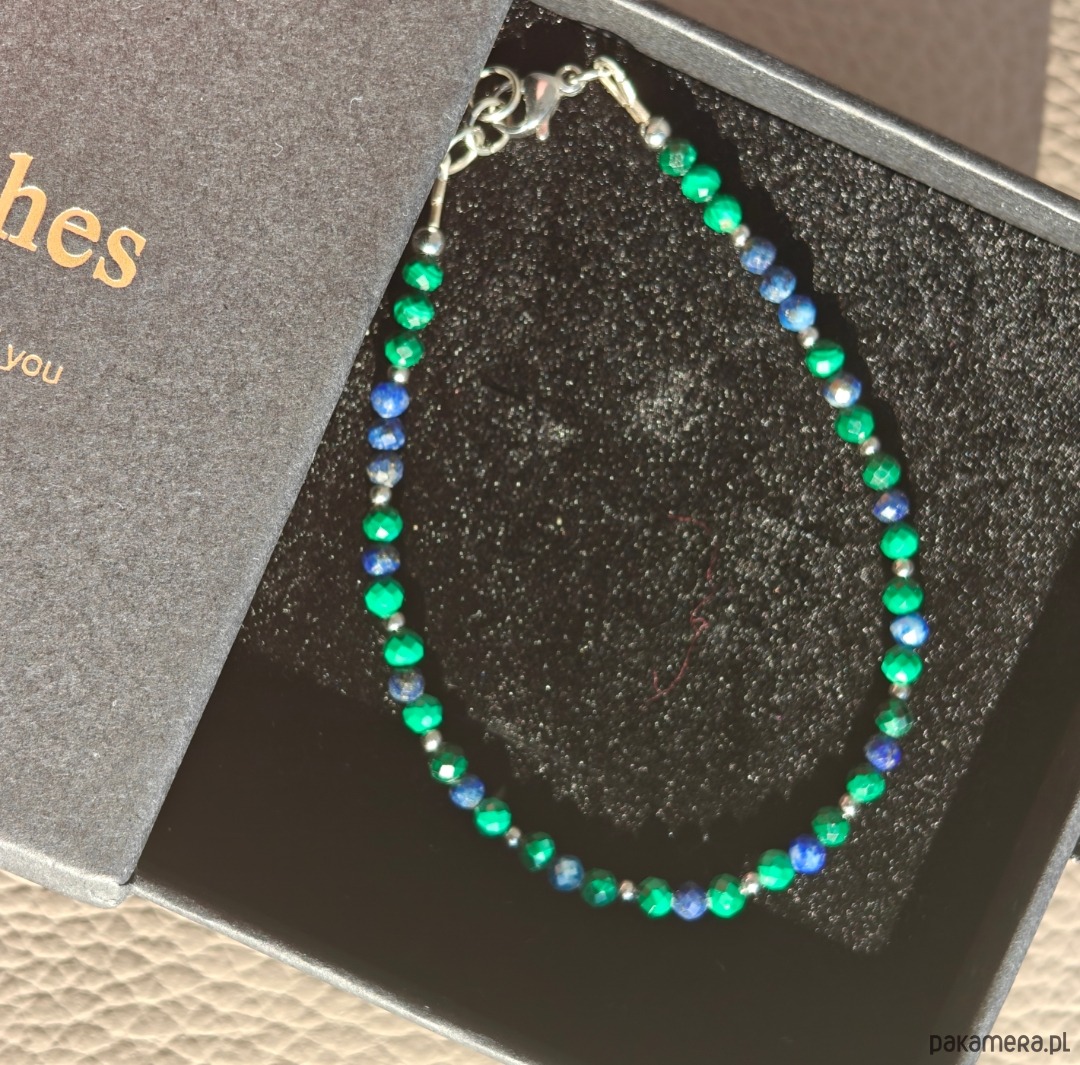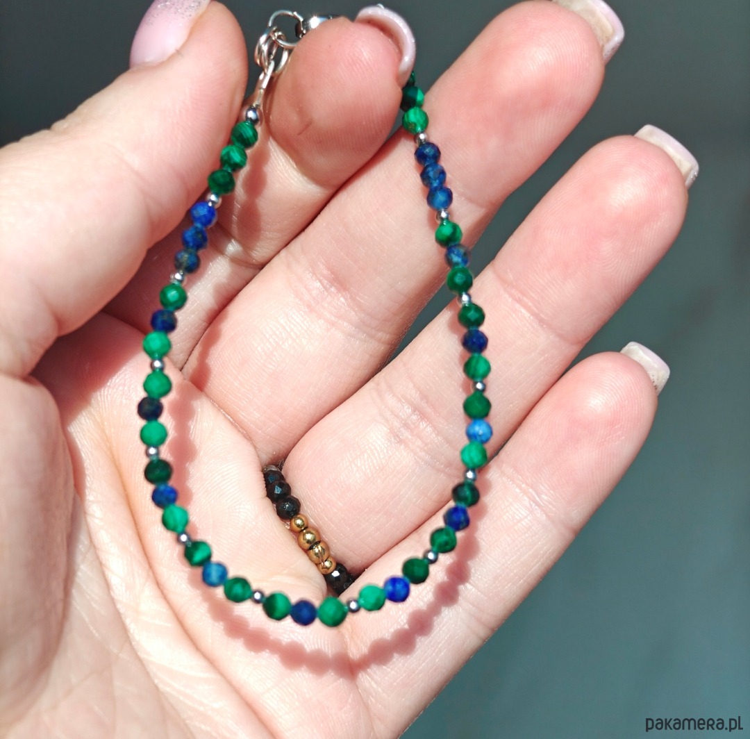 Bransoletka o długości 18 cm z dodatkową regulacją 1 cm, wykonana z naturalnych kamieni: malachitu oraz sodalitu. Całość uzupełniają przekładki ze stali chirurgicznej oraz drobne elementy ze srebra pozłacanego, które nadają biżuterii elegancki i subtelny charakter. Delikatna, a jednocześnie wyrazista kompozycja doskonale sprawdzi się zarówno na co dzień, jak i na wyjątkowe okazje.