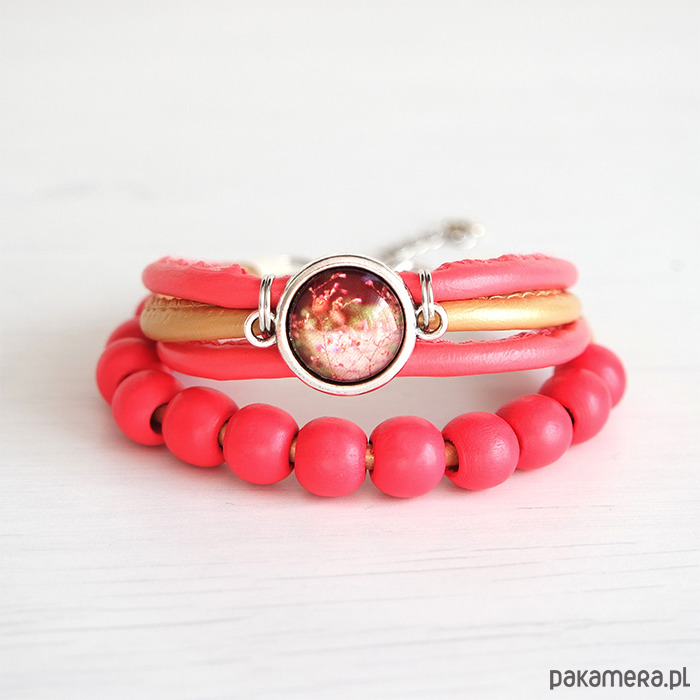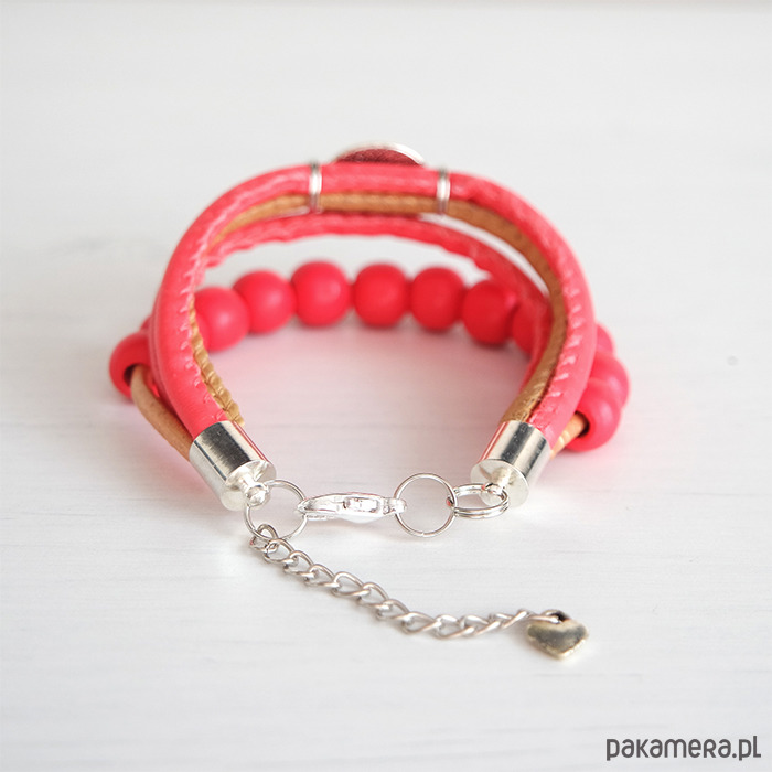 Bransoletka wykonana jest z rzemieni z eko-skóry i skóry naturalnej oraz drewnianych koralików.