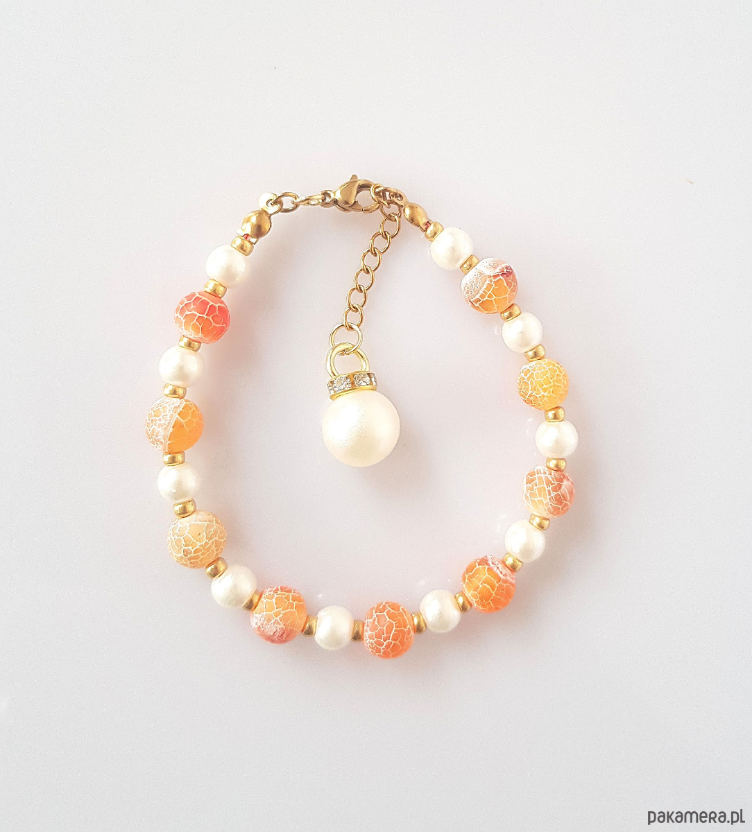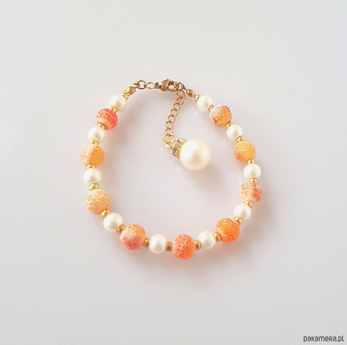 Kulki agatu trawionego w kolorze mandarynki i białe perełki muszlowe.