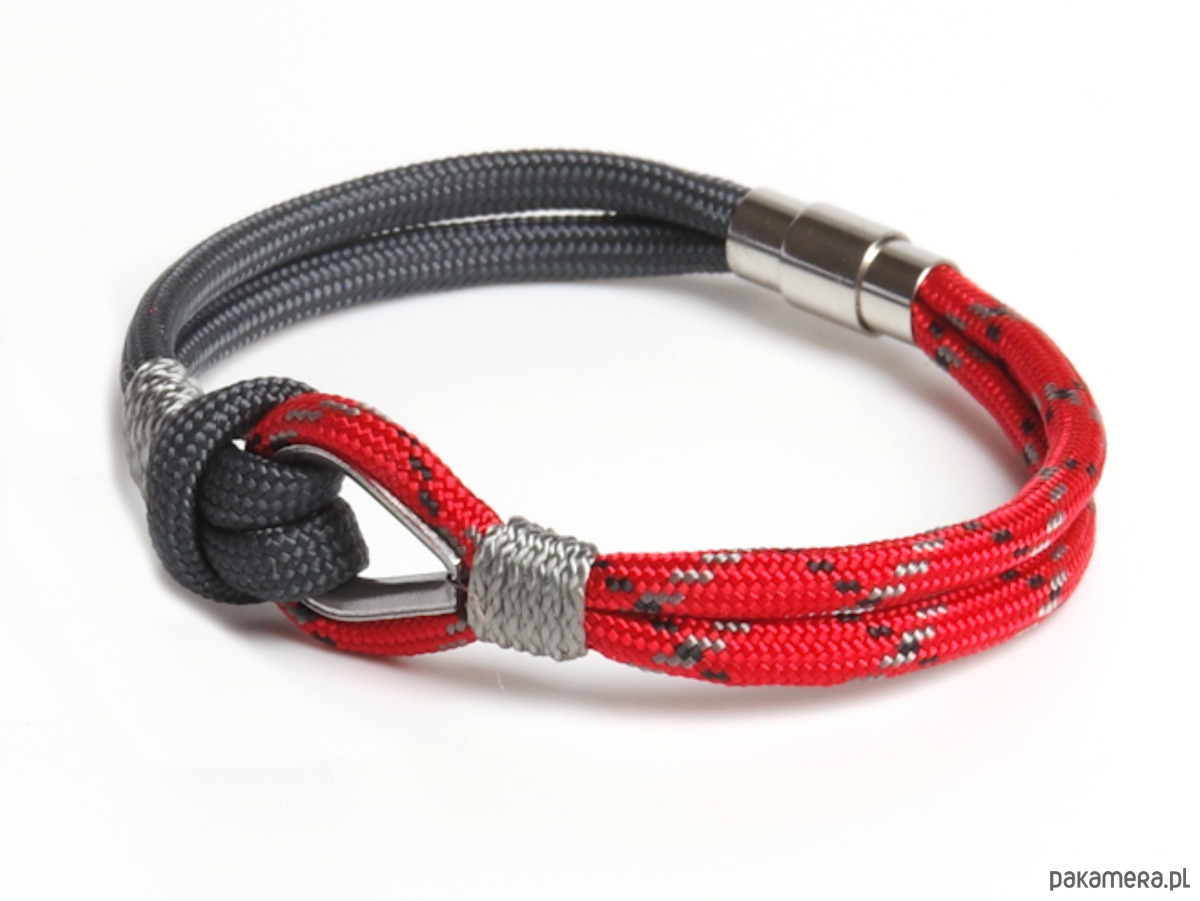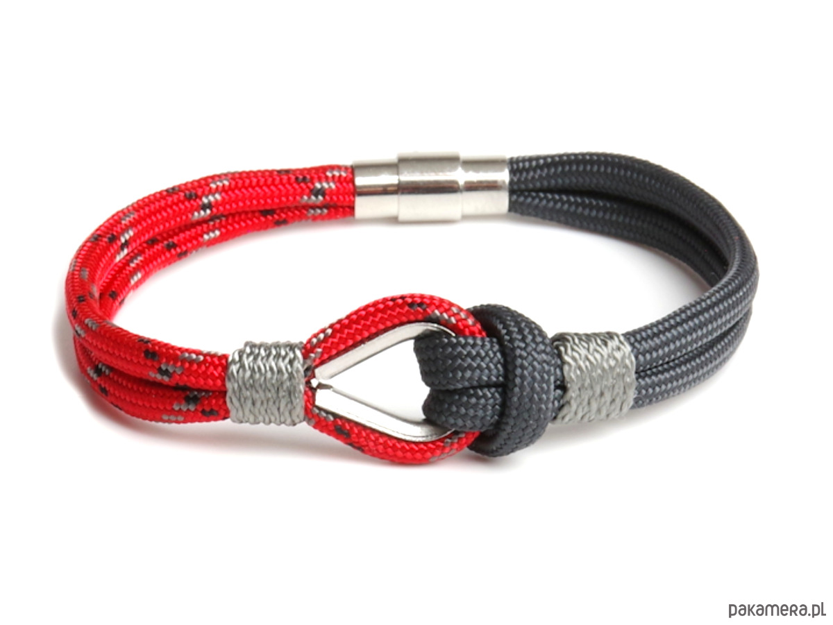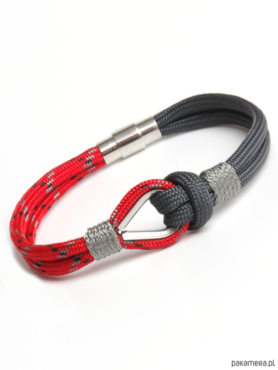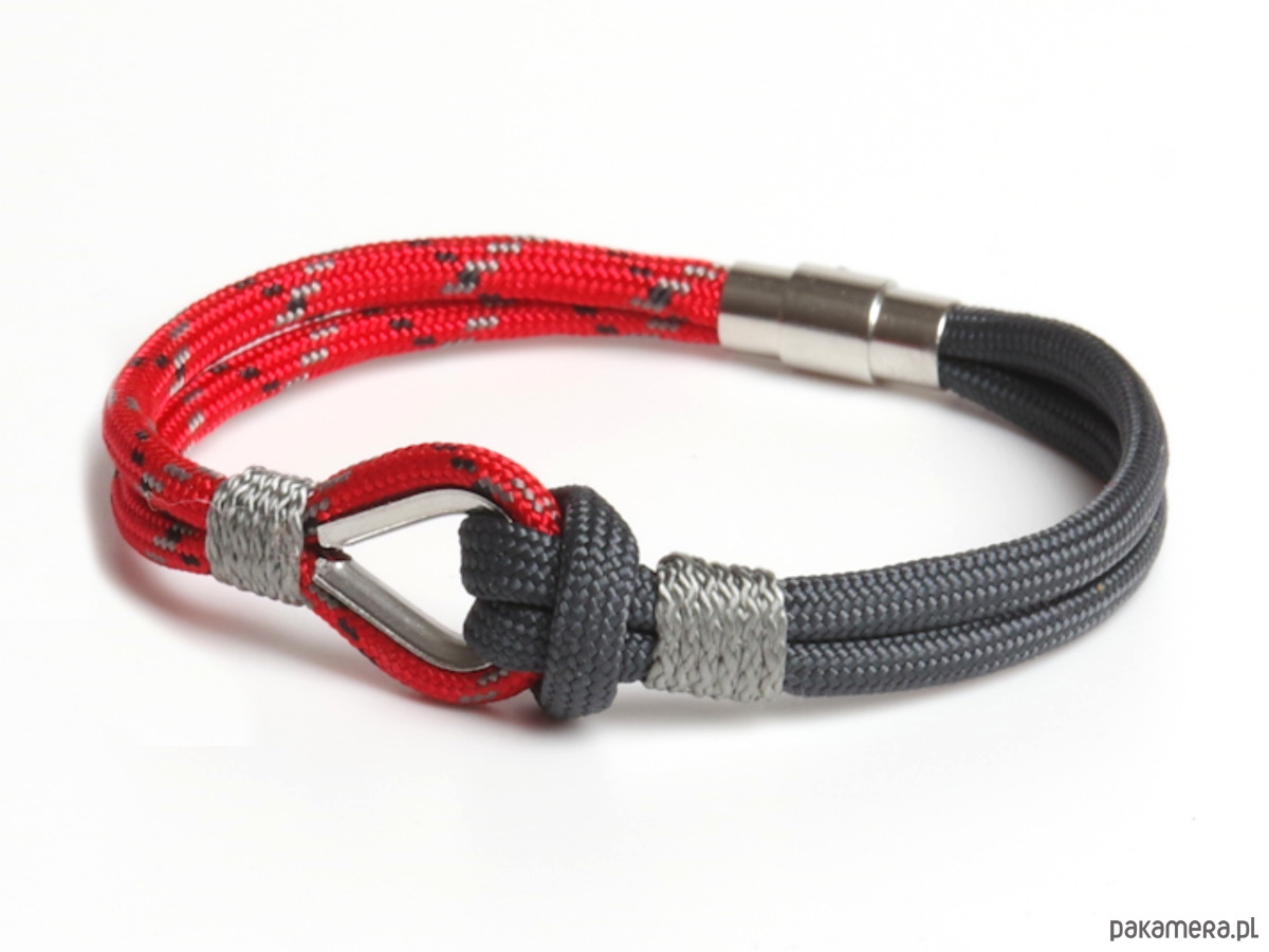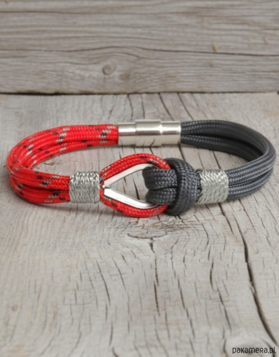 Stylowa bransoletka w marynistycznym klimacie, wykonana z wytrzymałego linki paracord w odcieniach czerwonego i grafitowego. Centralnym elementem jest stalowa kausza, przez którą przewleczona jest linka, tworząc charakterystyczny, żeglarski węzeł. Lekka, wygodna i trwała – idealna do codziennych stylizacji. Doskonały dodatek dla miłośników morskich przygód i klasycznego, marynistycznego stylu.