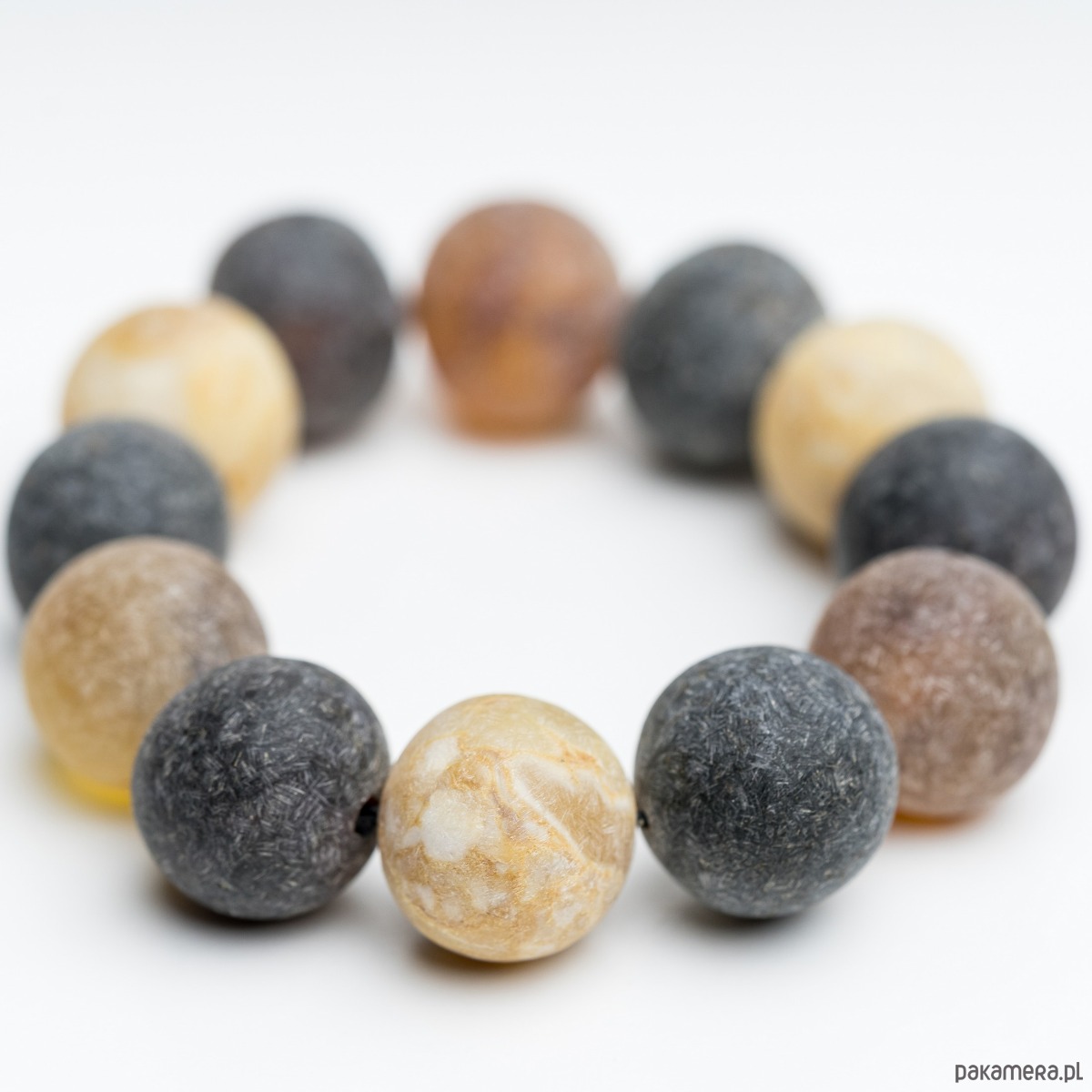 Bransoletka wykonana z regularnych, matowych kul z bursztynu bałtyckiego w kolorze koniakowym, mlecznym i czarnym. Kamienie o surowym, matowym wykończeniu podkreślają naturalną strukturę i niejednolity charakter bursztynu. Model na elastycznej gumce, wygodny w codziennym noszeniu. Minimalistyczna forma i stonowana kolorystyka sprawiają, że pasuje do stylizacji casual i boho.