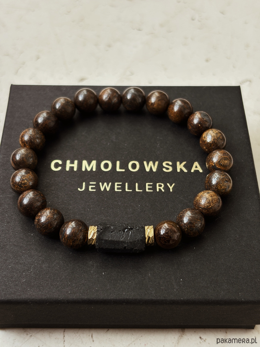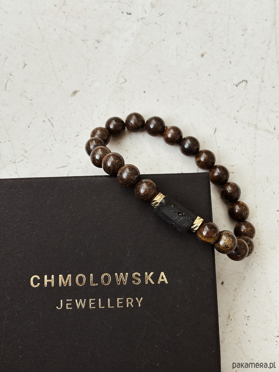 Bransoletka wykonana jest na gumce jubilerskiej z kamieni Bronzytu, Turmalinu i pozłacanych przekładek.