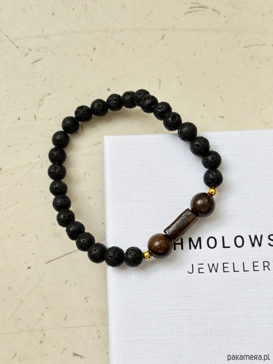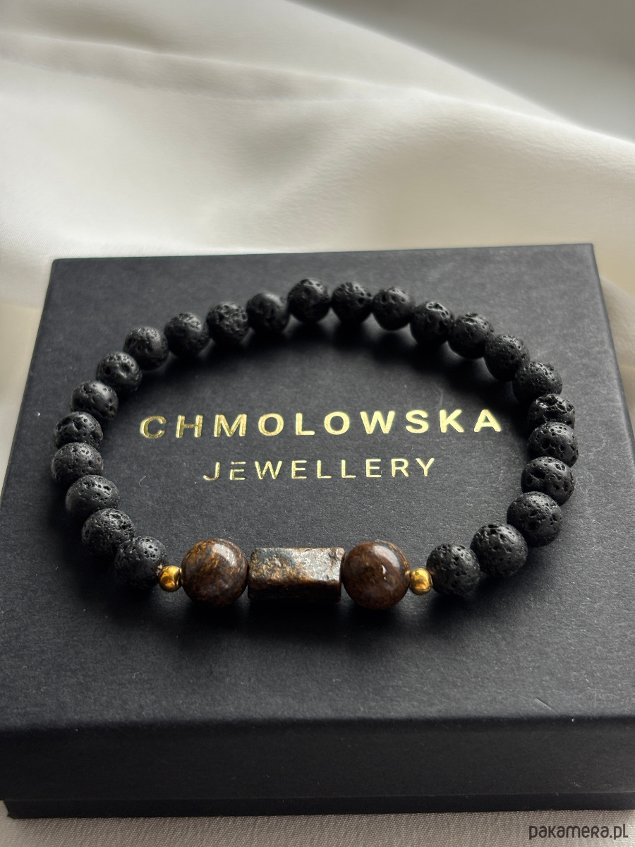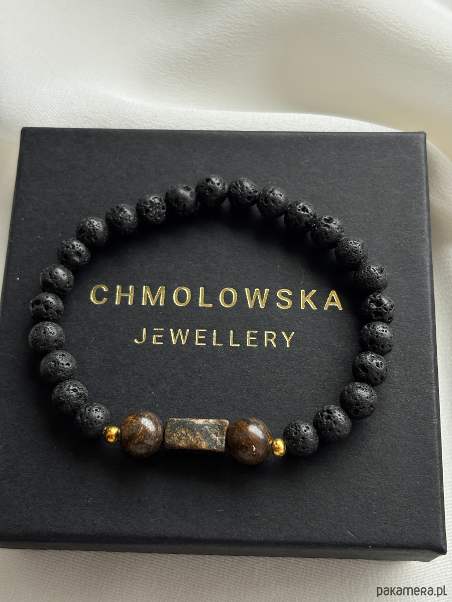 Bransoletka wykonana została z kamieni bronzyt i lawa, a także pozłacanych przekładek.