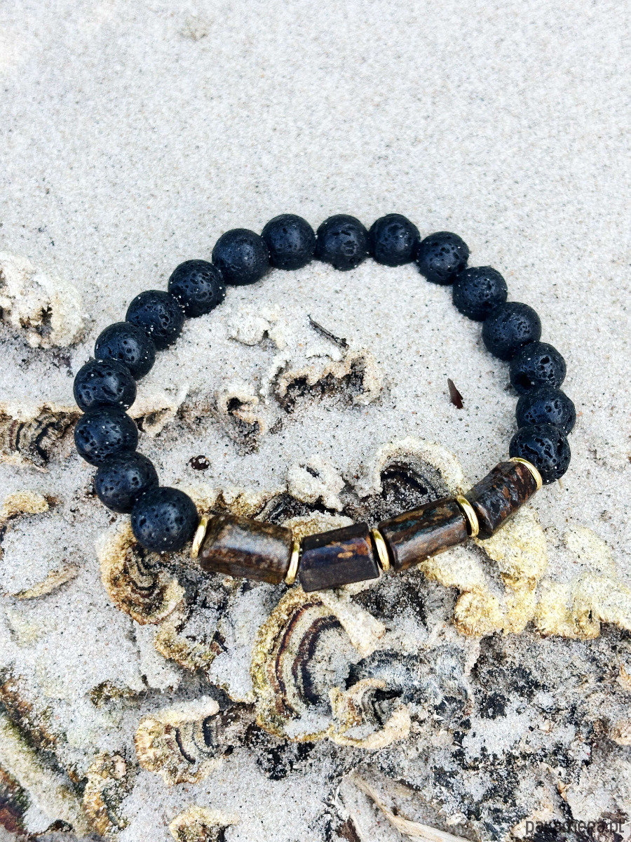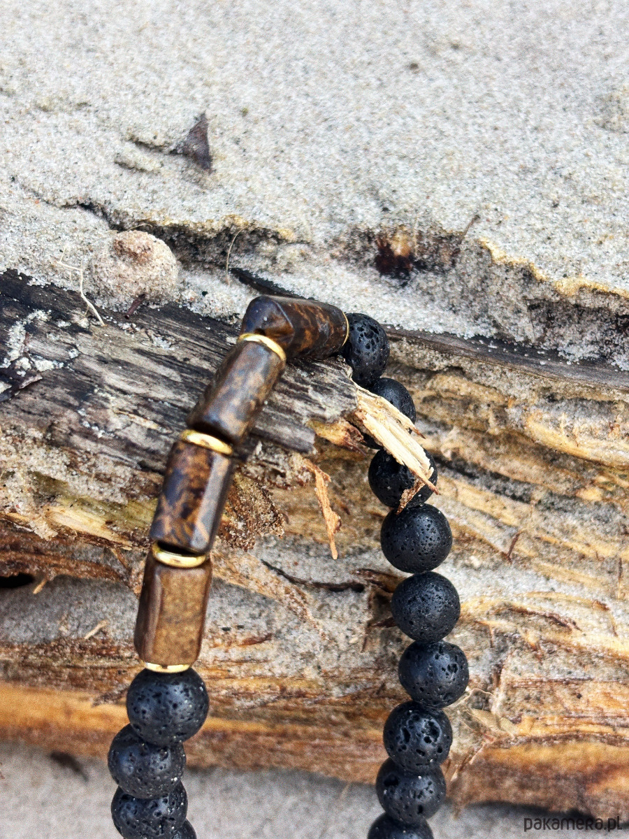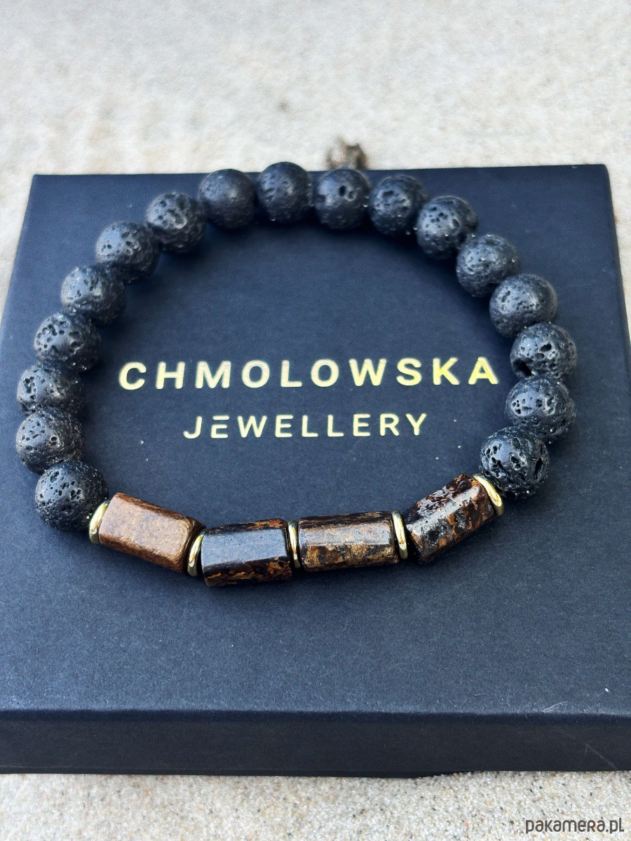 Bransoletka wykonana jest na gumce jubilerskiej z użyciem kamieni bronzyt i lawa, a także pozłacanych przekładek.