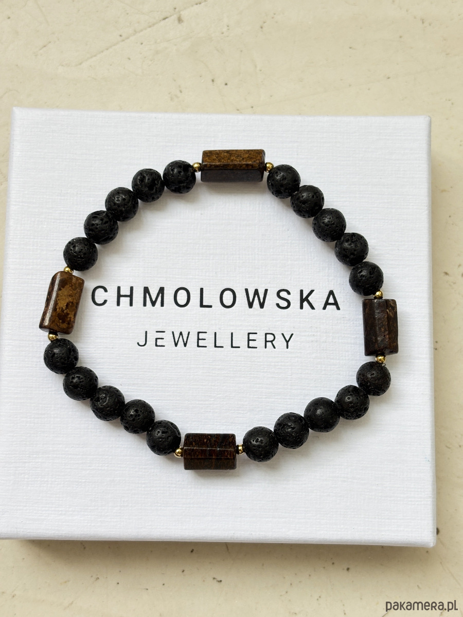 Bransoletka wykonana została z kamieni bronzyt i lawa, a także pozłacanych przekładek.
