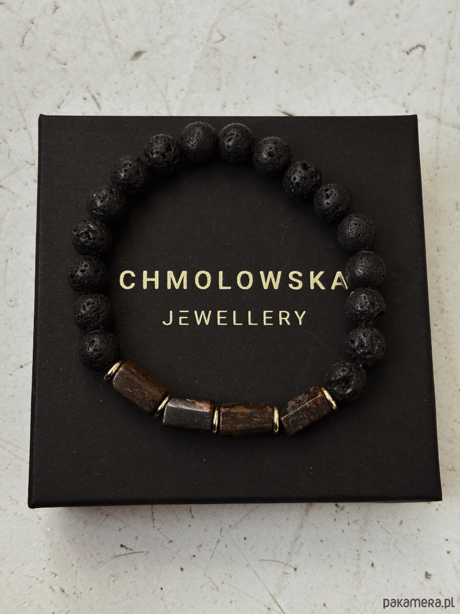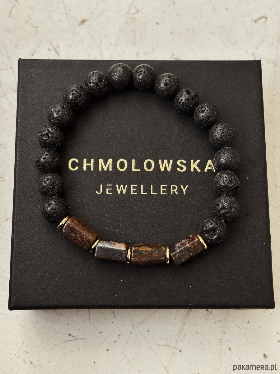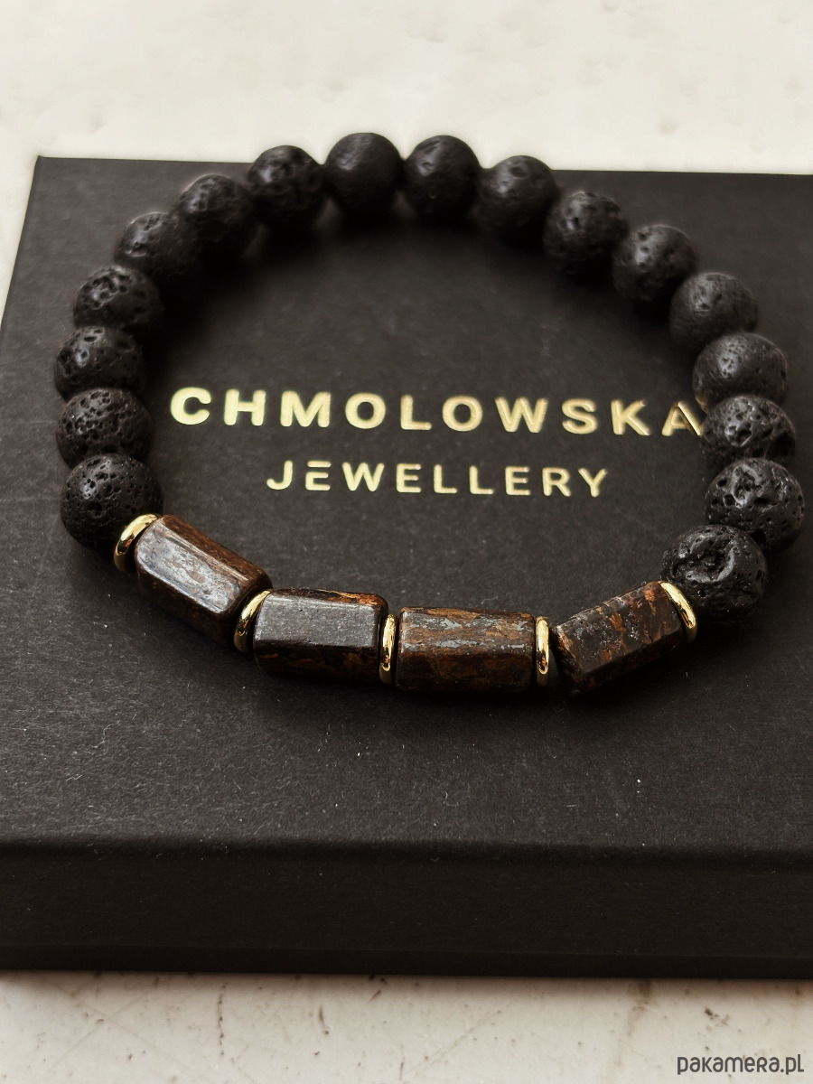 Bransoletka wykonana jest na gumce jubilerskiej z kamieni Bronzytu i Lawy Wulkanicznej, a także pozłacanych przekładek.