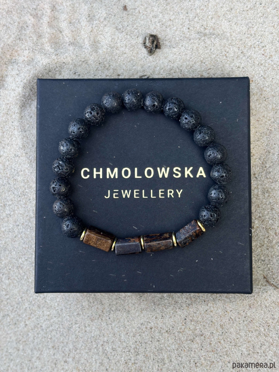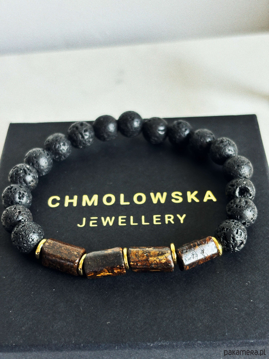 Bransoletka wykonana jest na gumce jubilerskiej z użyciem kamieni bronzyt i lawa, a także pozłacanych przekładek.