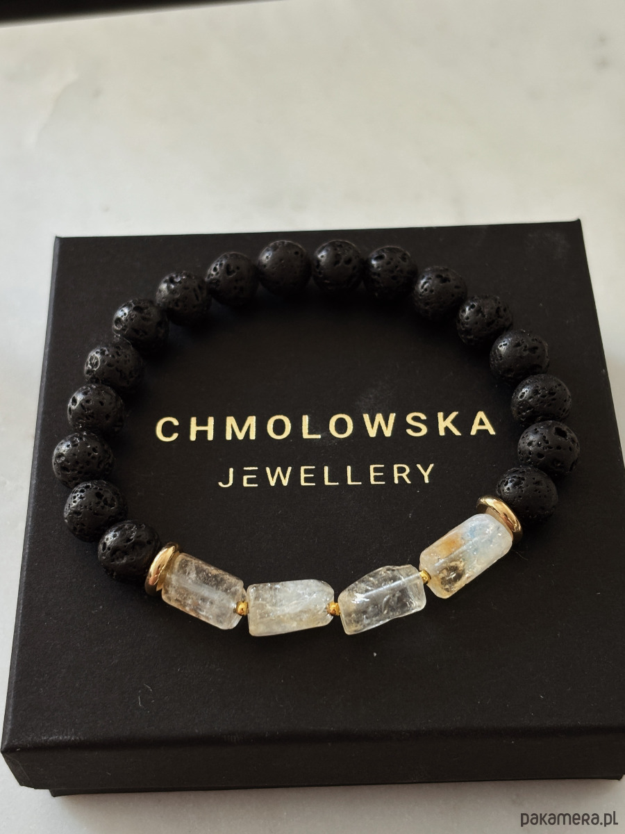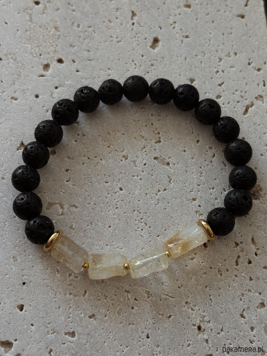 Bransoletka wykonana na gumce elastycznej, z lawą wulkaniczną i cytrynem ma prostą formę, ale wygląda bardzo elegancko i stylowo. Kontrast surowej czerni lawy z ciepłym blaskiem cytrynu sprawia, że jest wyrazista, a jednocześnie łatwa do noszenia na co dzień. To klasyczne połączenie dla osób, które lubią minimalizm z charakterem.