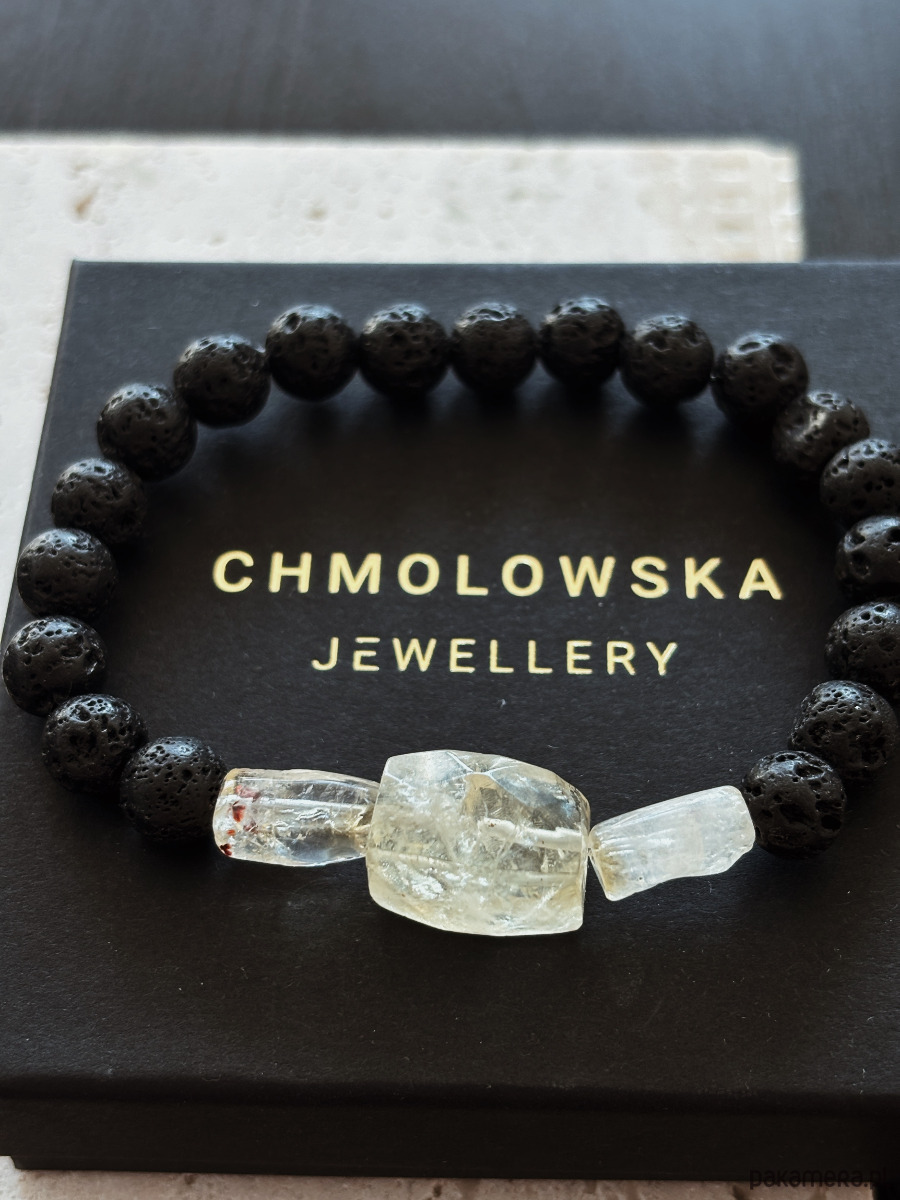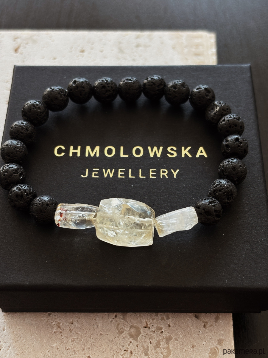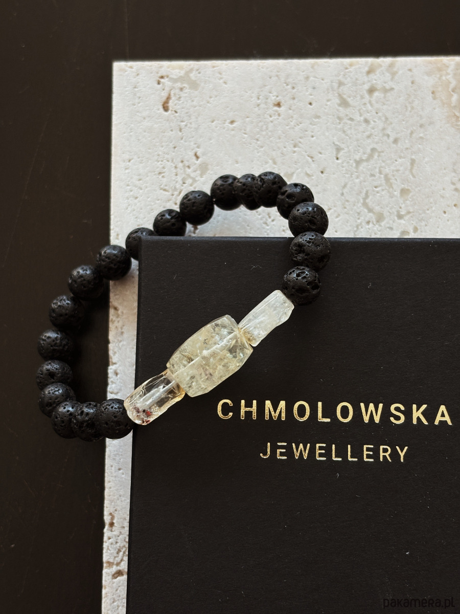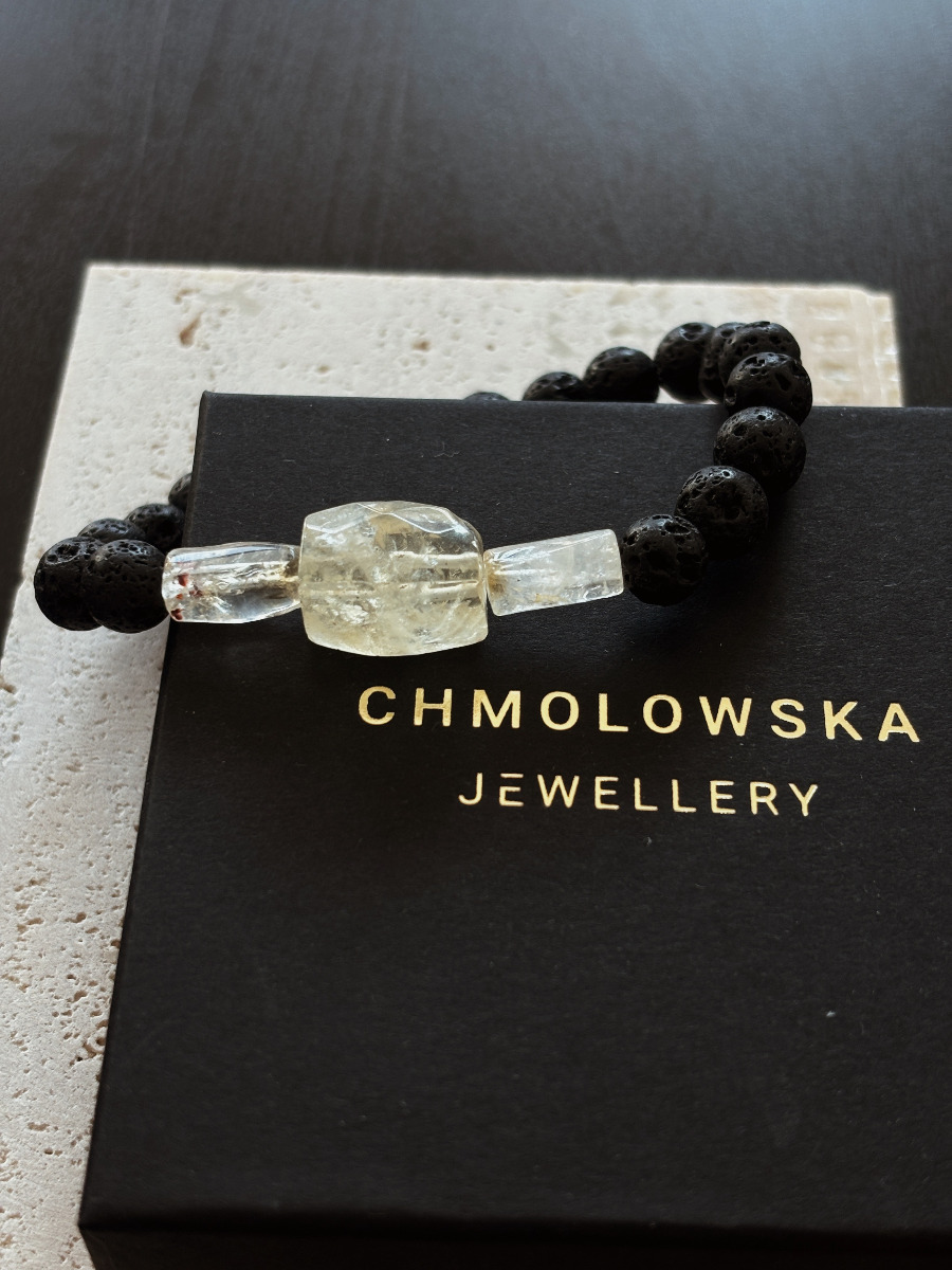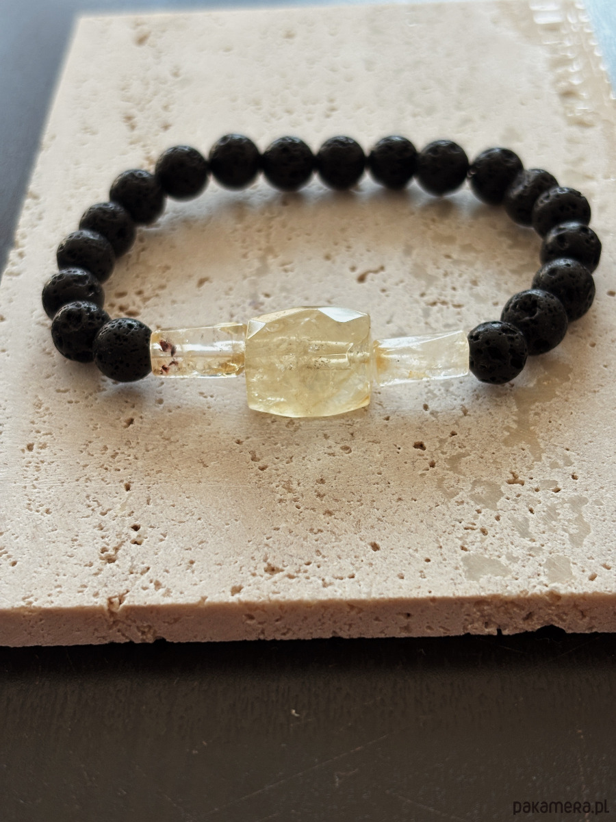 Bransoletka wykonana jest na gumce elastycznej z kamieni Lawy Wulkanicznej i Cytrynu w pięknej, unikatowej bryle.