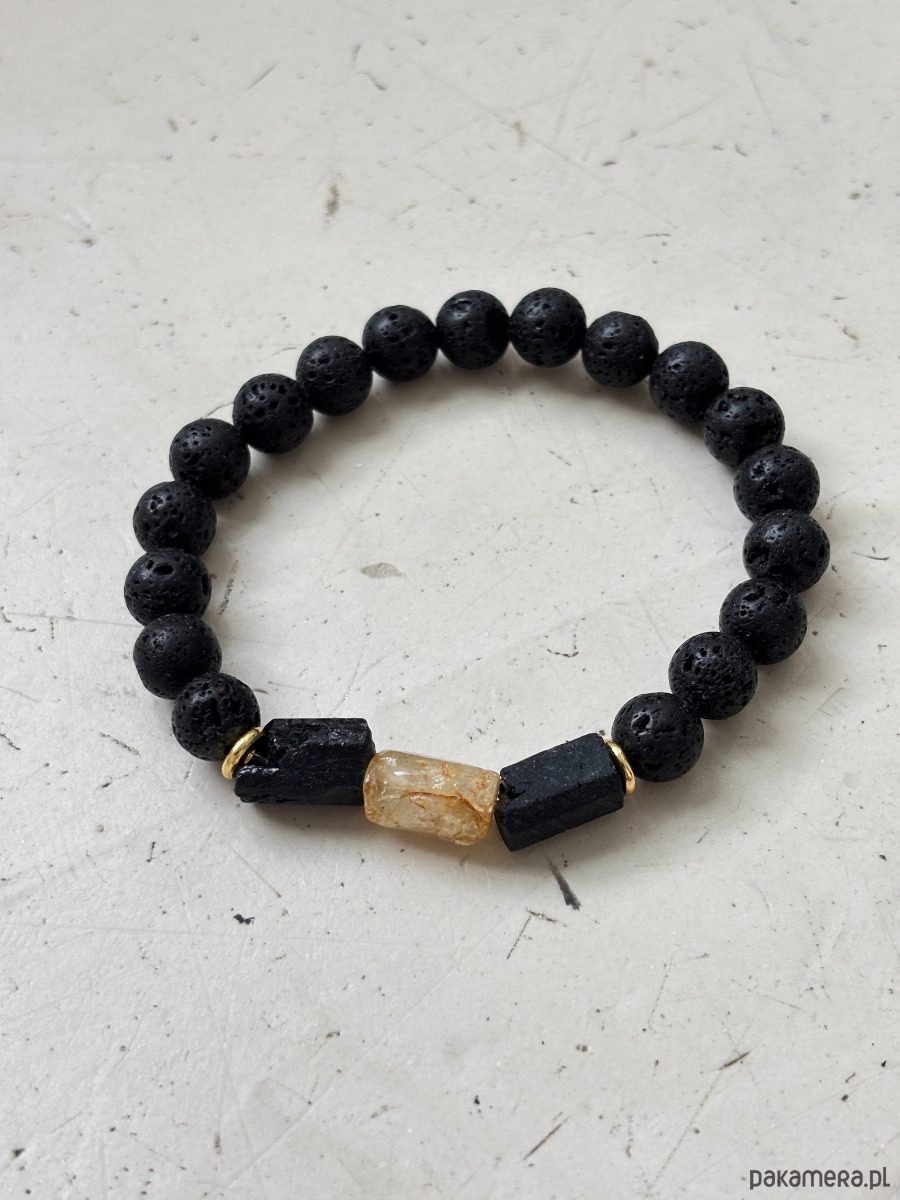 Bransoletka wykonana jest na gumce jubilerskiej z użyciem kamieni Cytrynu,lawy i Turmalinu.