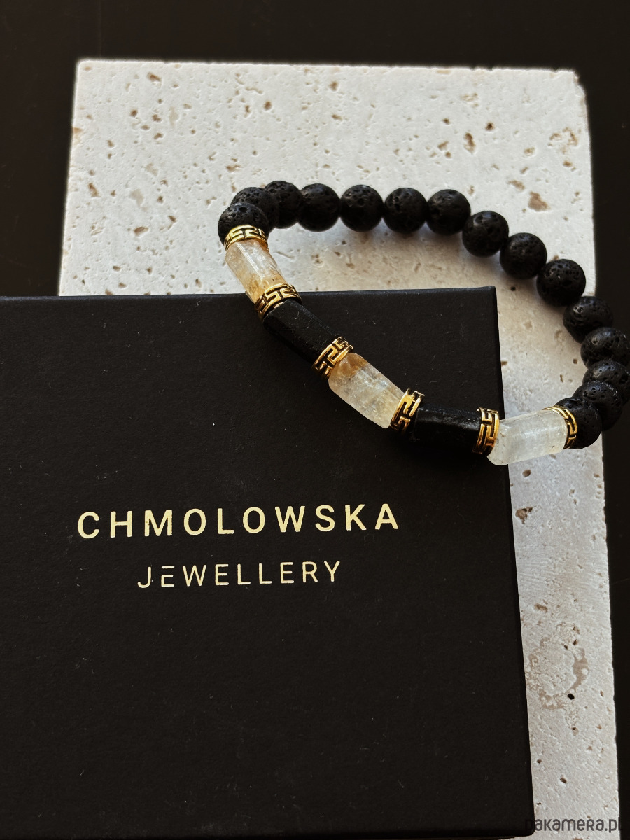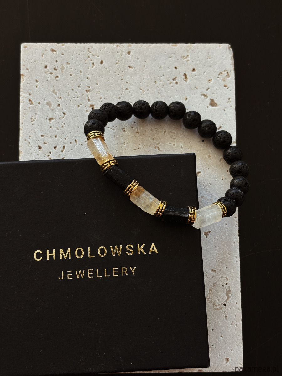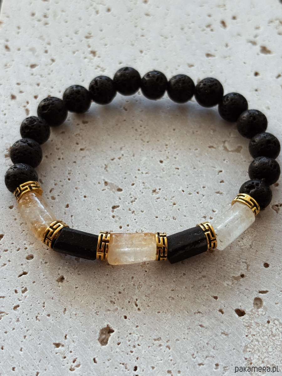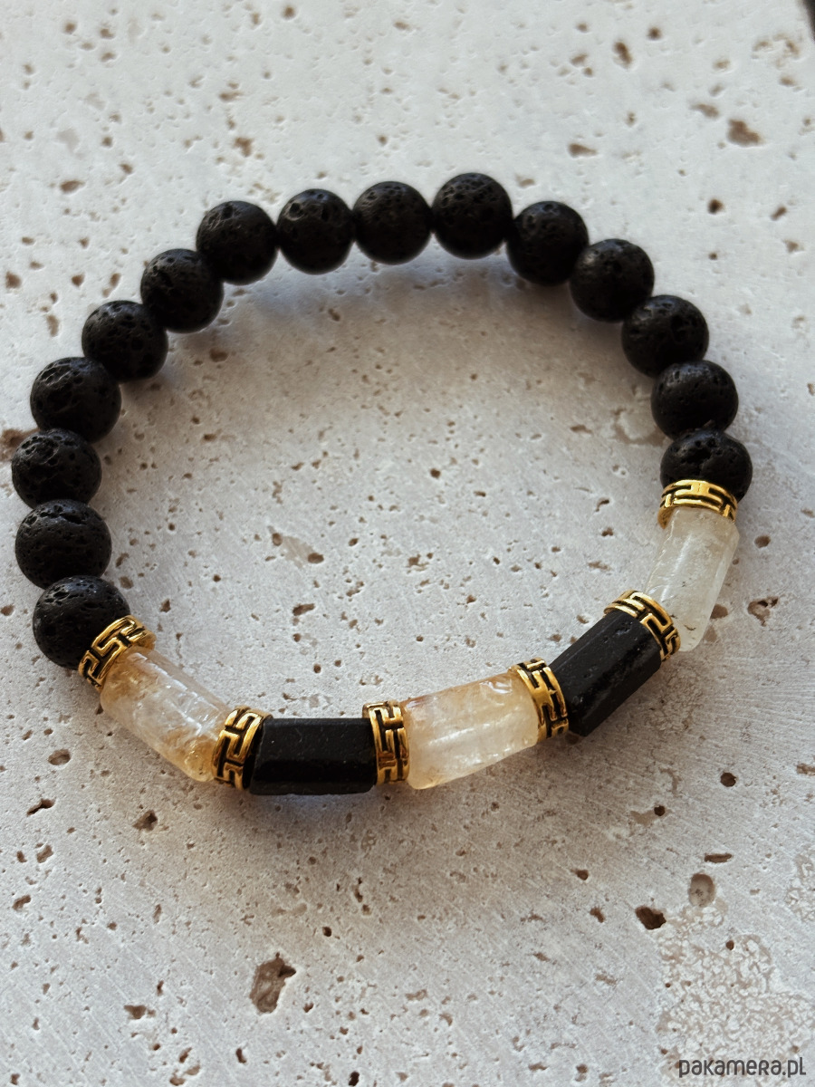 Bransoletka wykonana jest na gumce elastycznej z kamieni Cytrynu, Turmalinu i Lawy Wulkanicznej.