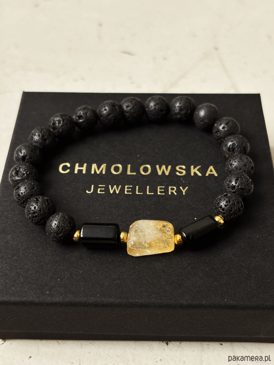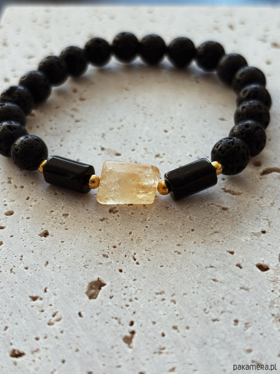 Bransoletka wykonana na gumce elastycznej z kamieni Lawy Wulkanicznej, Turmalinu, Cytrunu i pozłacanych przekładek.