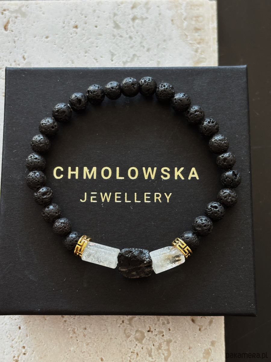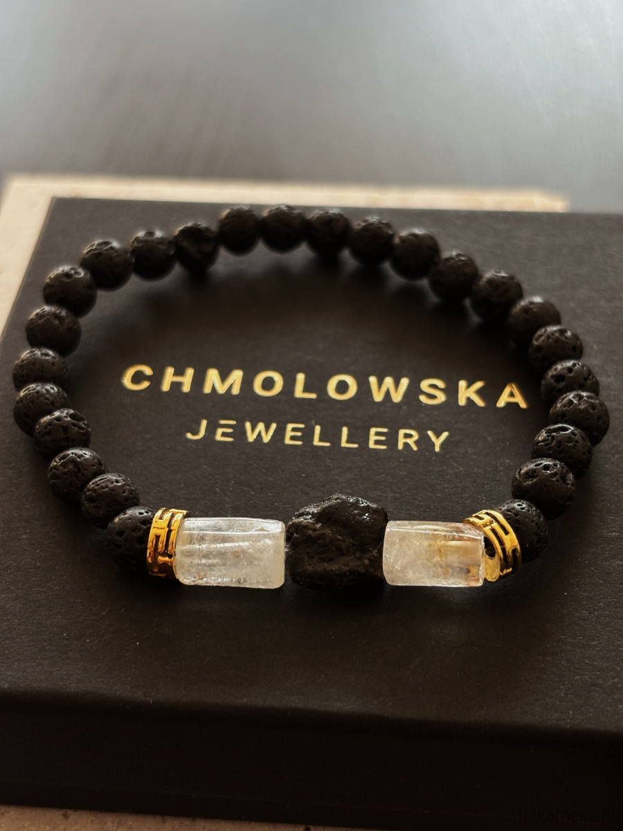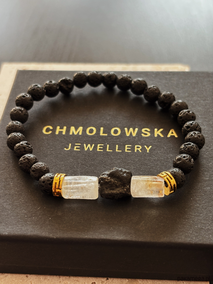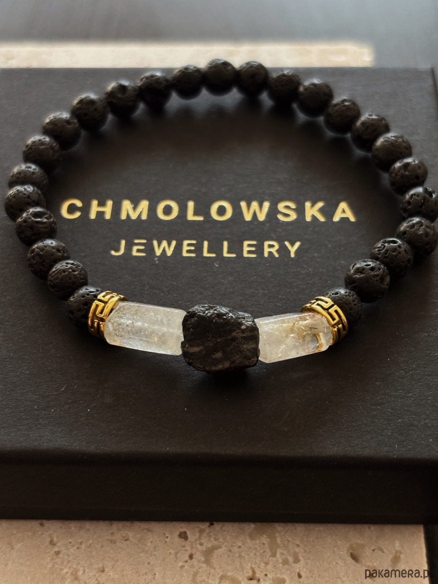 Bransoletka wykonana jest na gumce elastycznej z kamieni Cytrynu, Turmalinu i Lawy Wulkanicznej.