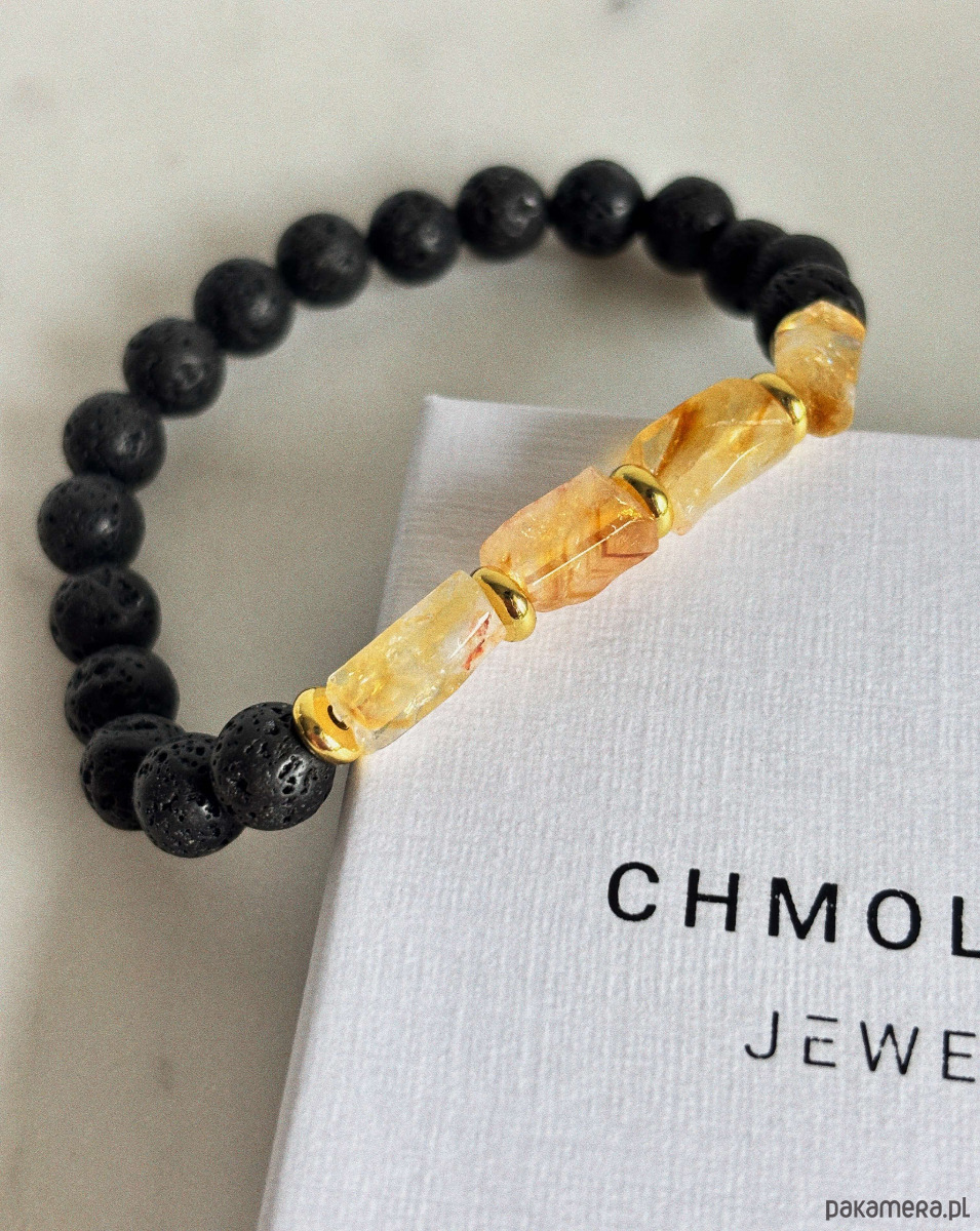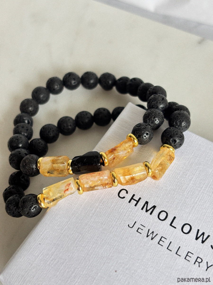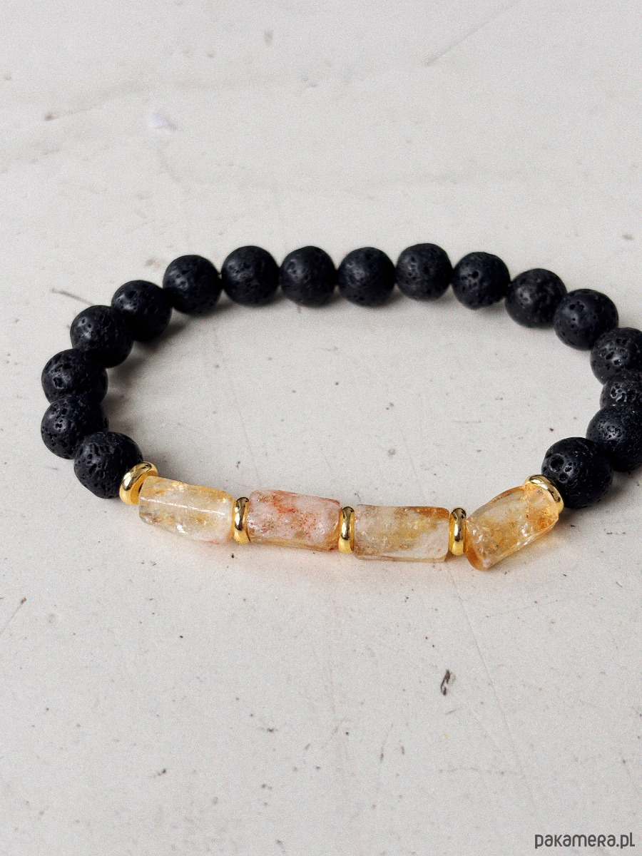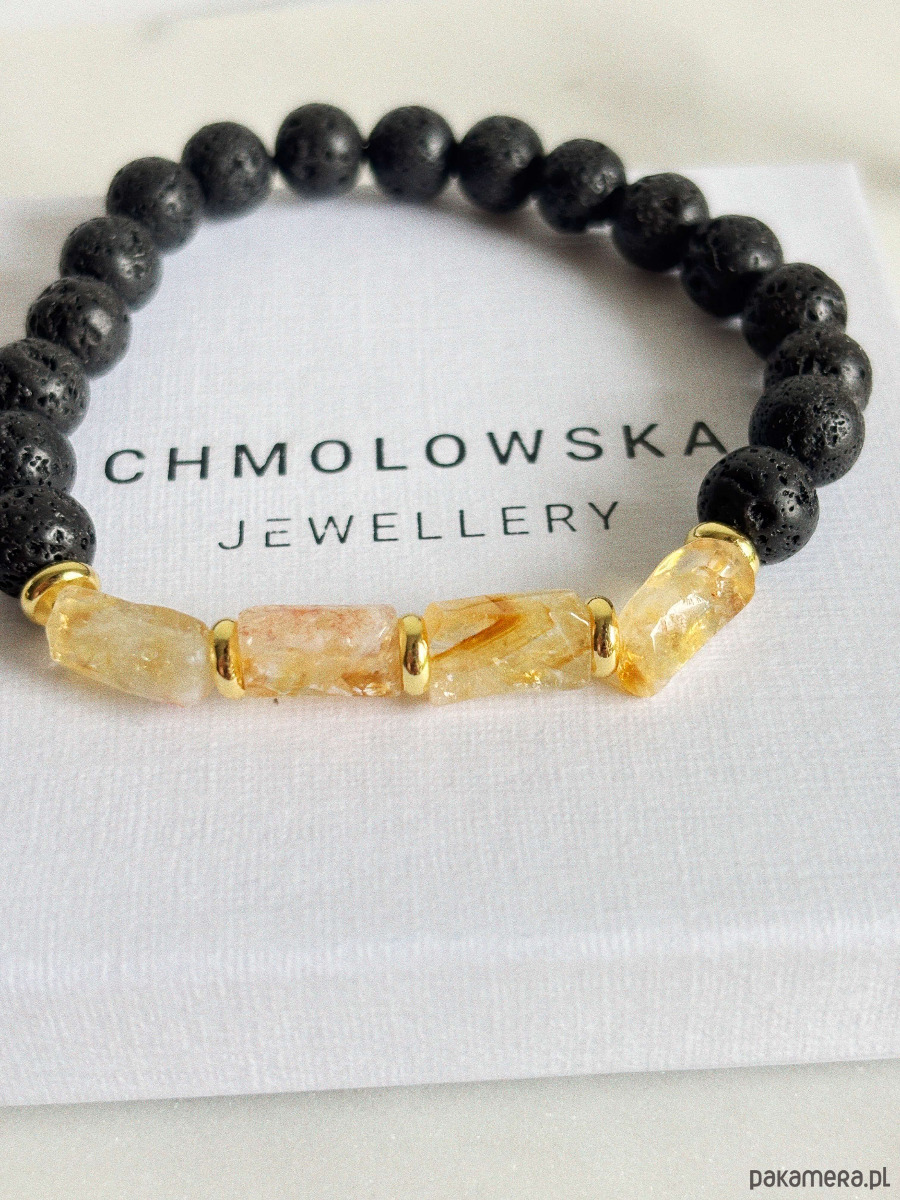 Bransoletka wykonana jest na gumce jubilerskiej z użyciem kamieni cytrynu, lawy i przekładek w kolorze złotym.