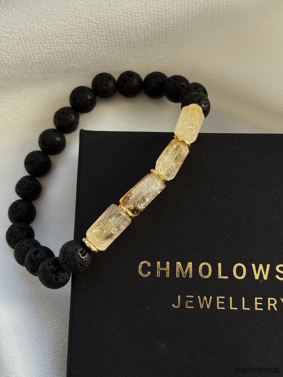 Bransoletka wykonana jest na gumce jubilerskiej z użyciem kamieni cytrynu, lawy i przekładek w kolorze złotym.