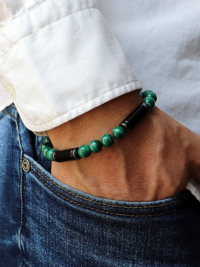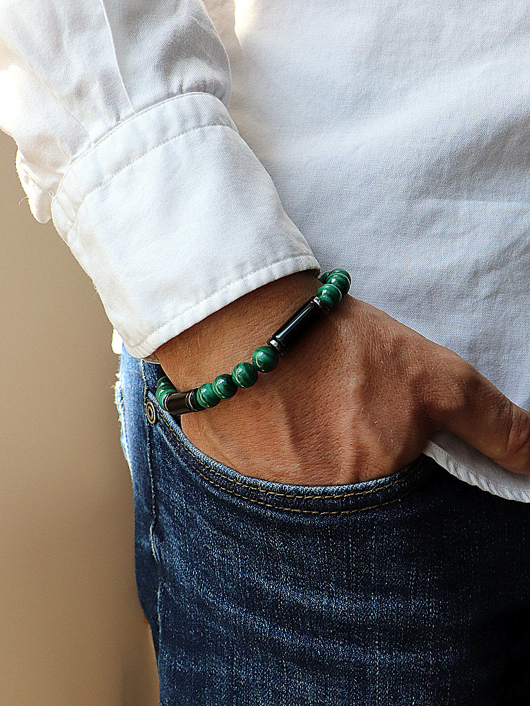 Bransoletka składa się z powtarzających się segmentów. Gładkie, zielone kulki malachitu (ok. 8 mm) przeplatają się, tworząc dynamiczny rytm. Całość dopełniają połyskujące, grafitowe dyski hematytu (ok. 8 mm) oraz centralny punkt każdej sekwencji – gładka belka z czarnego turmalinu (ok. 8 x 17 mm).