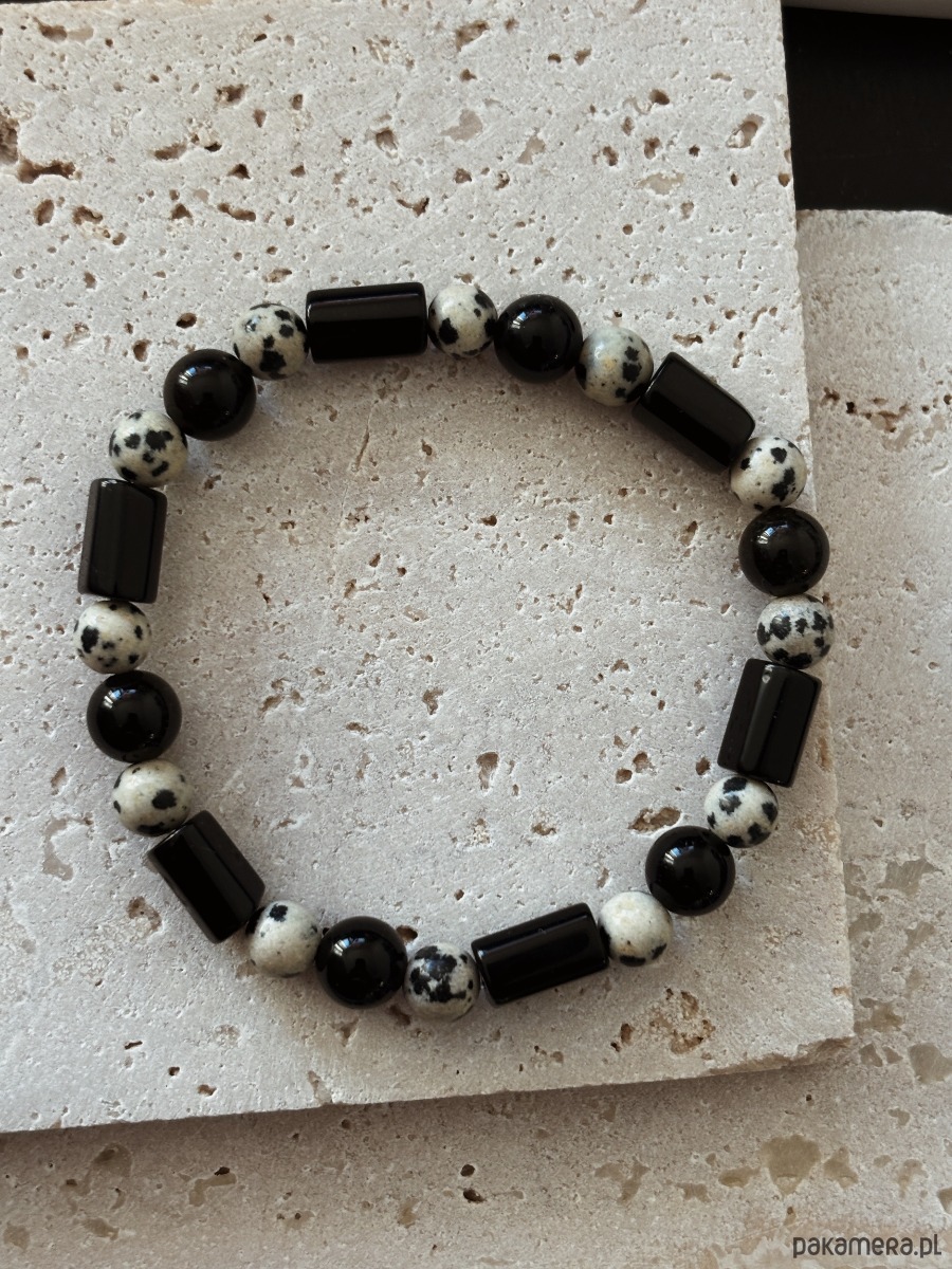 Bransoletka wykonana jest z jaspisu dalmatyńskiego, turmalinu i onyksu na gumce elastycznej.