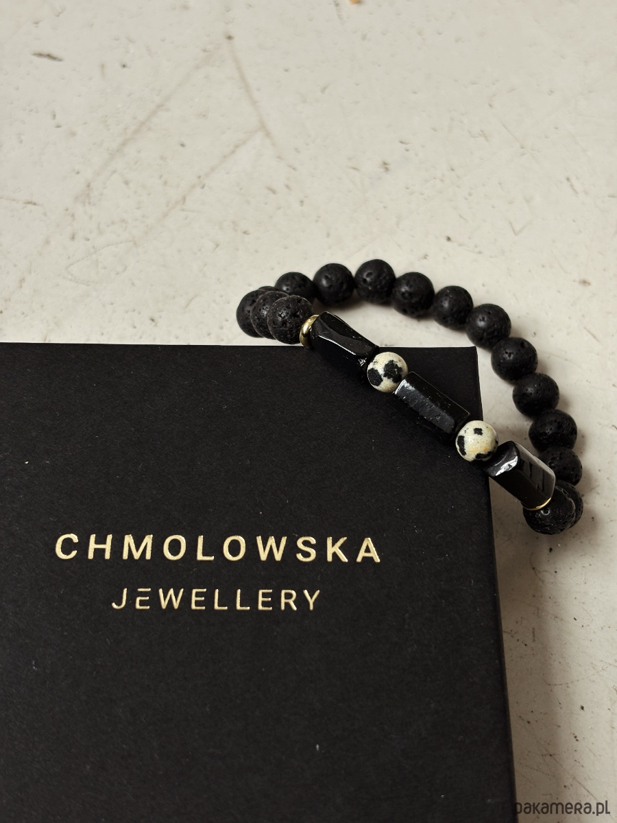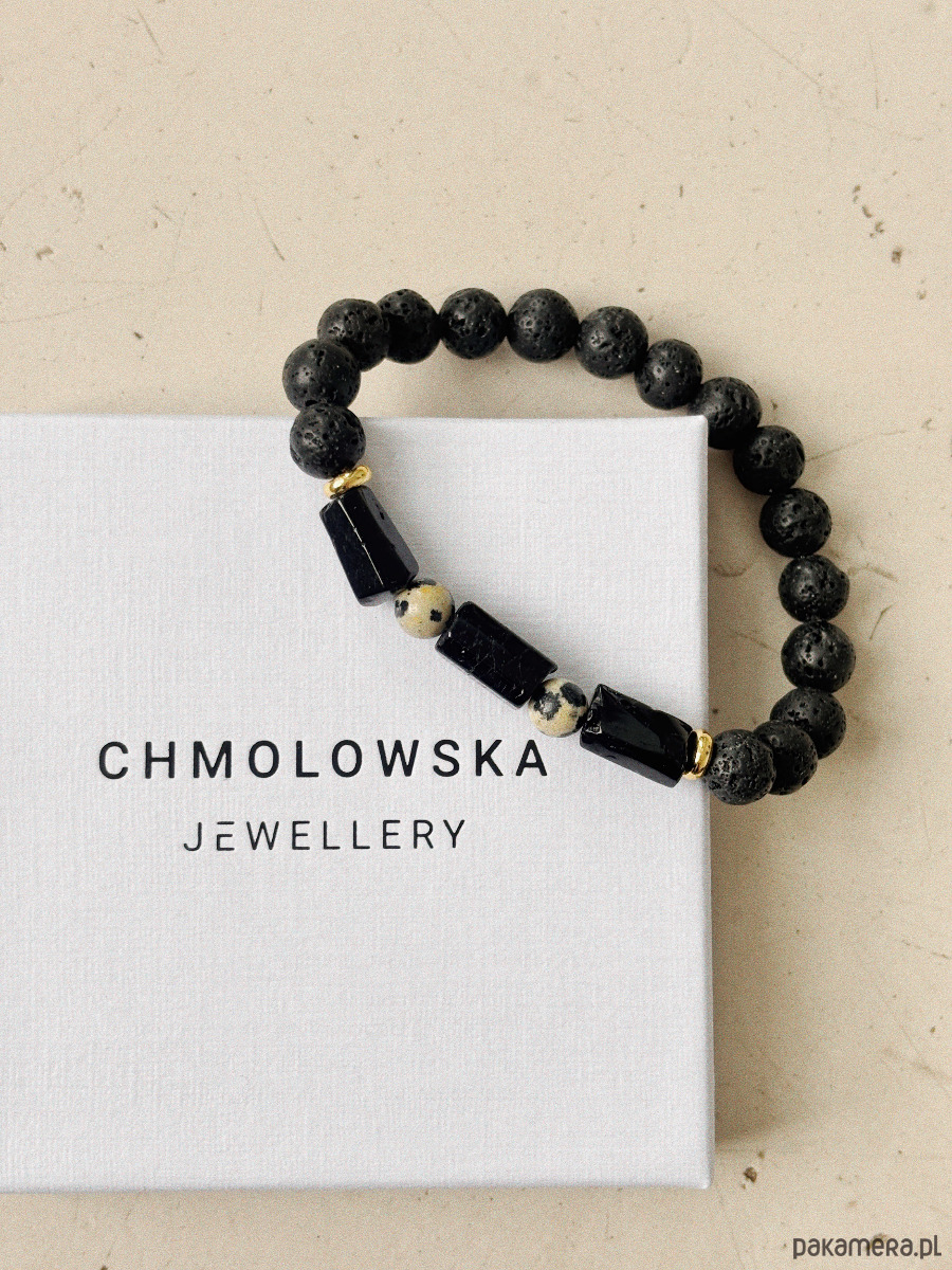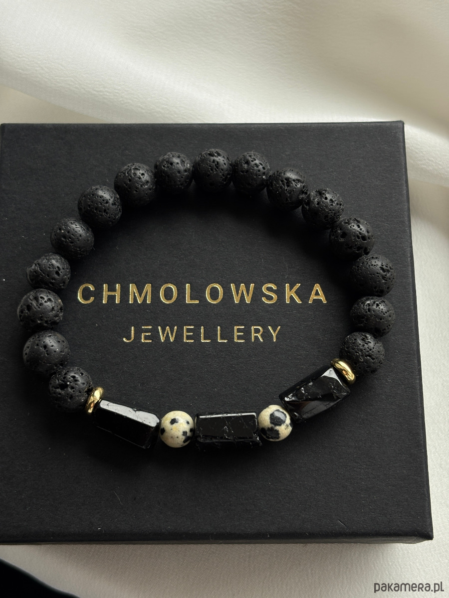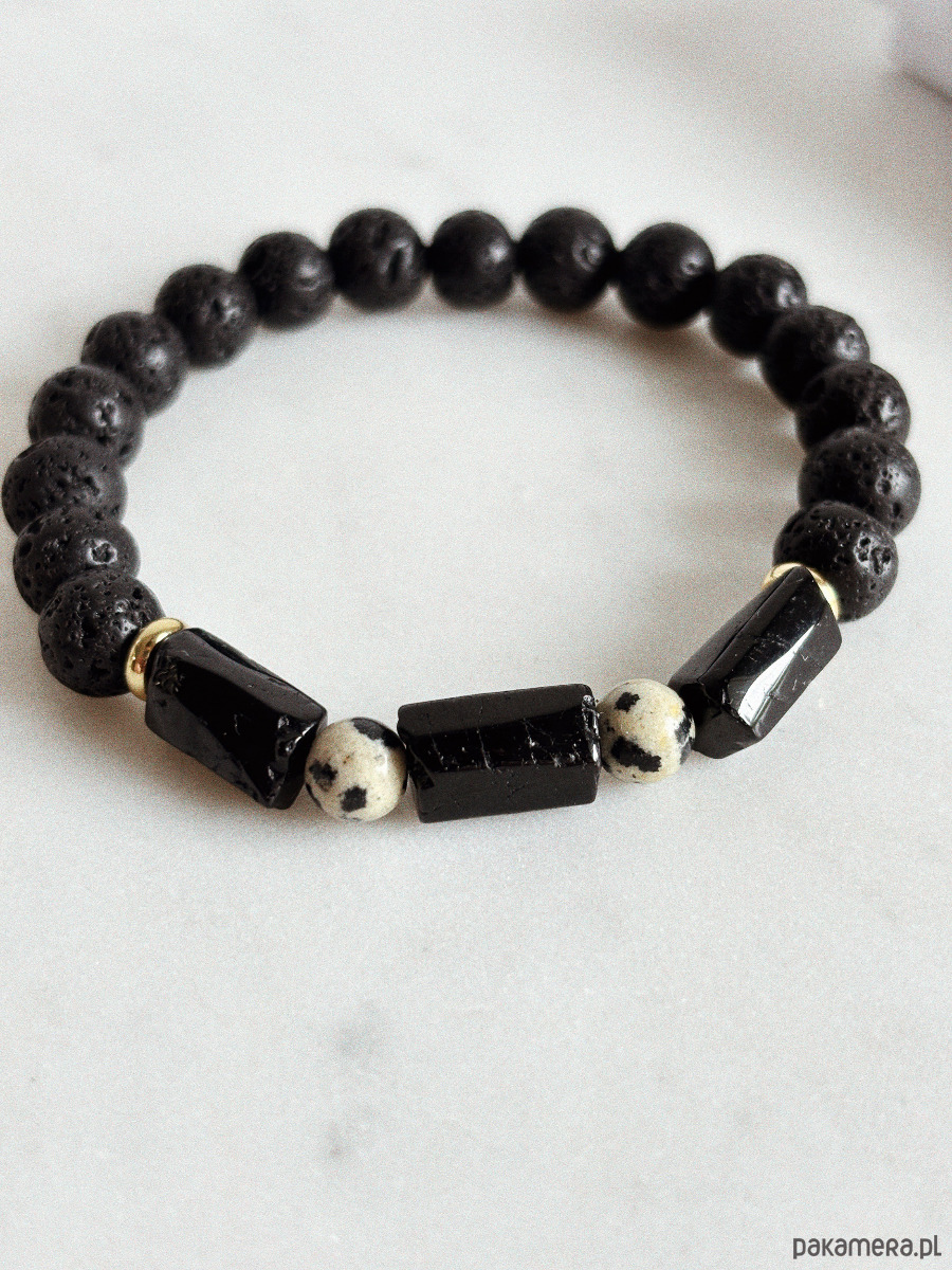 Bransoletka wykonana jest na gumce jubilerskiej z kamieni Jaspisu Dalmatyńskiego, Turmalinu i pozłacanych przekładek.
