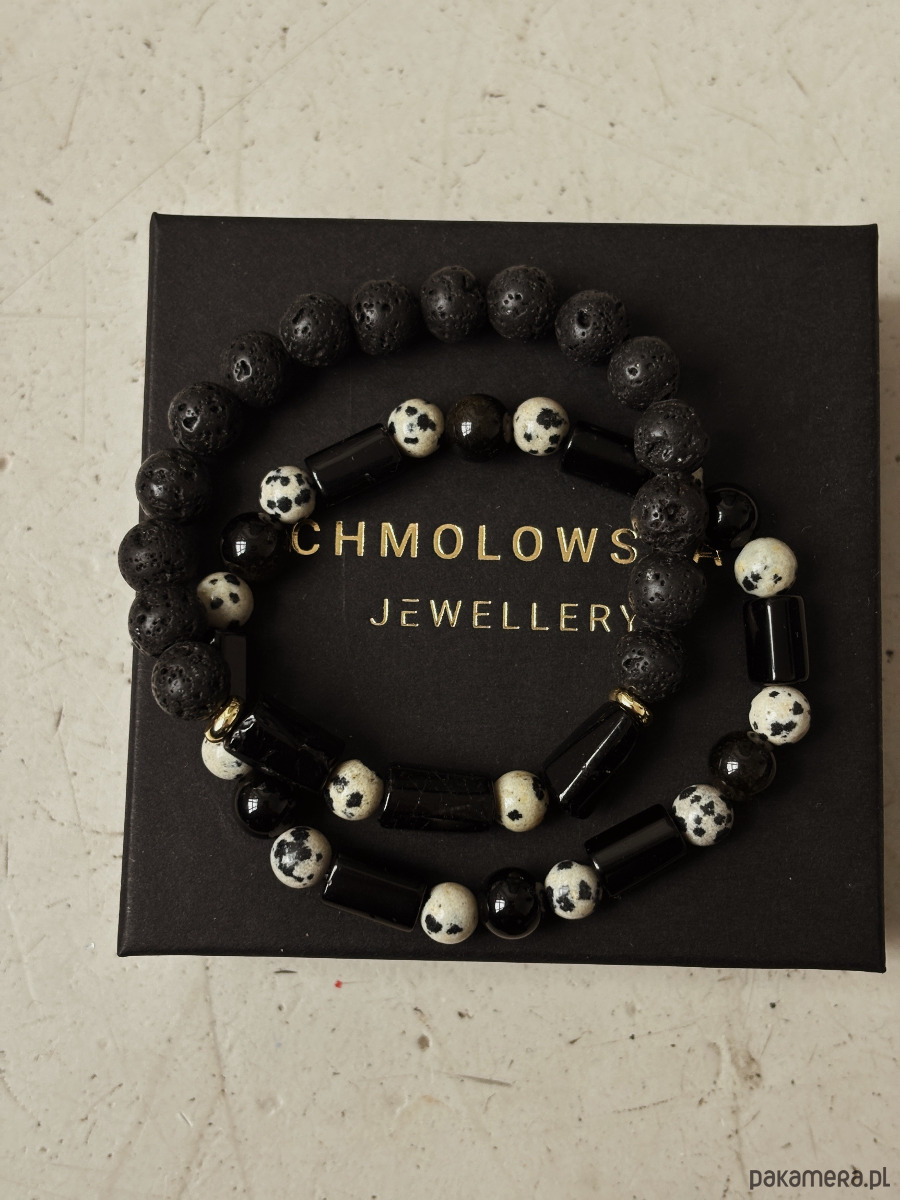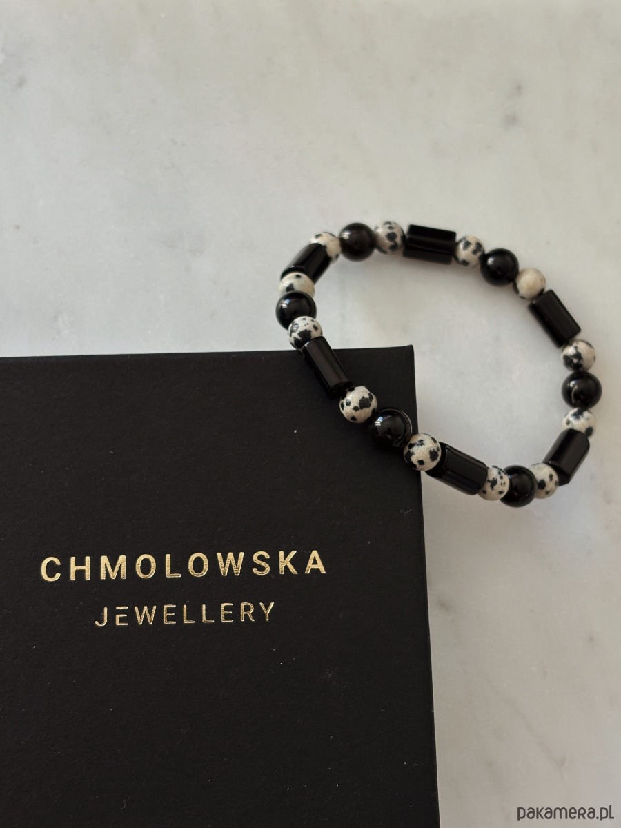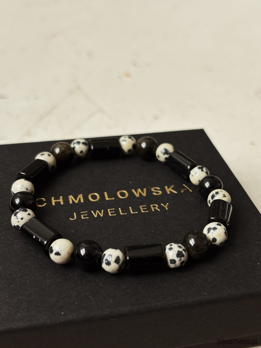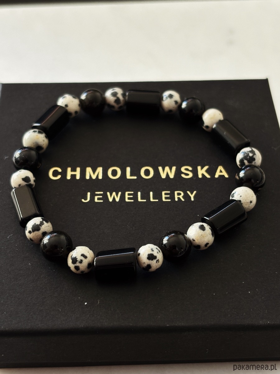 Bransoletka wykonana jest na gumce elastycznej z kamieni Jaspisu Dalmatyńskiego i Turmalinu.
