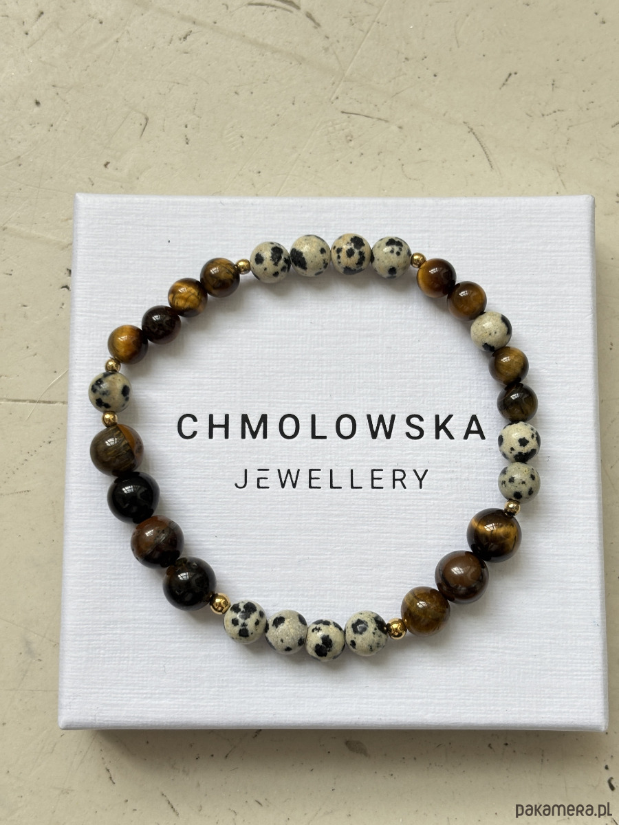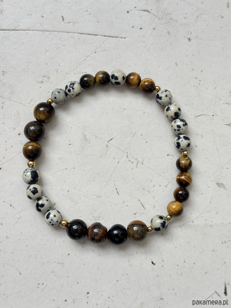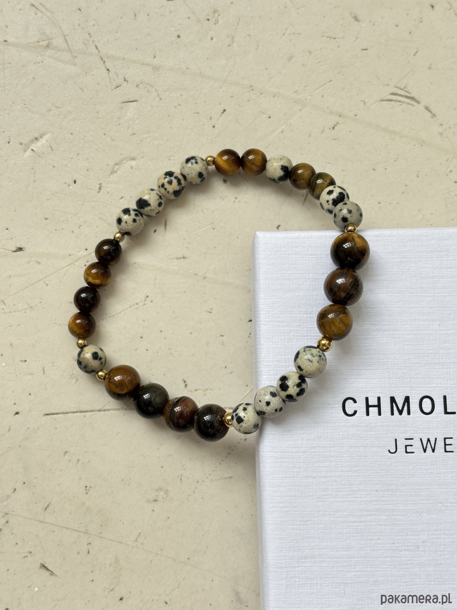 Bransoletka wykonana jest z kamieni jaspisu dalmatyńskiego, tygrysiego oka i pozłacanych przekładek.
