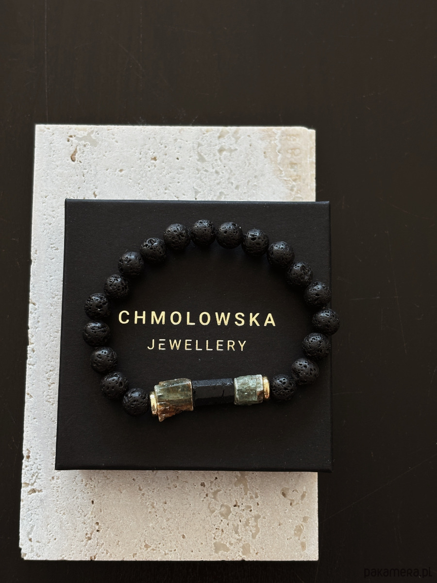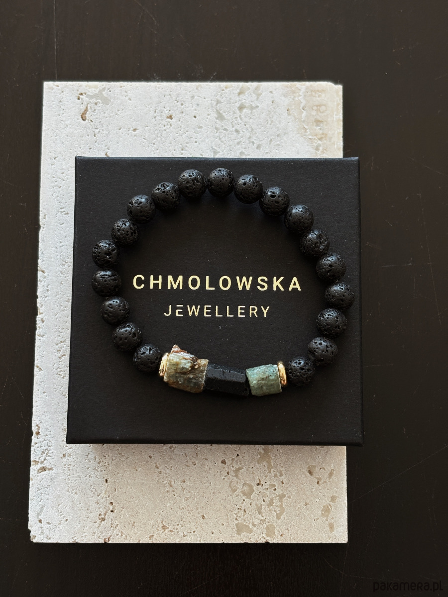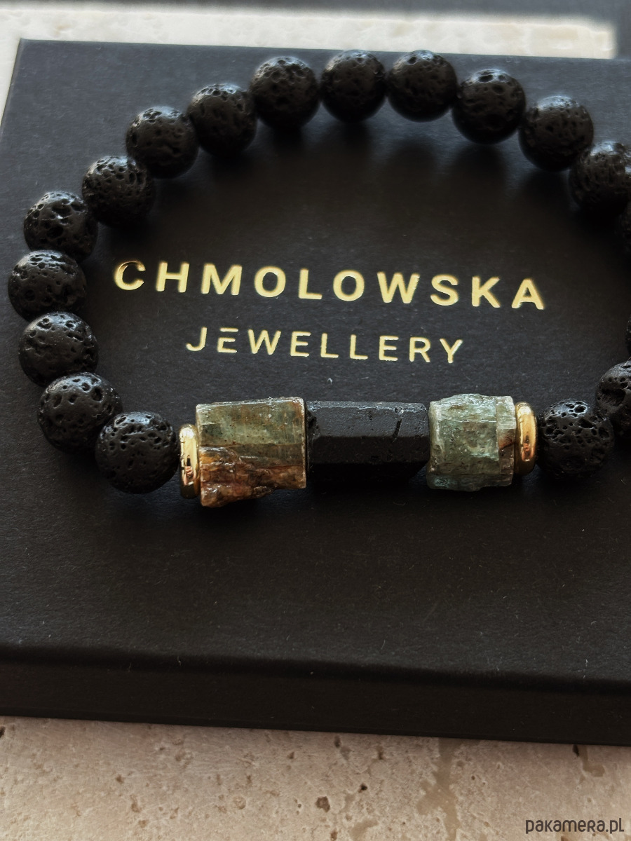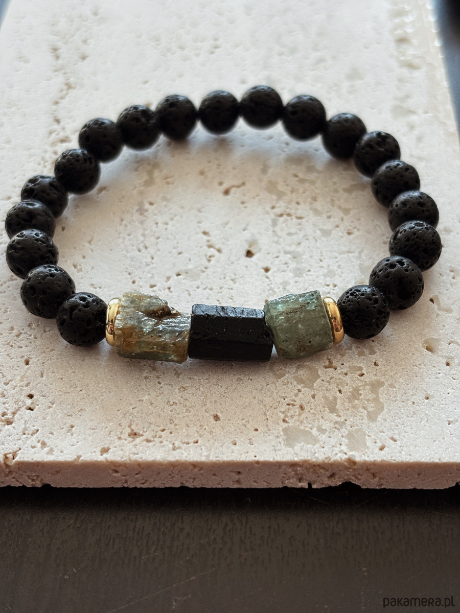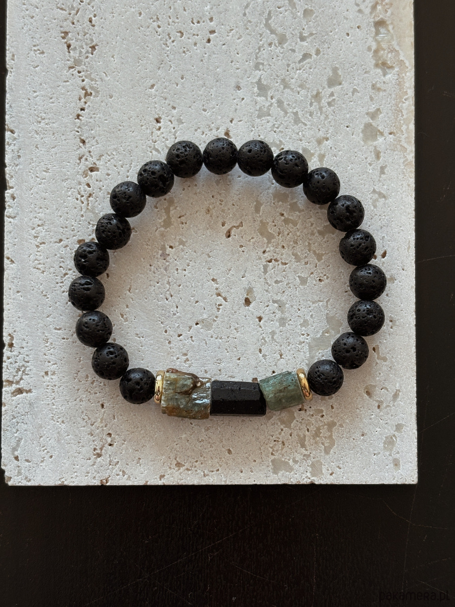 Bransoletka wykonana jest na gumce jubierskiej z kamieni Lawy Wulkanicznej, surowego pięknego Kyanitu i Turmalinu.