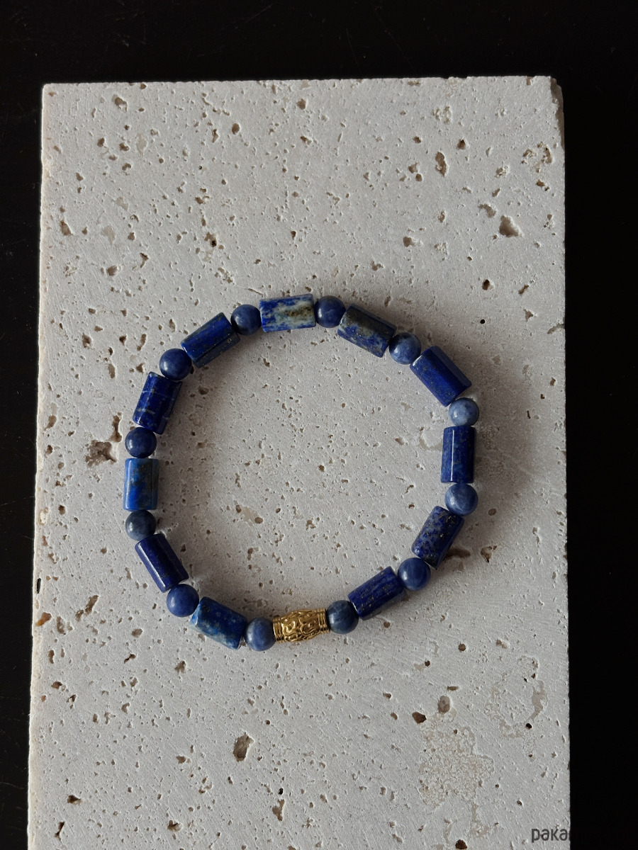 Bransoletka wykonana jest na gumce jubilerskiej z kamieni Lapisu Lazuli, Sodalitu i pozłacanej przekładki.