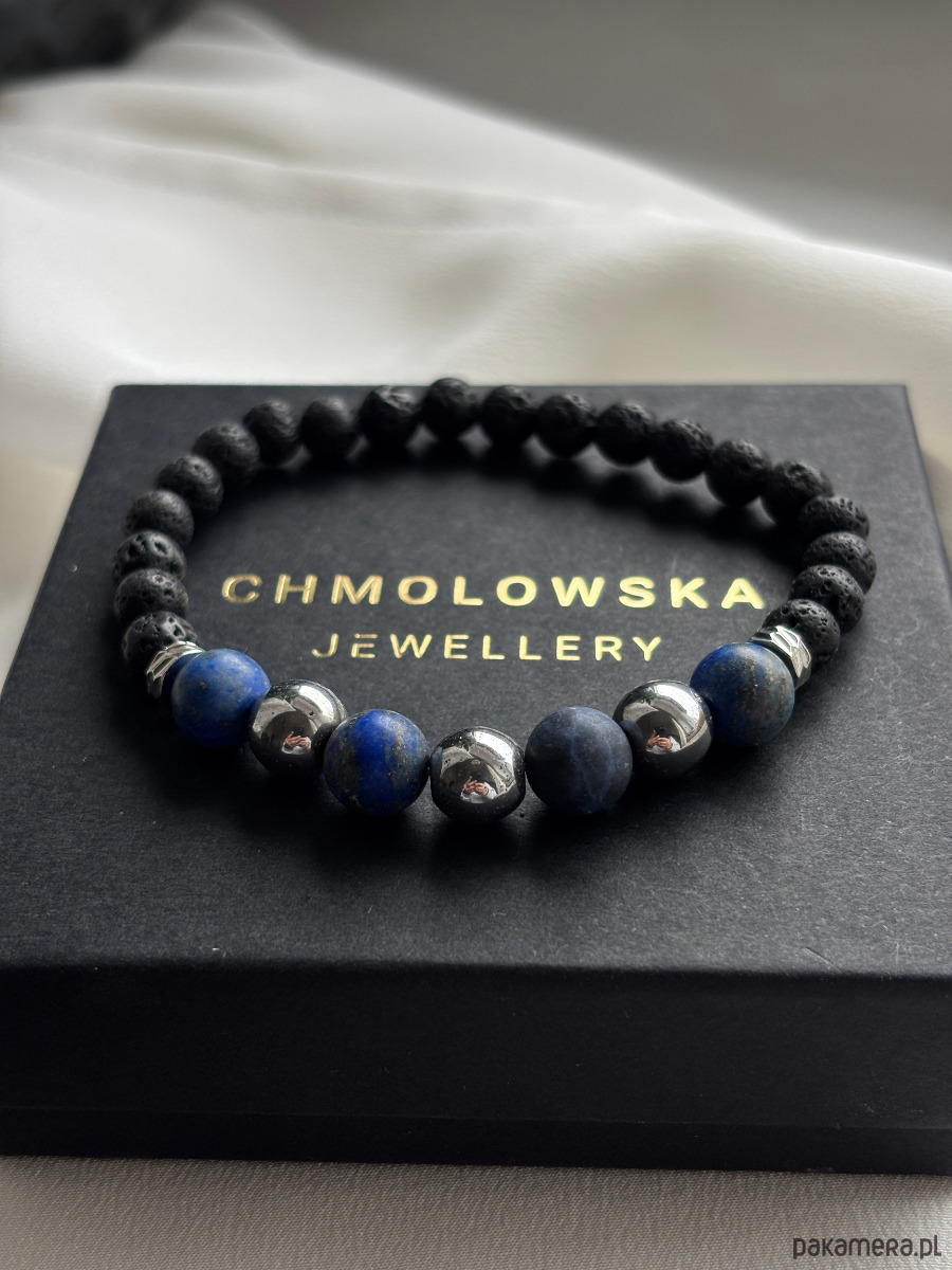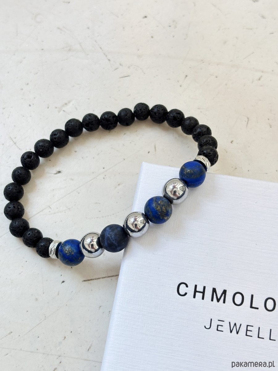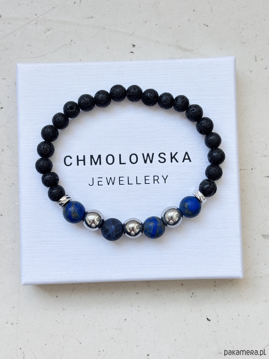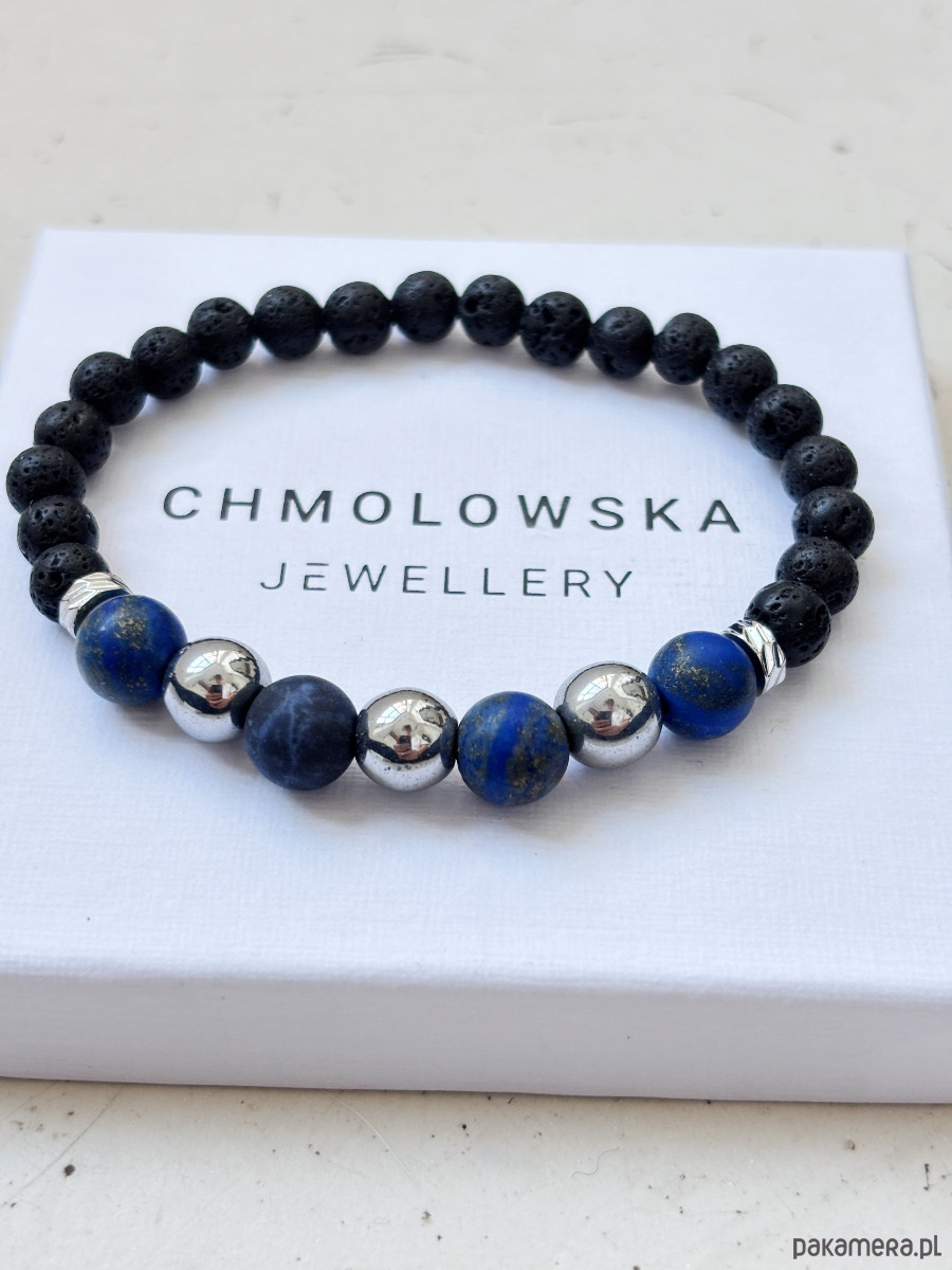 Bransoletka wykonana jest z lapisu lazuli, hematytu, lawy i przekładek w kolorze srebrnym.