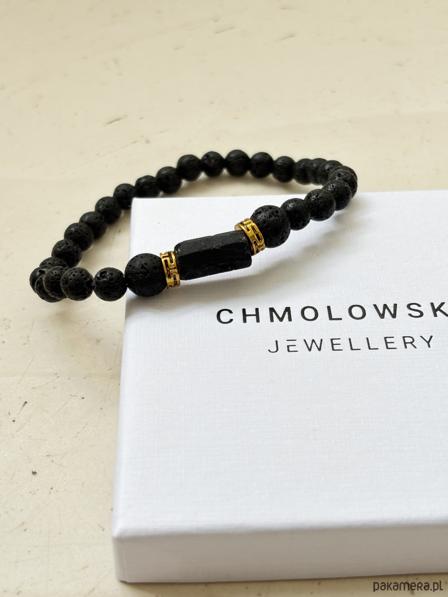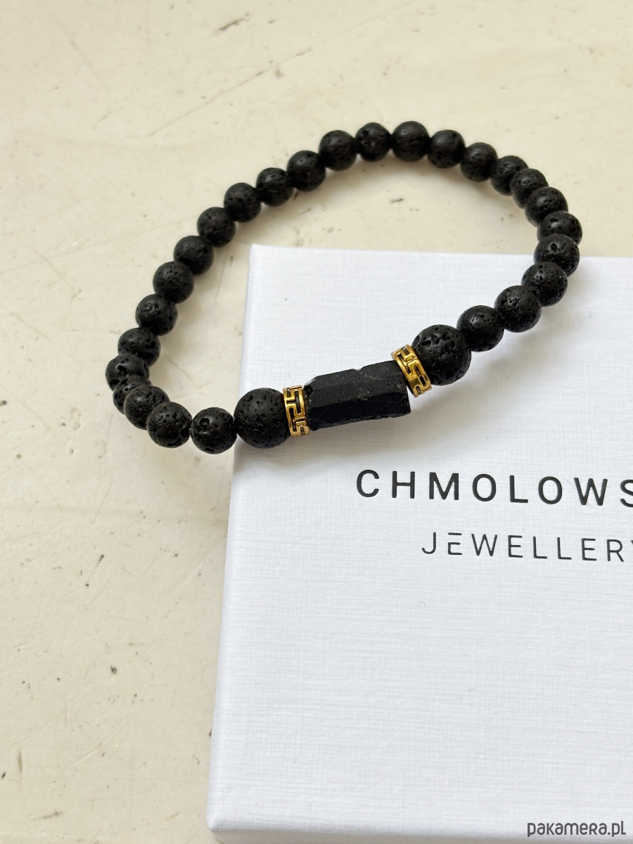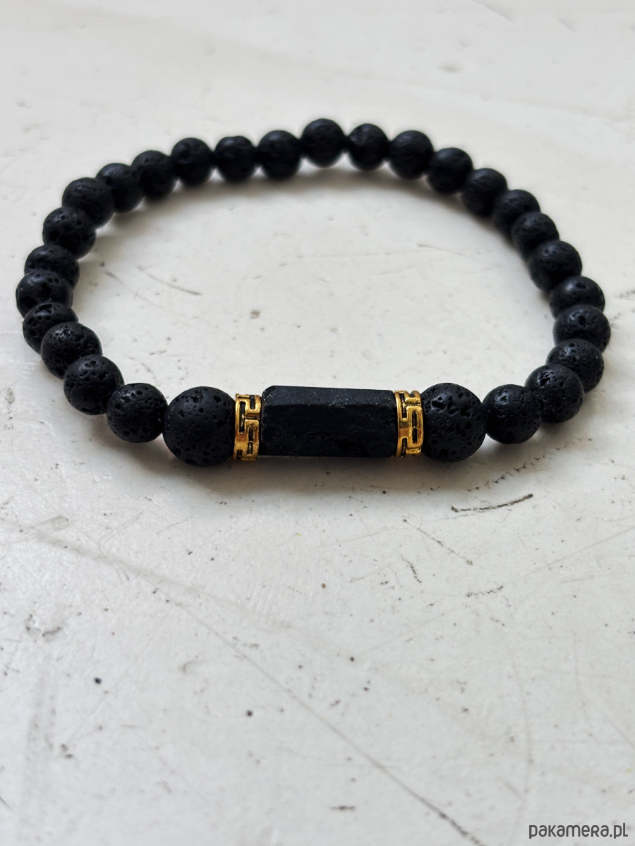 Bransoletka męska zrobiona została na gumce jubilerskiej z użyciem lawy, surowego turmalinu i poszłacanych przekładek.