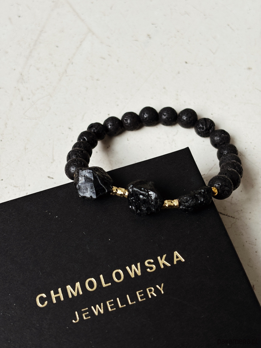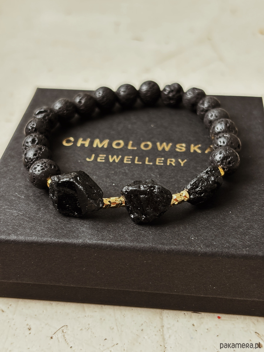 Bransoletka wykonana na gumce jubilerskiej z kamieni Lawy Wulkanicznej i surowych brył Turmalinu.