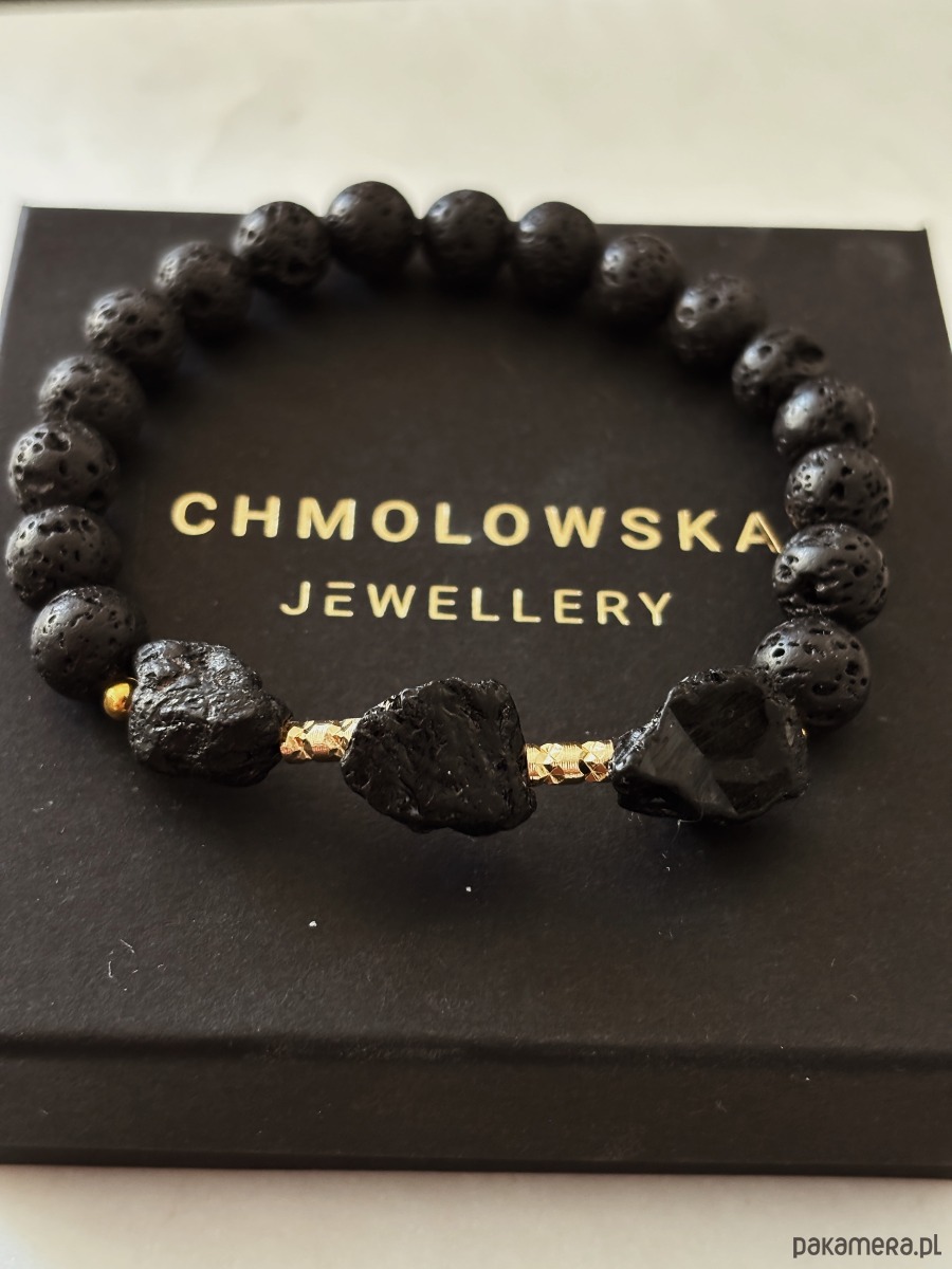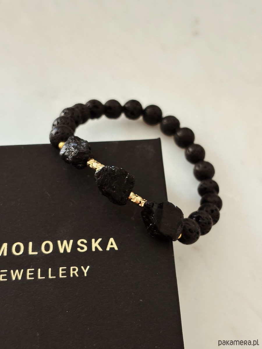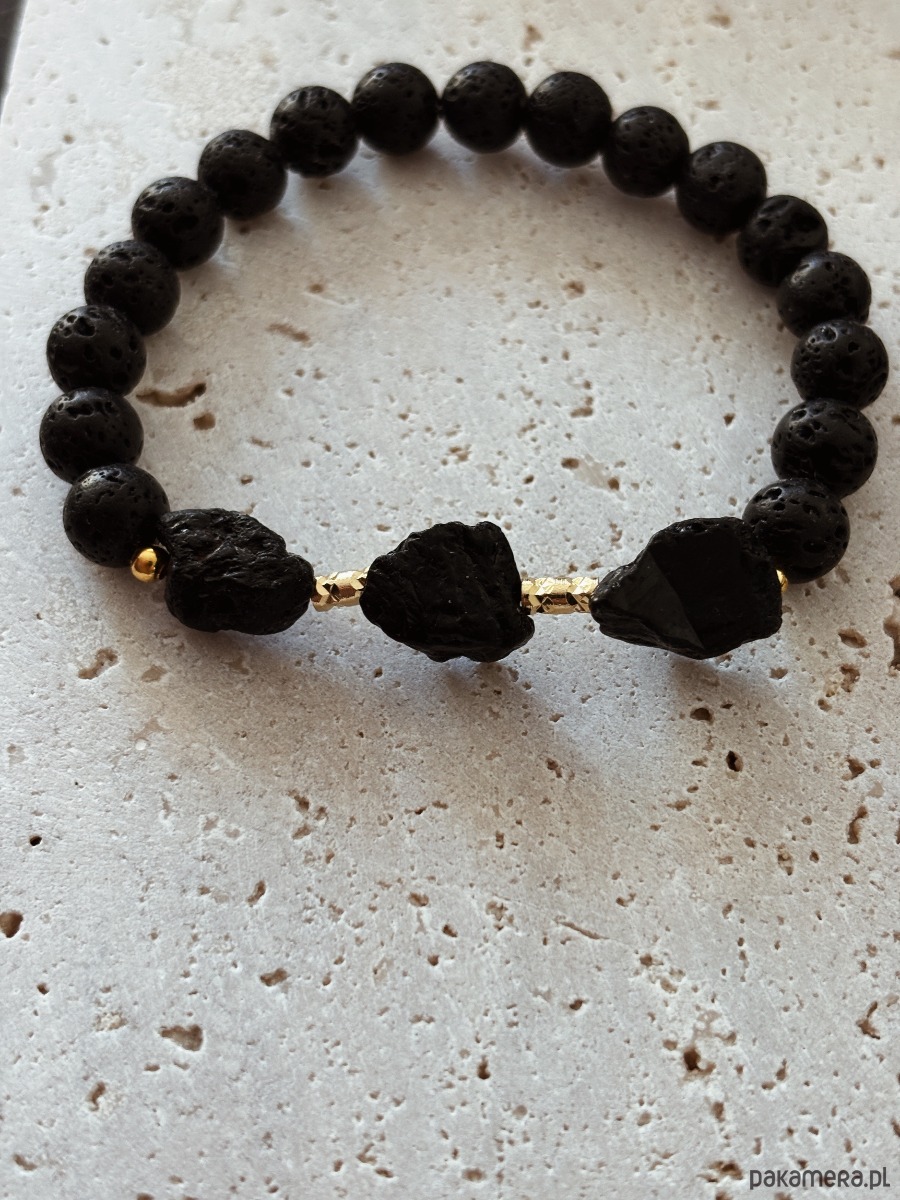 Bransoletka wykonana jest z lawy wulkanicznej i turmalinu w surowej formie na gumce elastycznej.