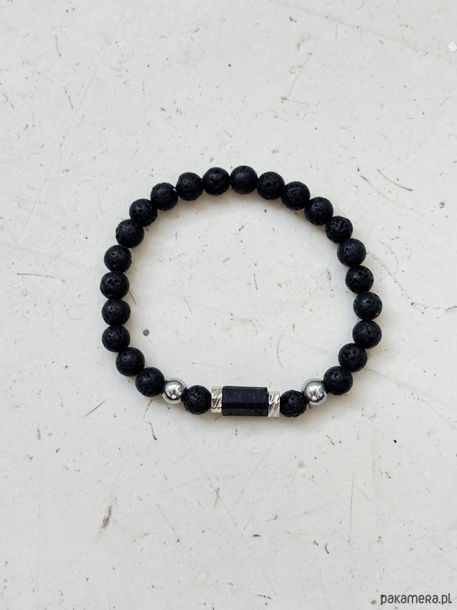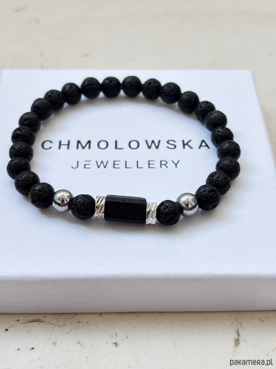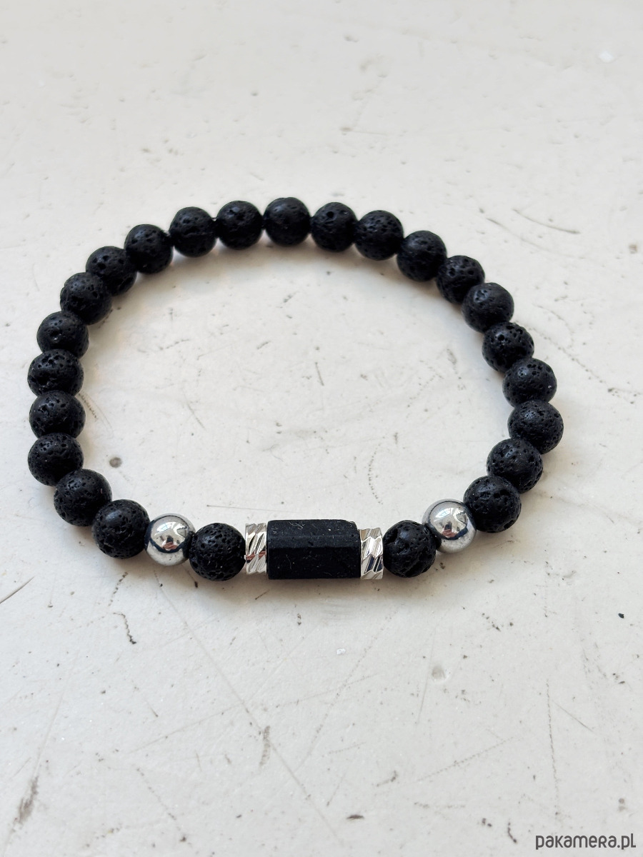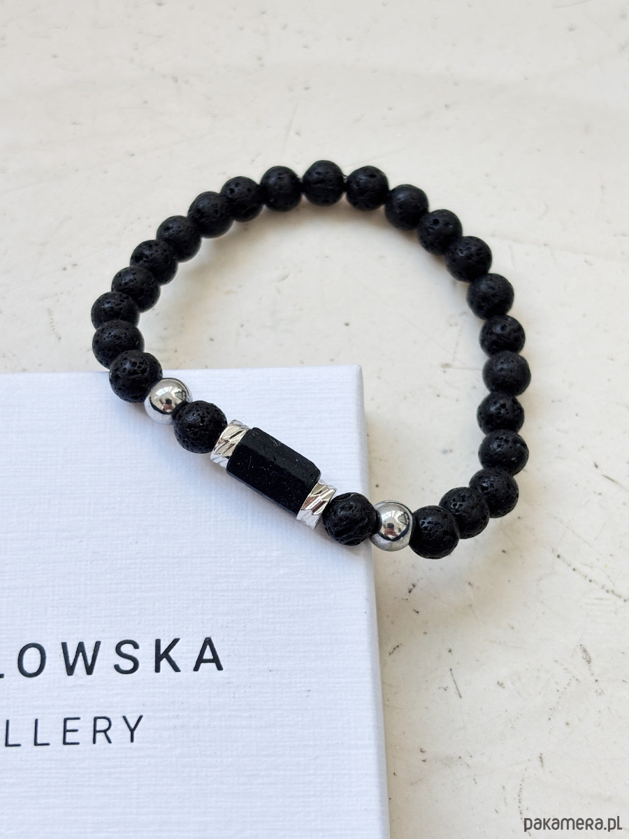 Bransoletka wykonana jest na gumce jubilerskiej z użyciem kamieni lawa, hematyt i turmalin.