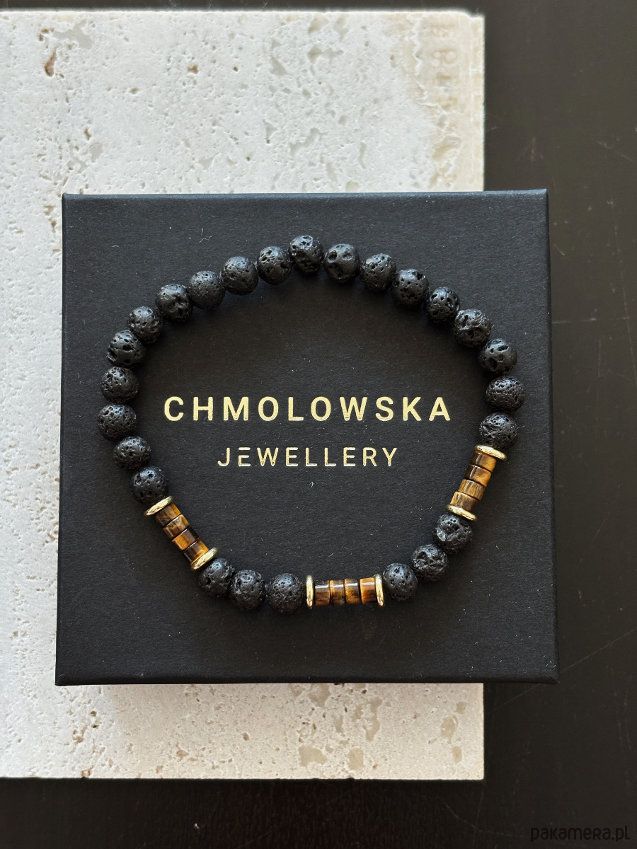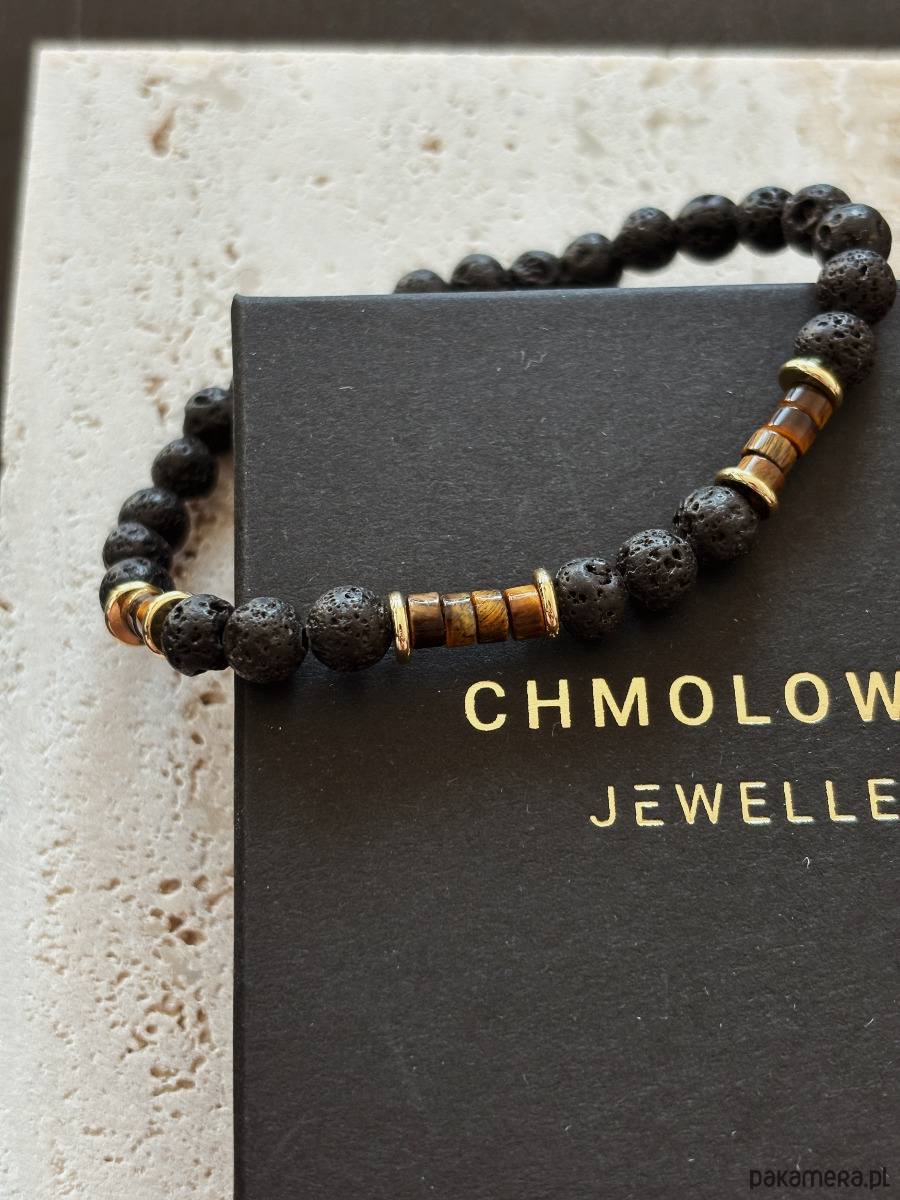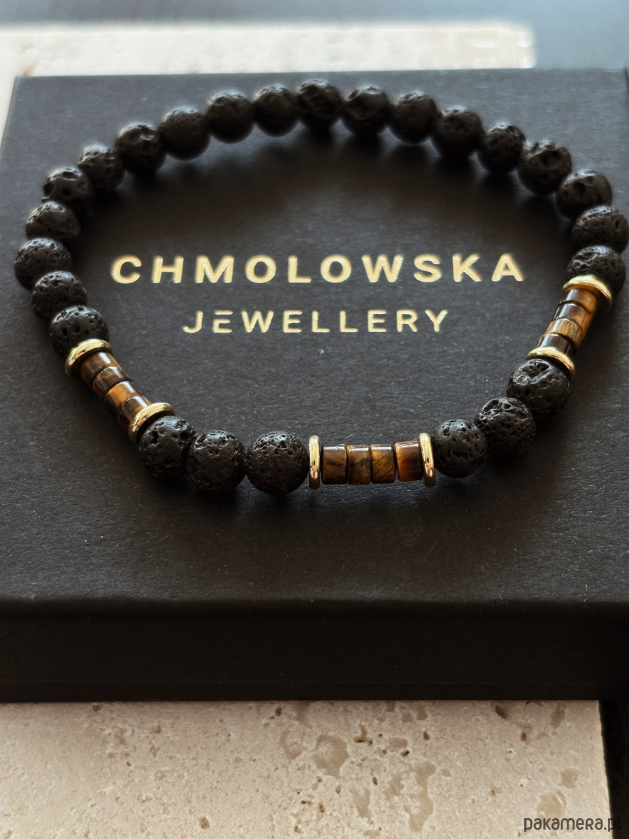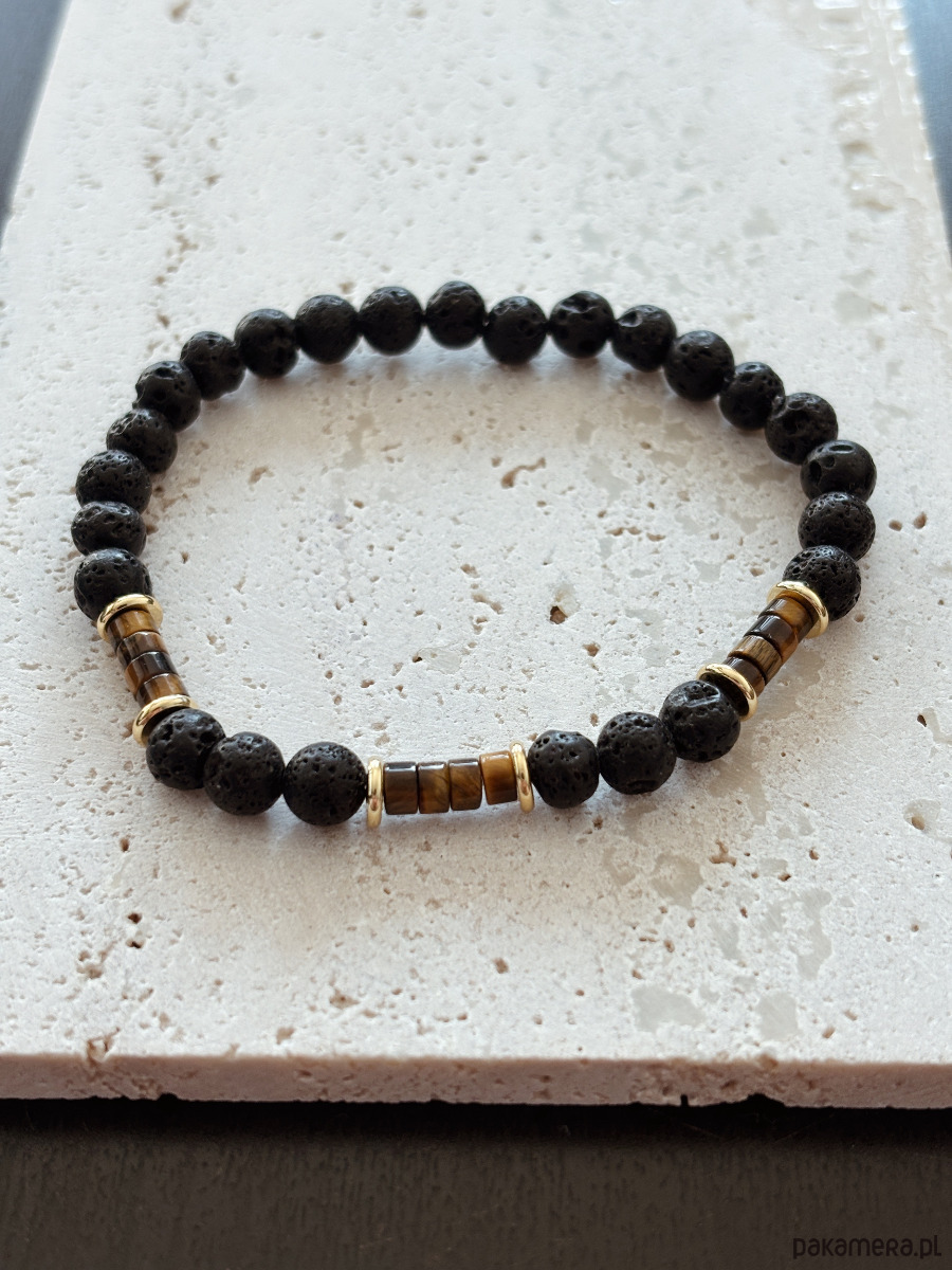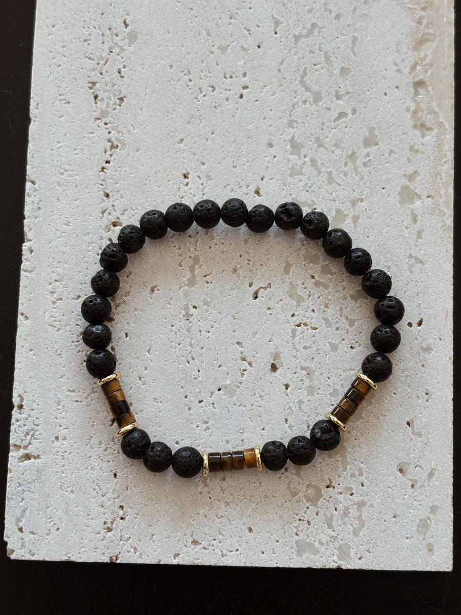 Bransoletka wykonana jest na gumce elastycznej z kamieni Lawy Wulkanicznej,Tygrysiego Oka i pozłacanych przekładek.