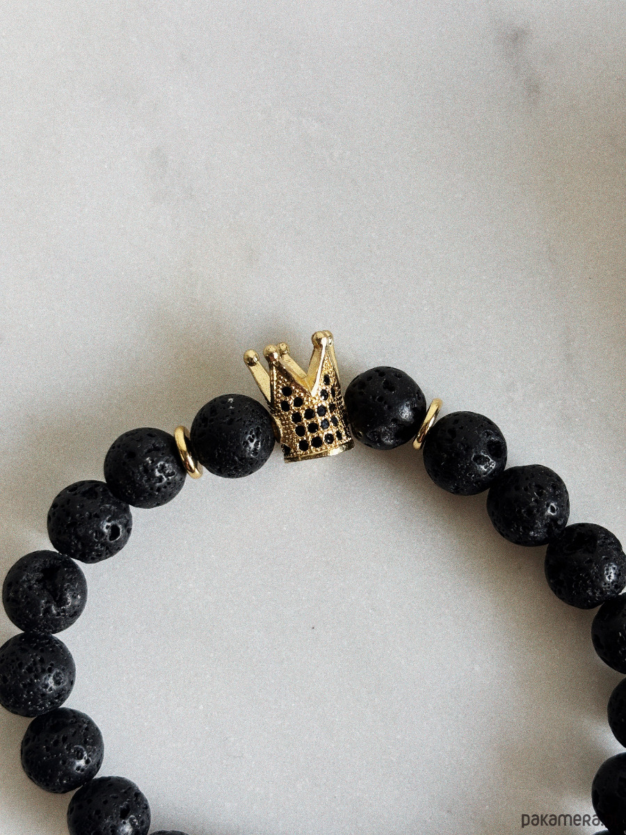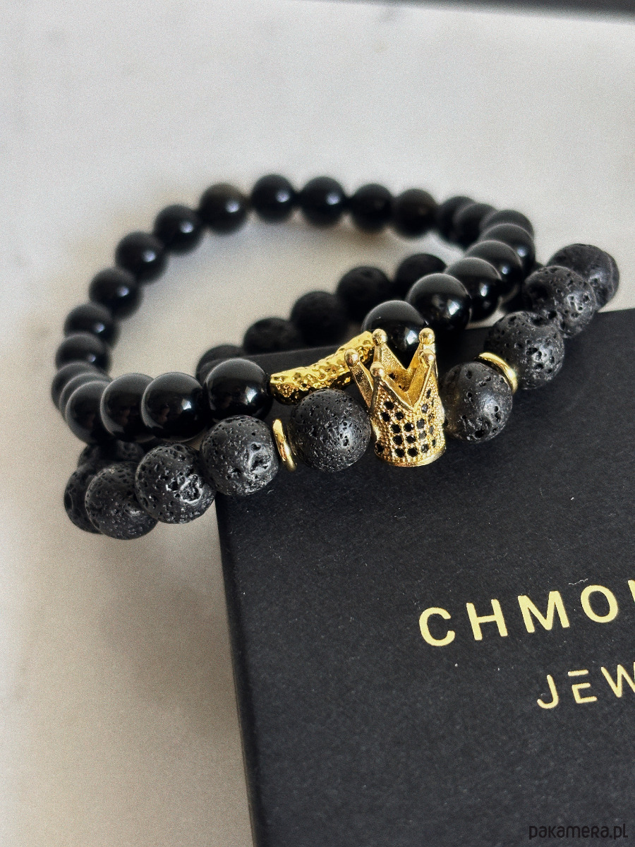 Bransoletka wykonana jest na gumce jubilerskiej z użyciem kamieni lawy wulkanicznej oraz metalowych przekładek w kolorze złotym.