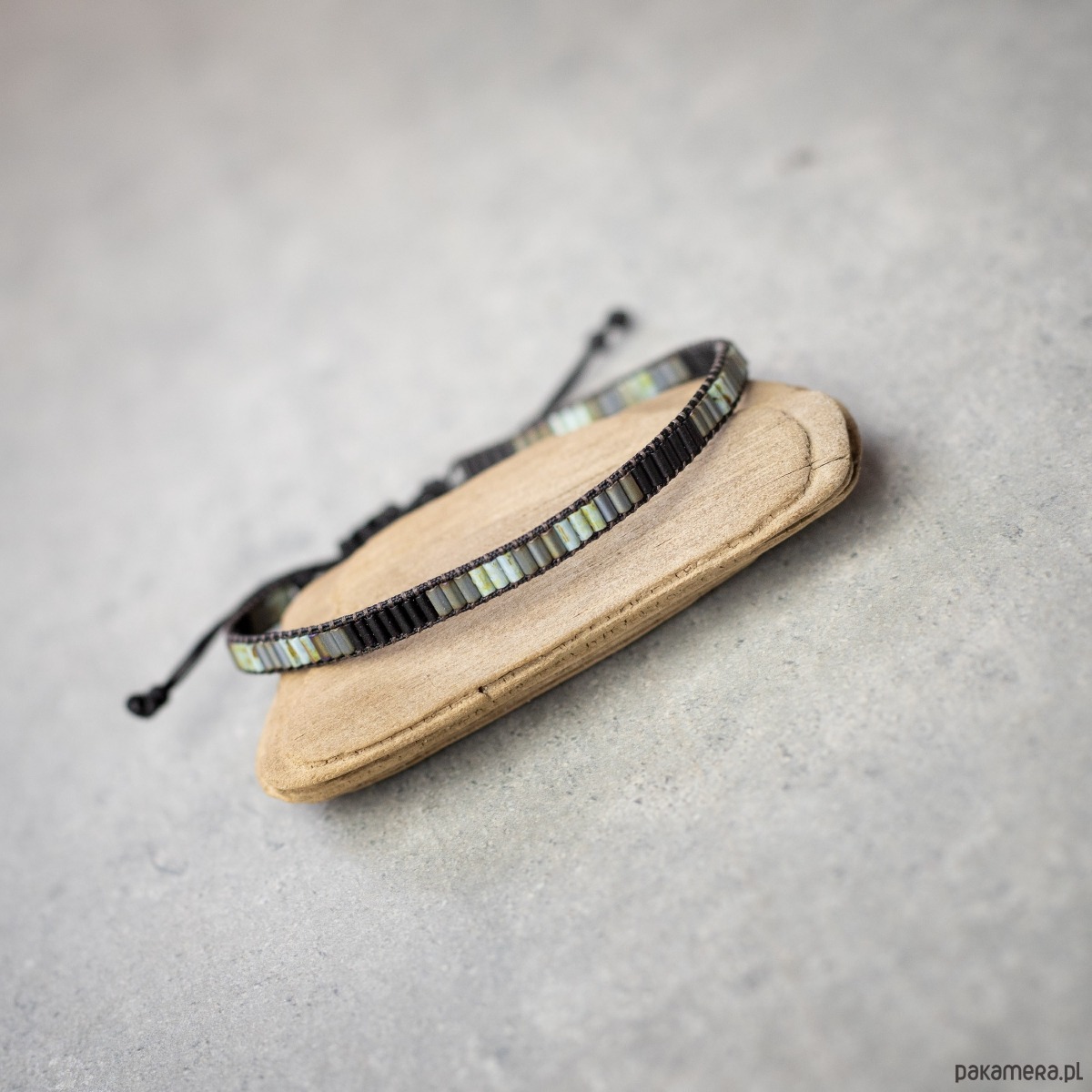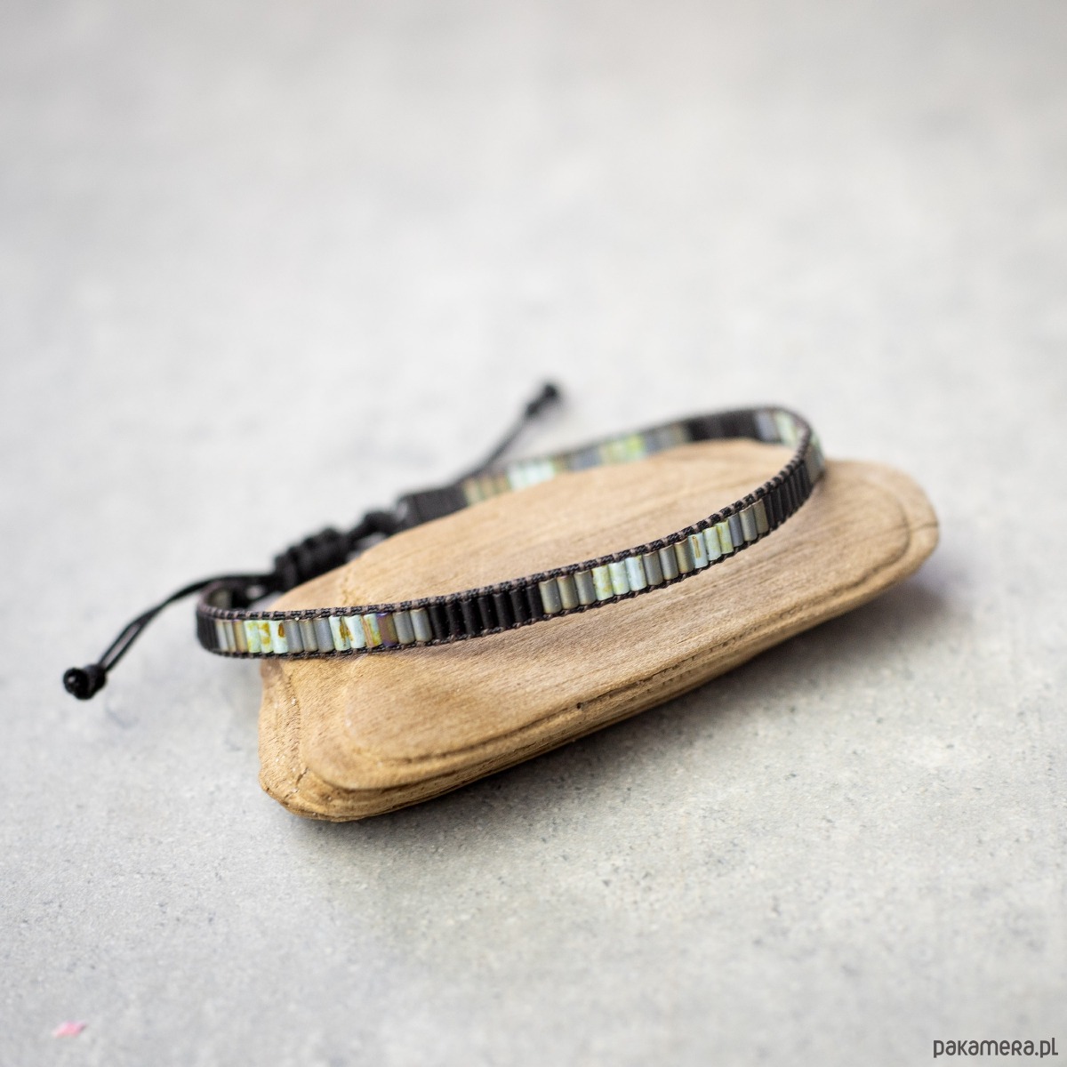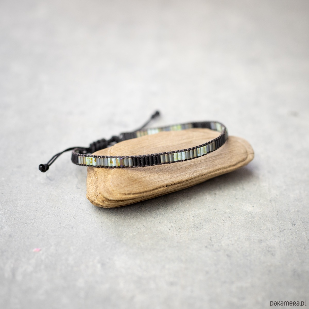 Bransoletka wykonana z koralików szklanych Toho oraz Miyuki, nici i sznurka nylonowego. Kolory: czarny, szary, szarozielony