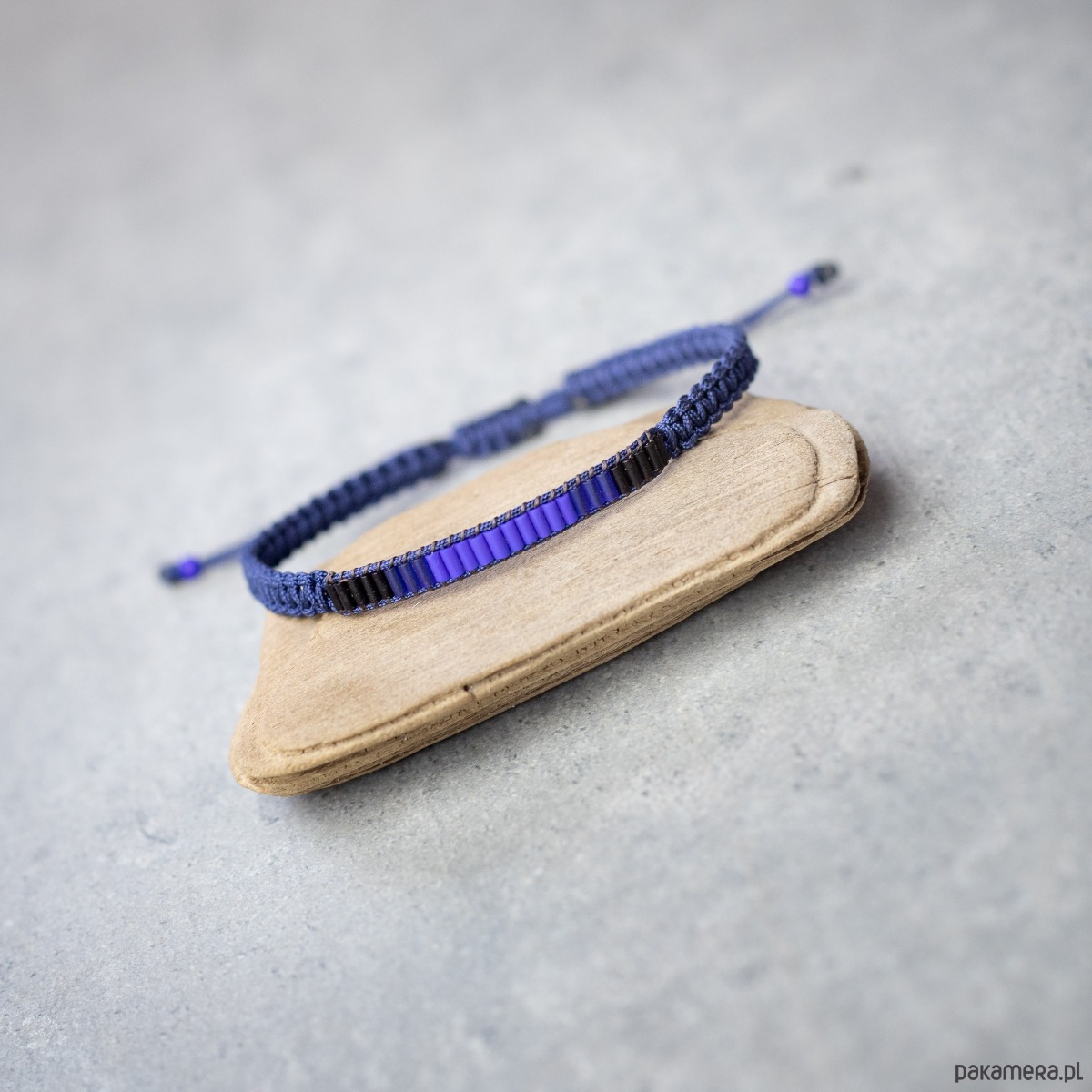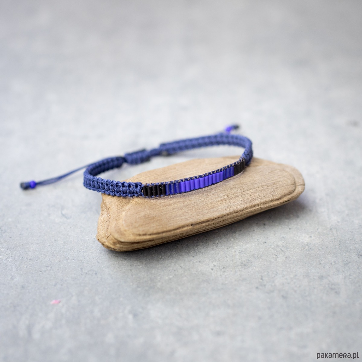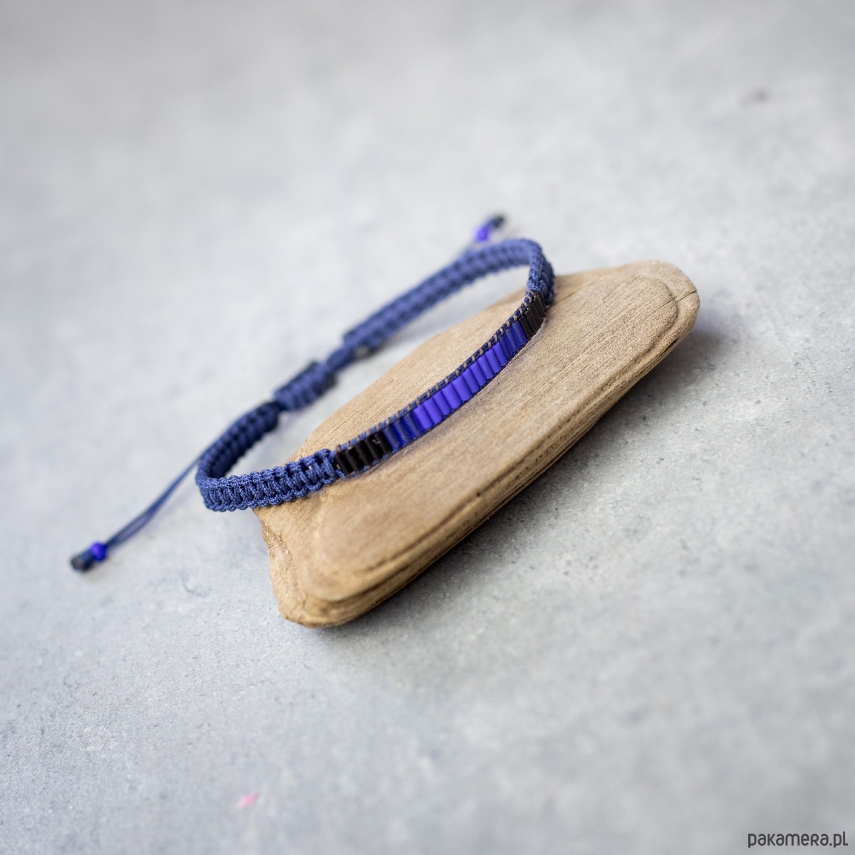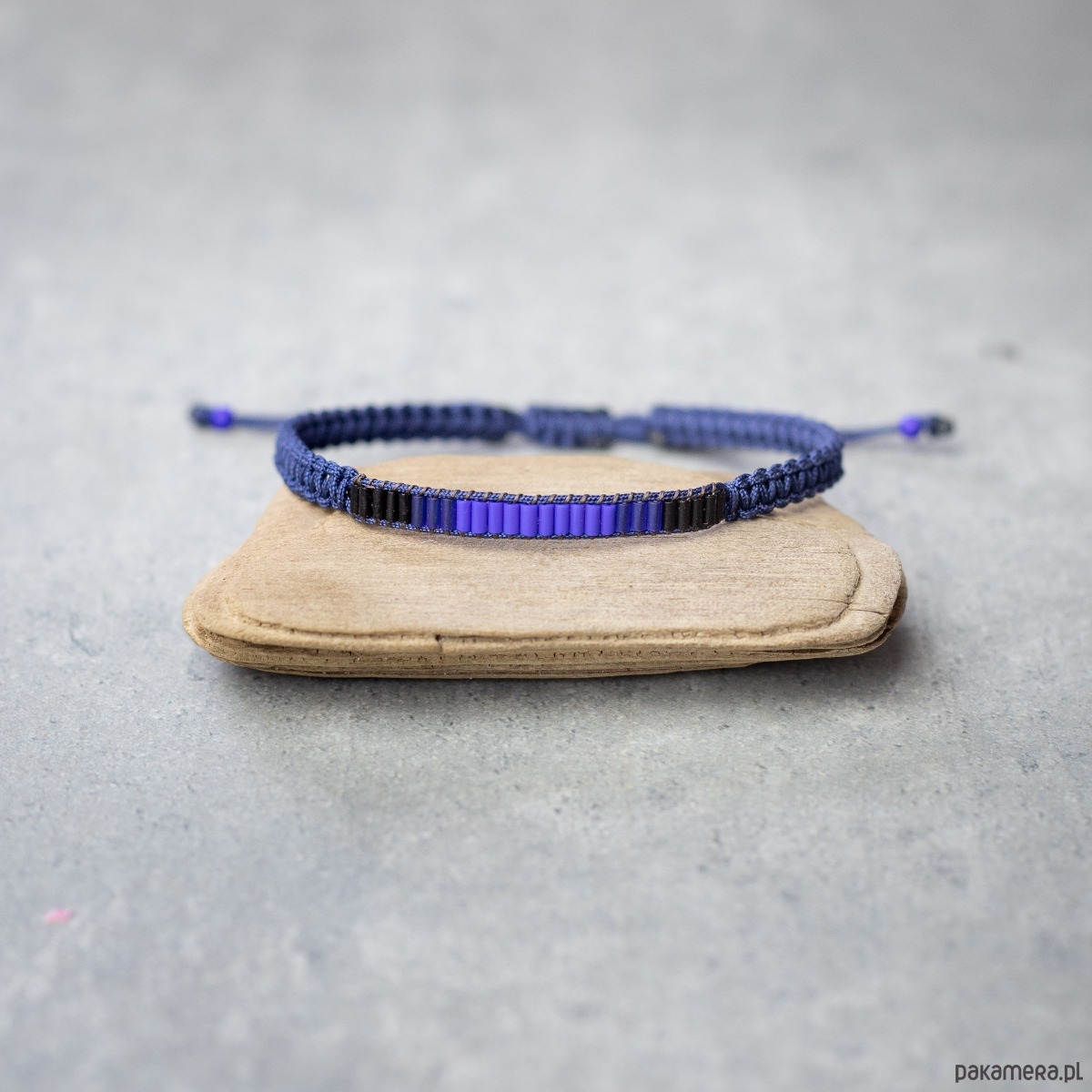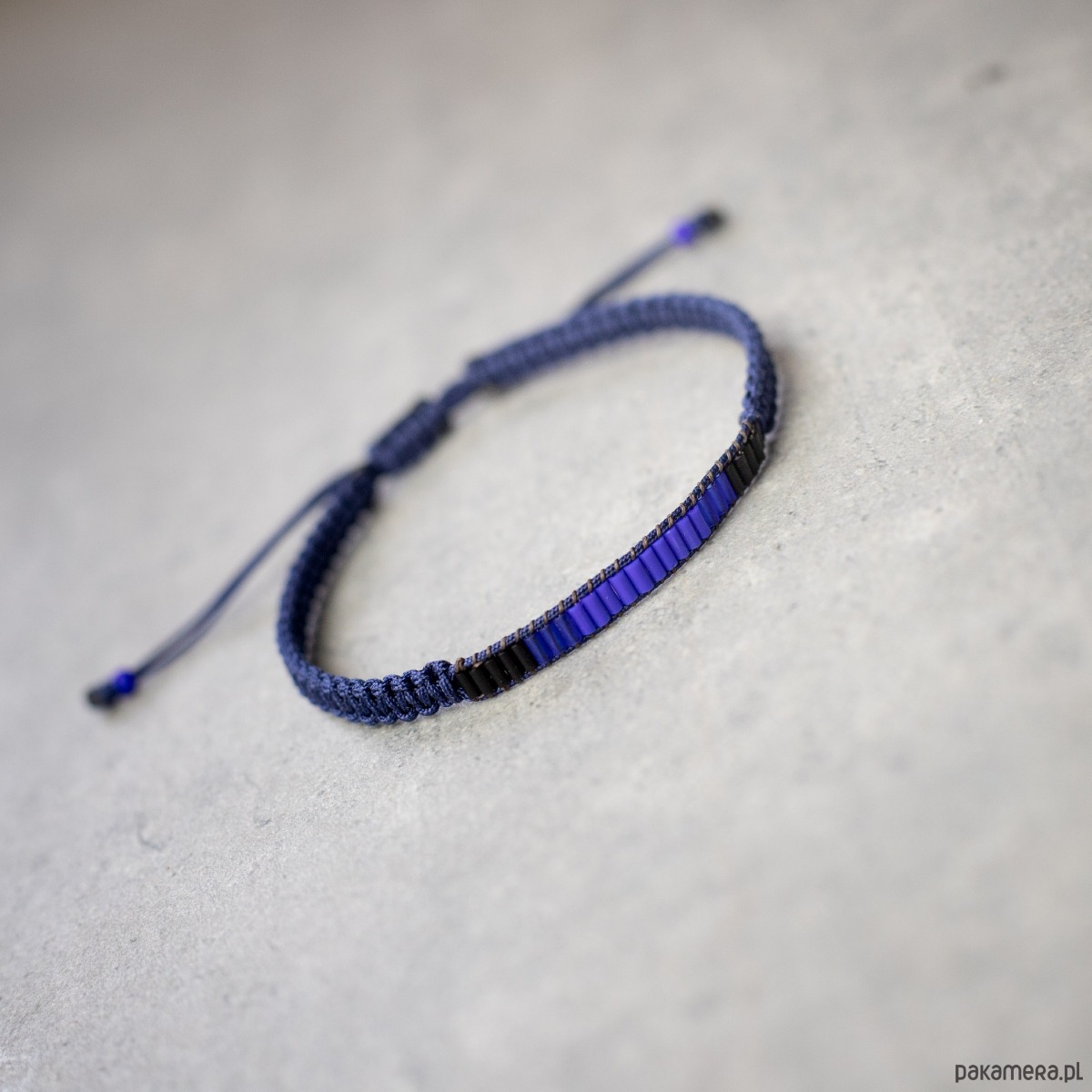 Bransoletka wykonana z koralików szklanych Toho oraz Miyuki, nici i sznurka nylonowego. Kolory: granatowy i czarny