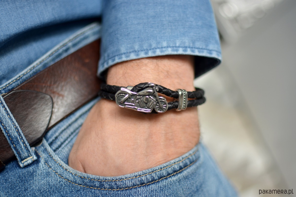 Męska bransoletka wykonana z okrągłego i plecionego rzemienia skórzanego o średnicy 5mm w kolorze czarnym. Zapinana jest za pomocą ozdobnej klamry ze stali szlachetnej w postaci motocykla.