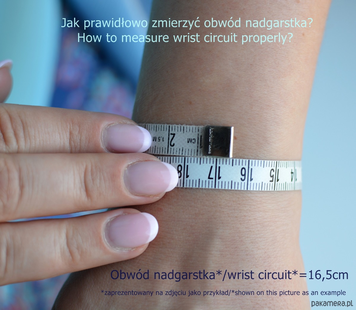 Jeżeli nie posiada się miarki, można wziąć np. sznurek, nitkę, sznurówkę i obwinąć ciasno wokół nadgarstka, a potem przyłożyć ją do linijki i odczytać długość. Proszę pamiętać, żeby niczego do pomiaru nie dodawać. Proszę nie sugerować się długościami innych bransoletek.