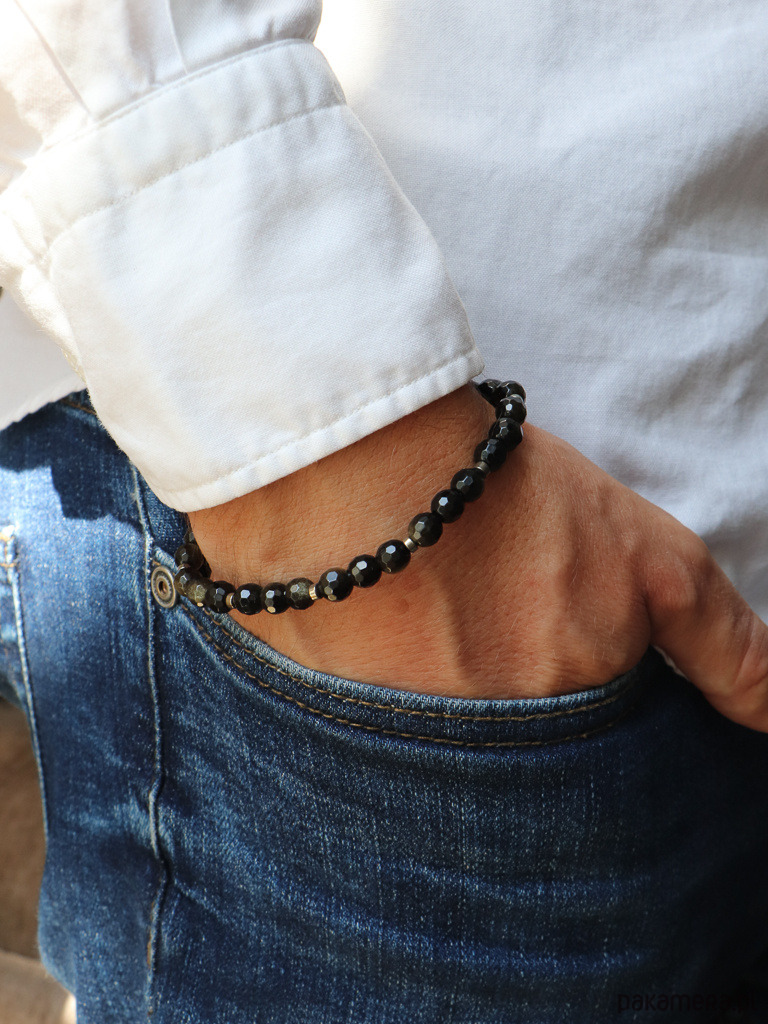W bransoletce fasetowane kulki obsydianu (ok. 6 mm) o głębokim, czarnym kolorze z delikatną, zielono-brązową łuną przeplatają się z lśniącymi, ciemnozłotymi dyskami hematytu (ok. 3 x 2 mm). Połączenie to tworzy dynamiczny i wyrazisty styl.