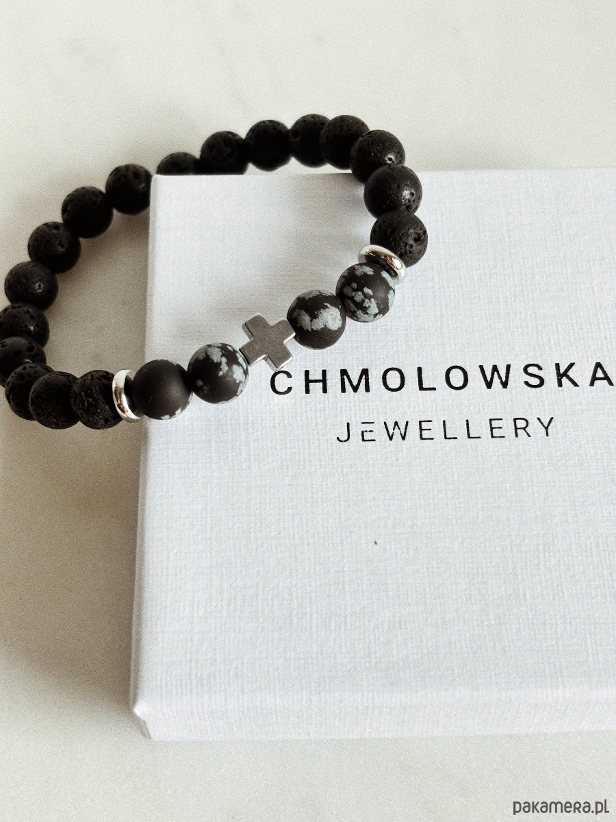 Bransoletka wykonana jest na gumce jubilerskiej z użyciem kamieni lawy wulkanicznej i obsydianu śnieżnego oraz metalowych przekładek w kolorze srebrnym.