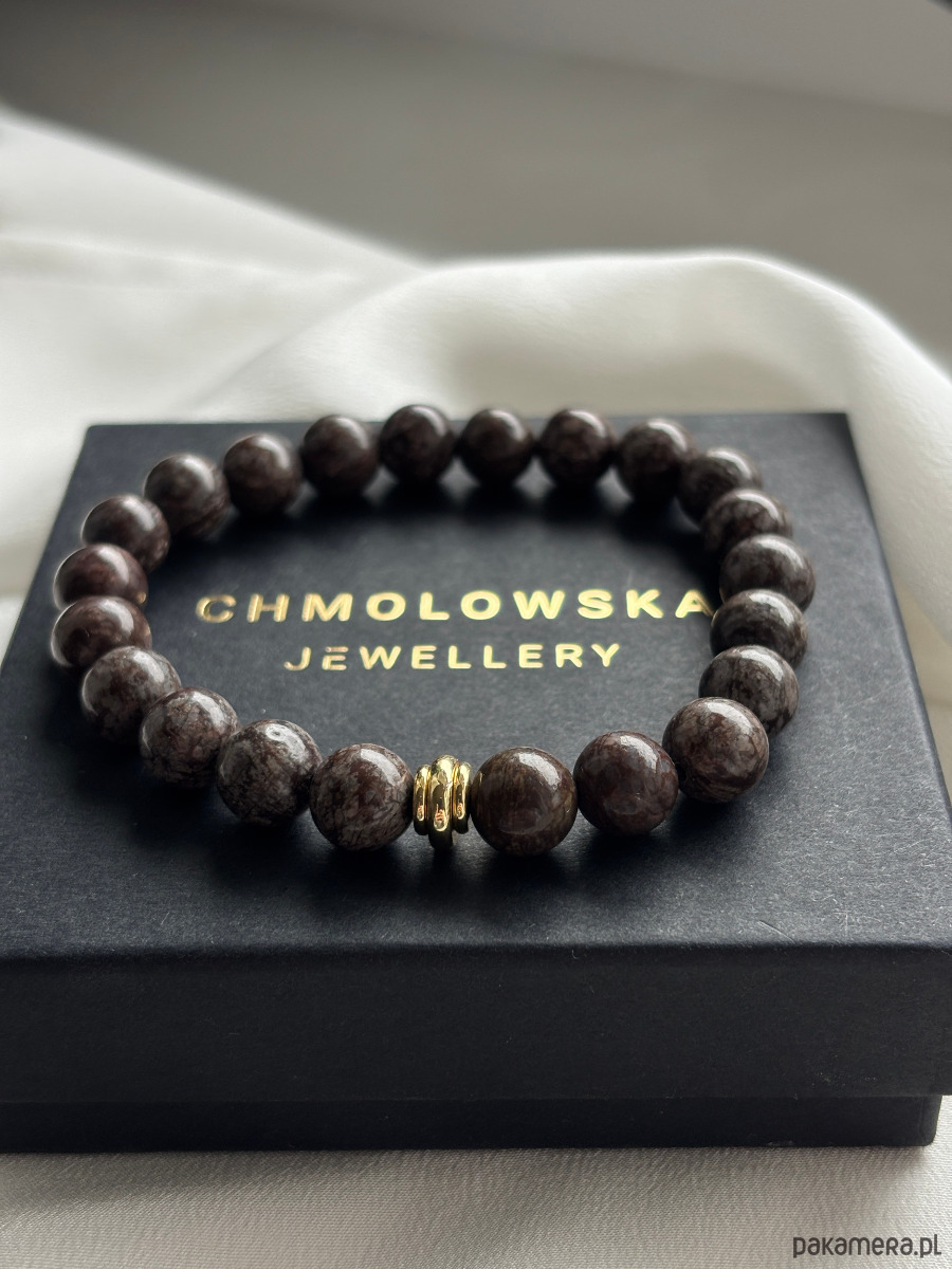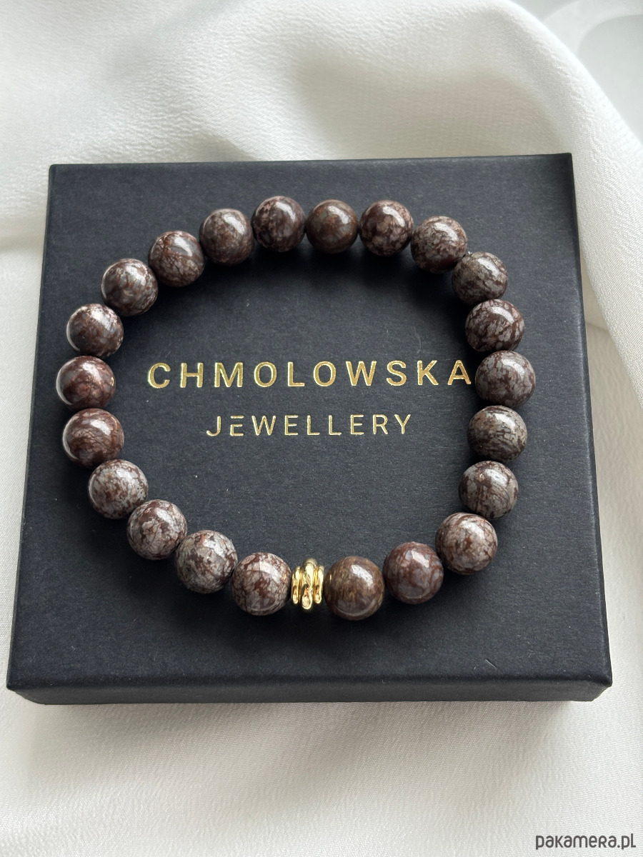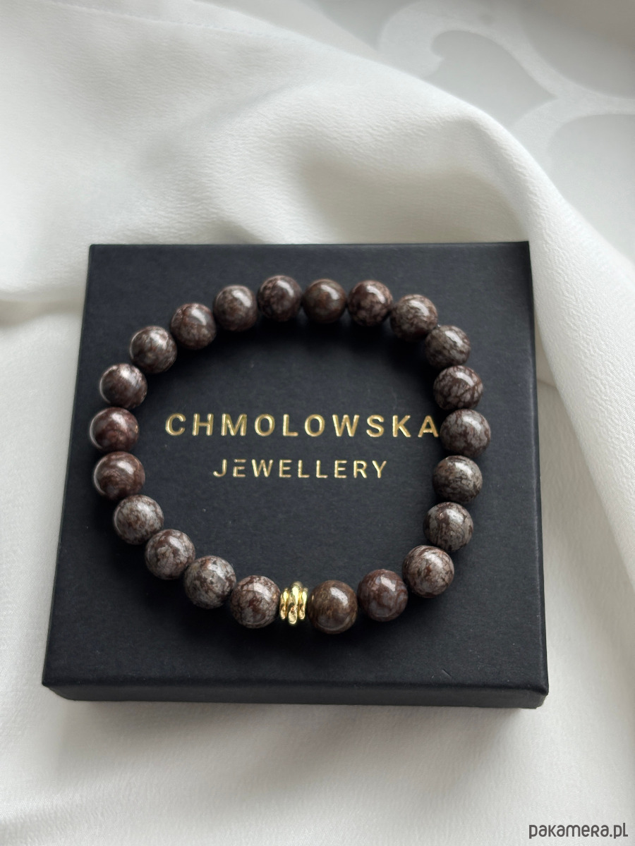 Bransoletka wykonana jest na gumce jubilerskiej z użyciem kamieni obsydian śnieżny brązowy i pozłacanych przekładek.