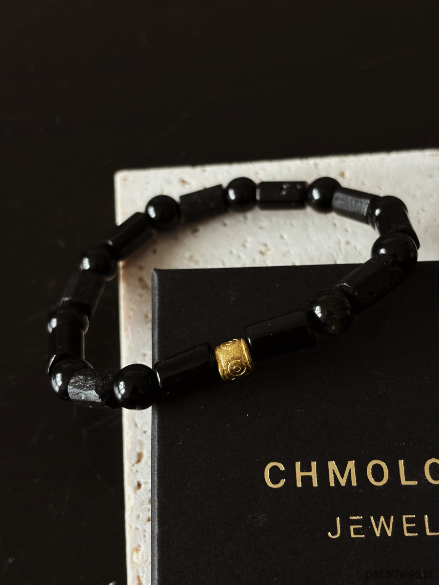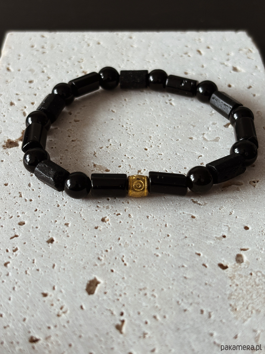 Bransoletka wykonana jest na gumce jubilerskiej z kamieni Turmalinu i Onyksu, całość dopełnia pozłacana przekładka.